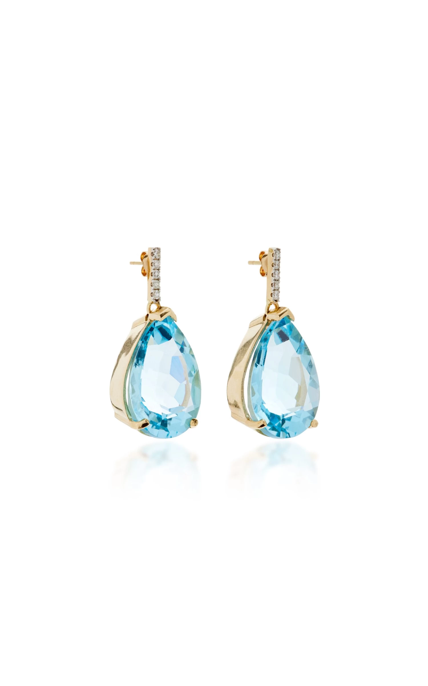 Bold cuts of tear drop Swiss blue topaz weighing over 79 carats is set in gold and draped from a diamond bar. Classic, beautiful and timeless, these drop earrings will be your instant favorite.