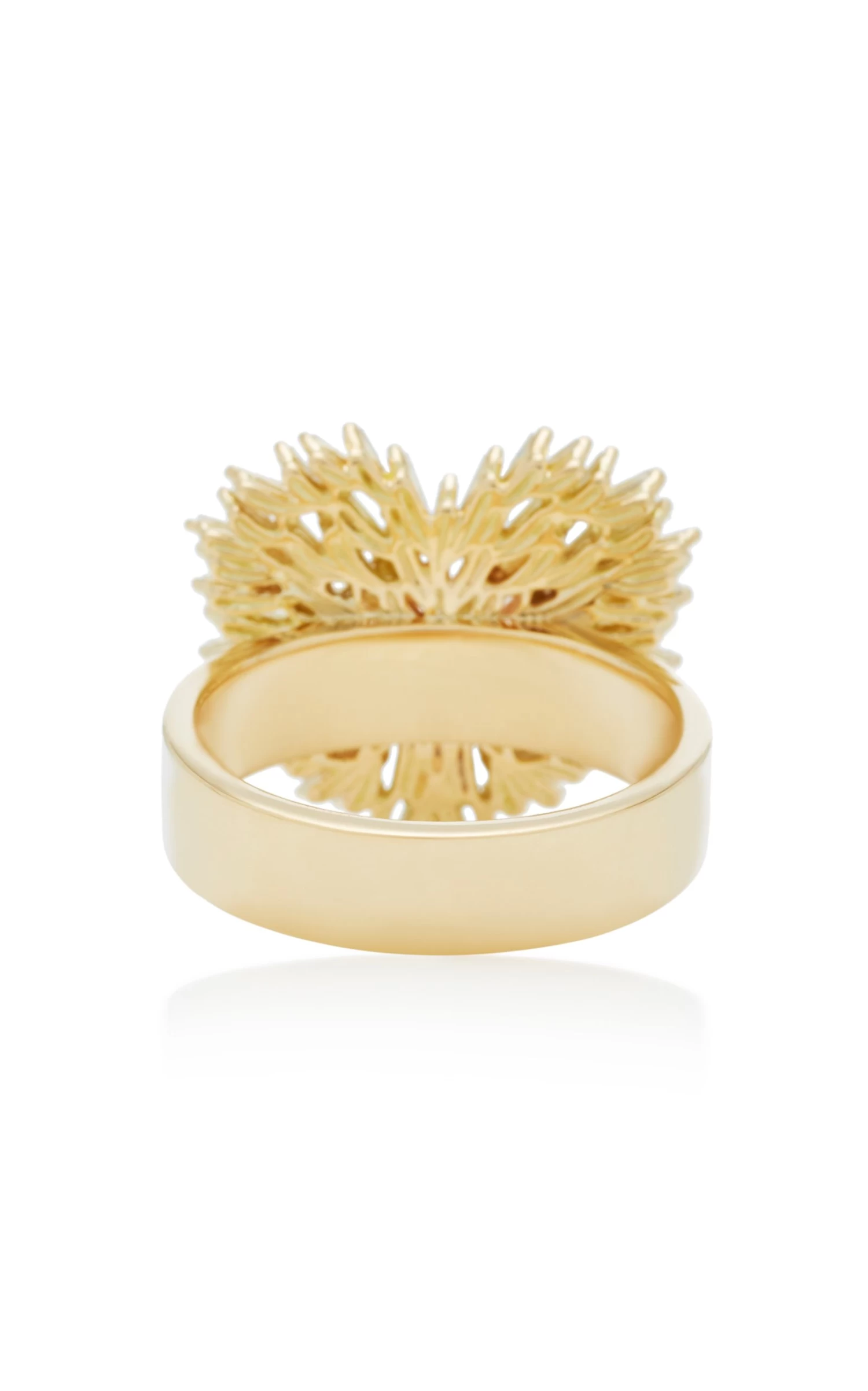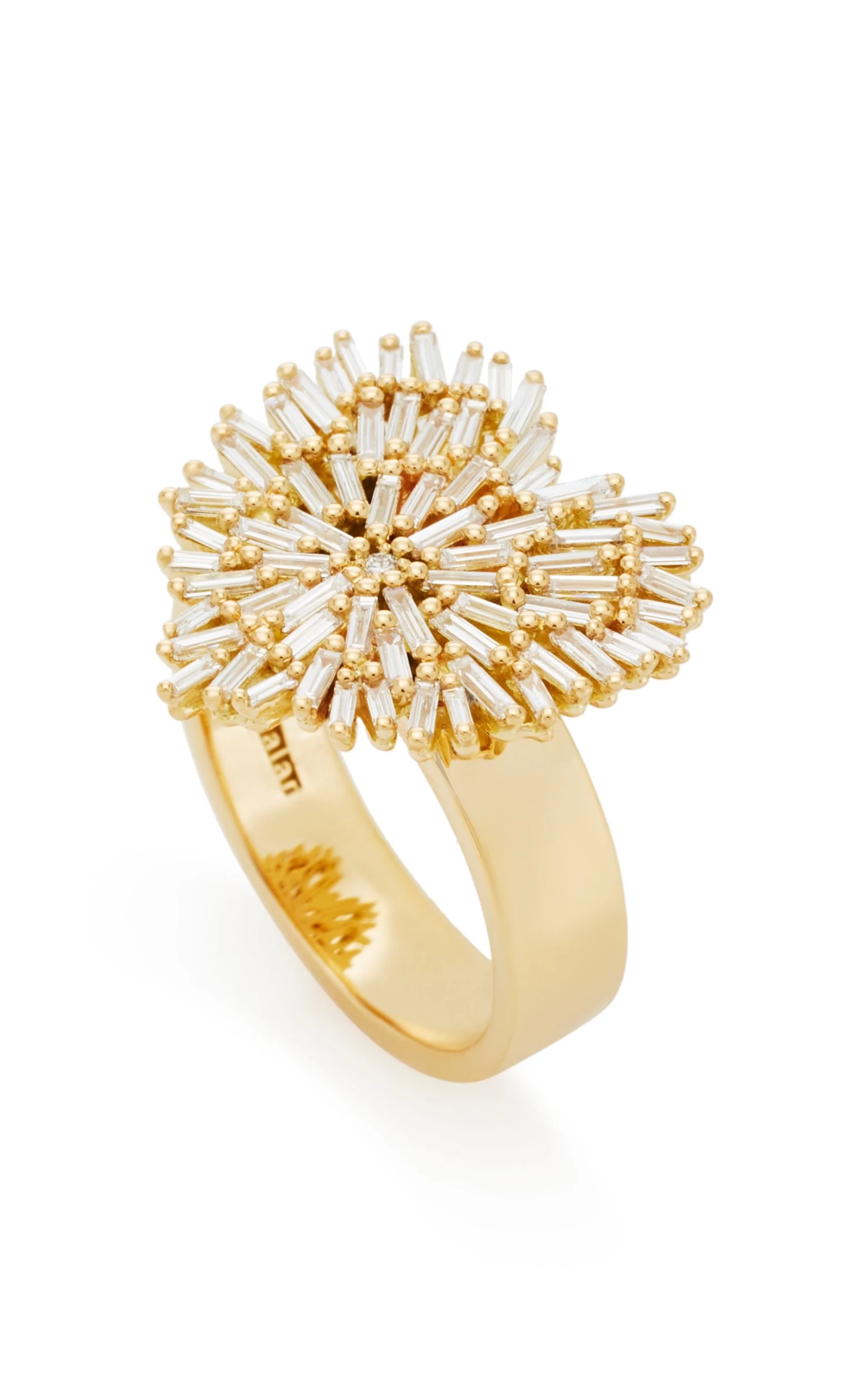 Cast from 18K yellow gold and adorned with white diamonds, Suzanne Kalan’s statement ring is designed into a heart-shaped silhouette that’ll easily adorn your fingers.