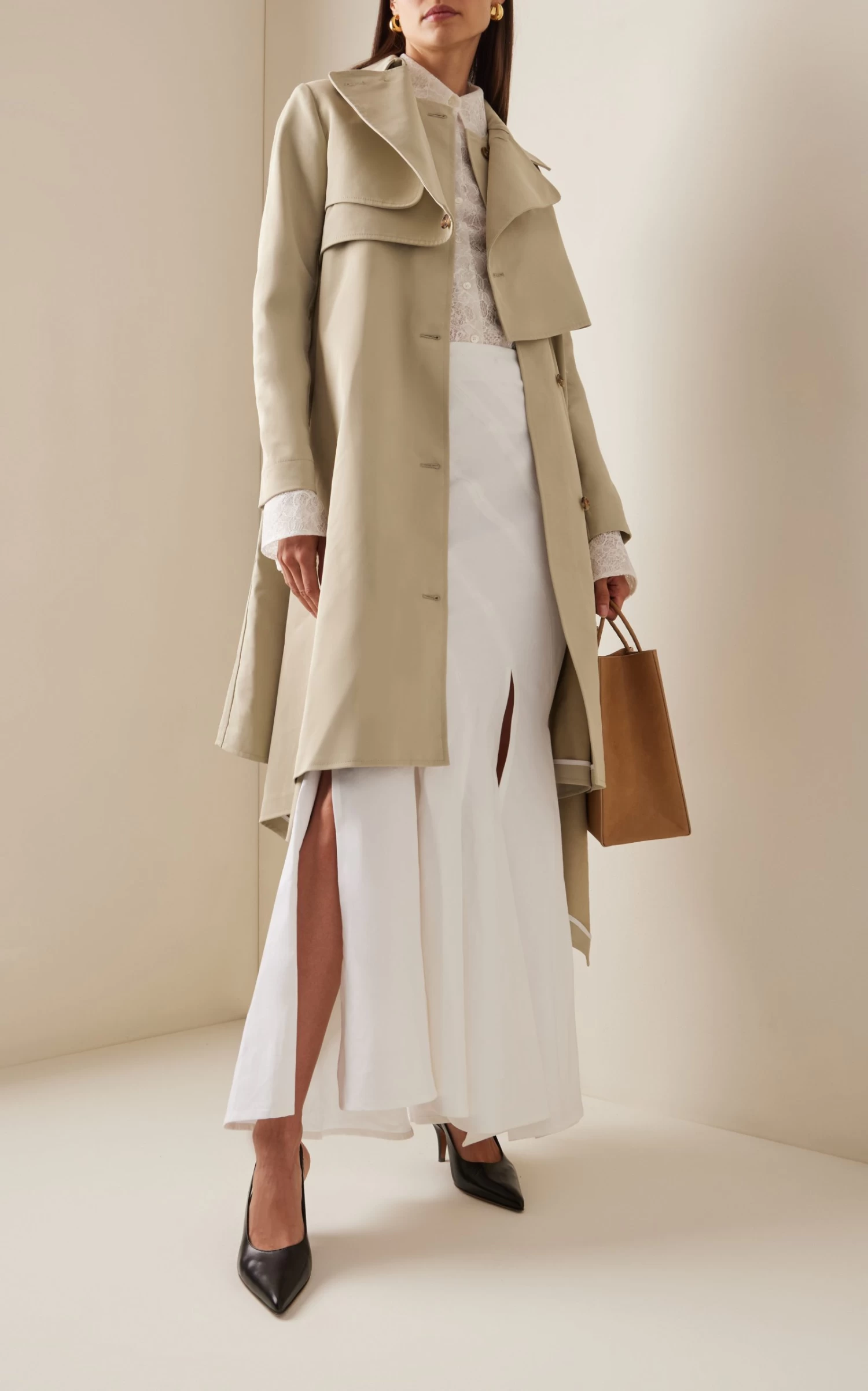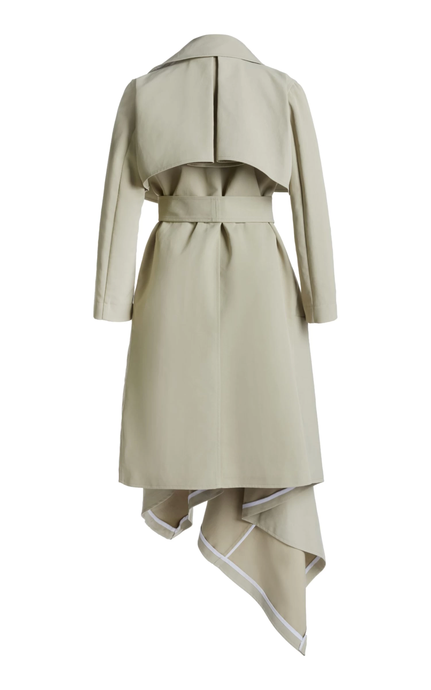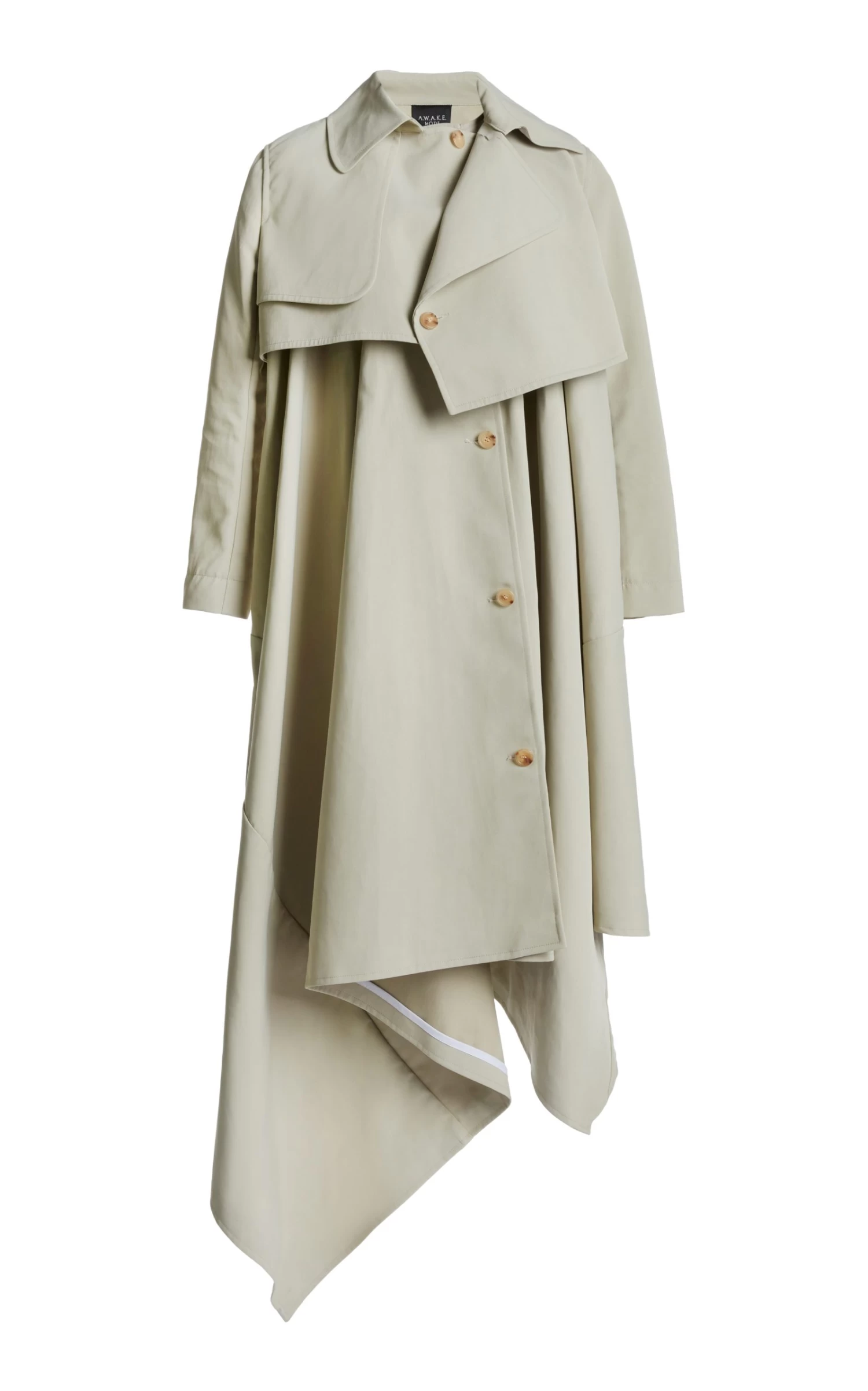 This coat features a trench coat placket and asymmetric silhouette that drapes into a midi-hem. Style with its self-tie belt to cinch the waist and accentuate an hour-glass figure.