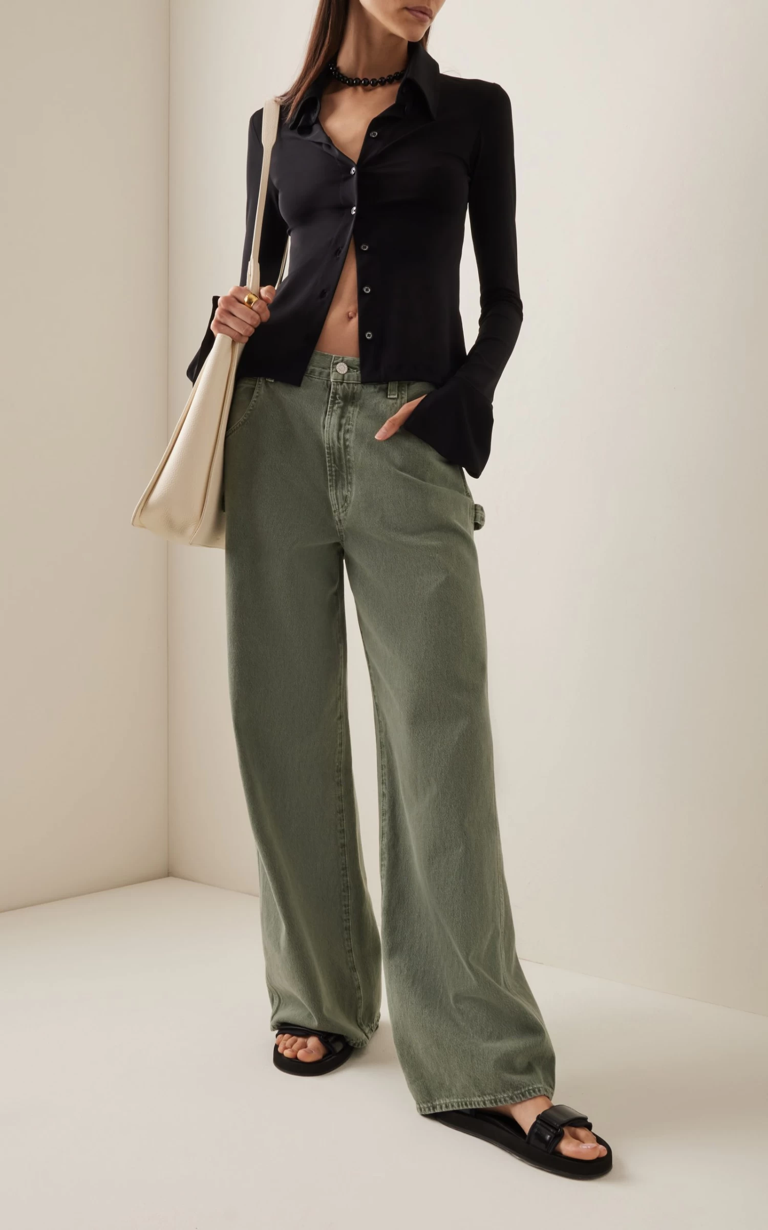 Made of organic cotton denim, these carpenter pants have a relaxed, wide-leg silhouette and low-rise waist. Style with a lightweight button-down and sandals for an easy day look.