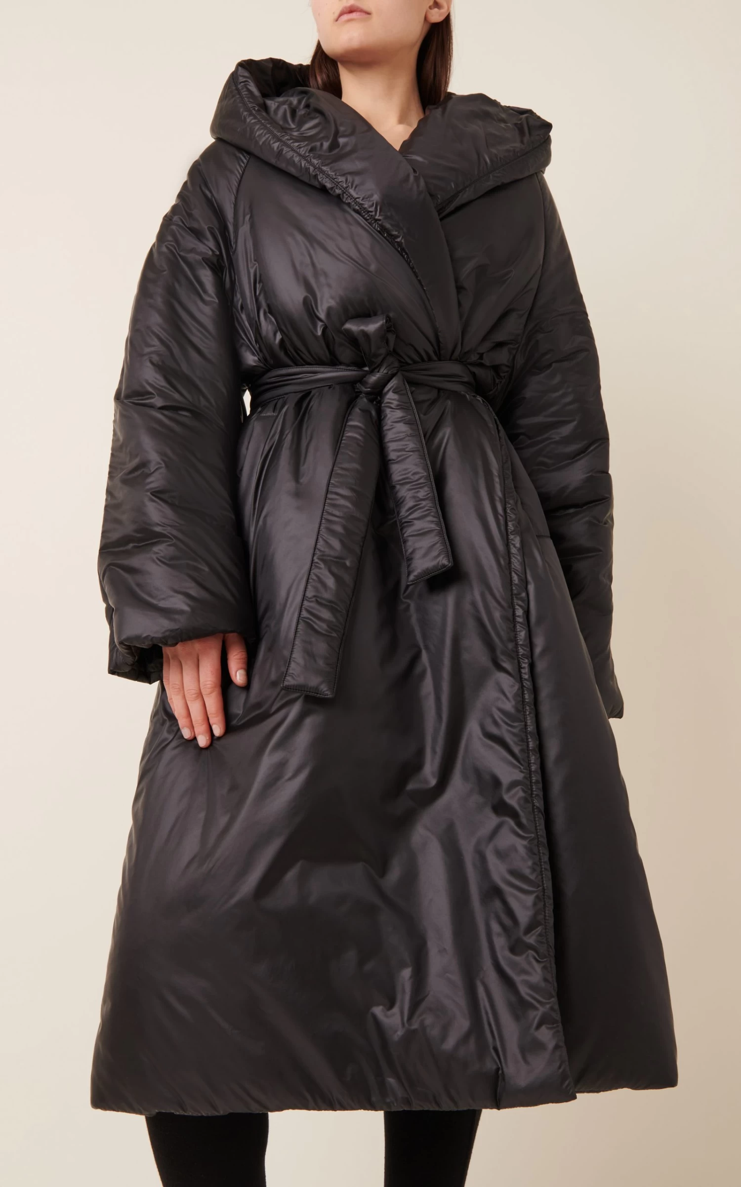 Designed for travel, this hooded coat has a generous fit made from puffy, padded nylon that feels like wearing a cloud. Use the belt to cinch your waist.