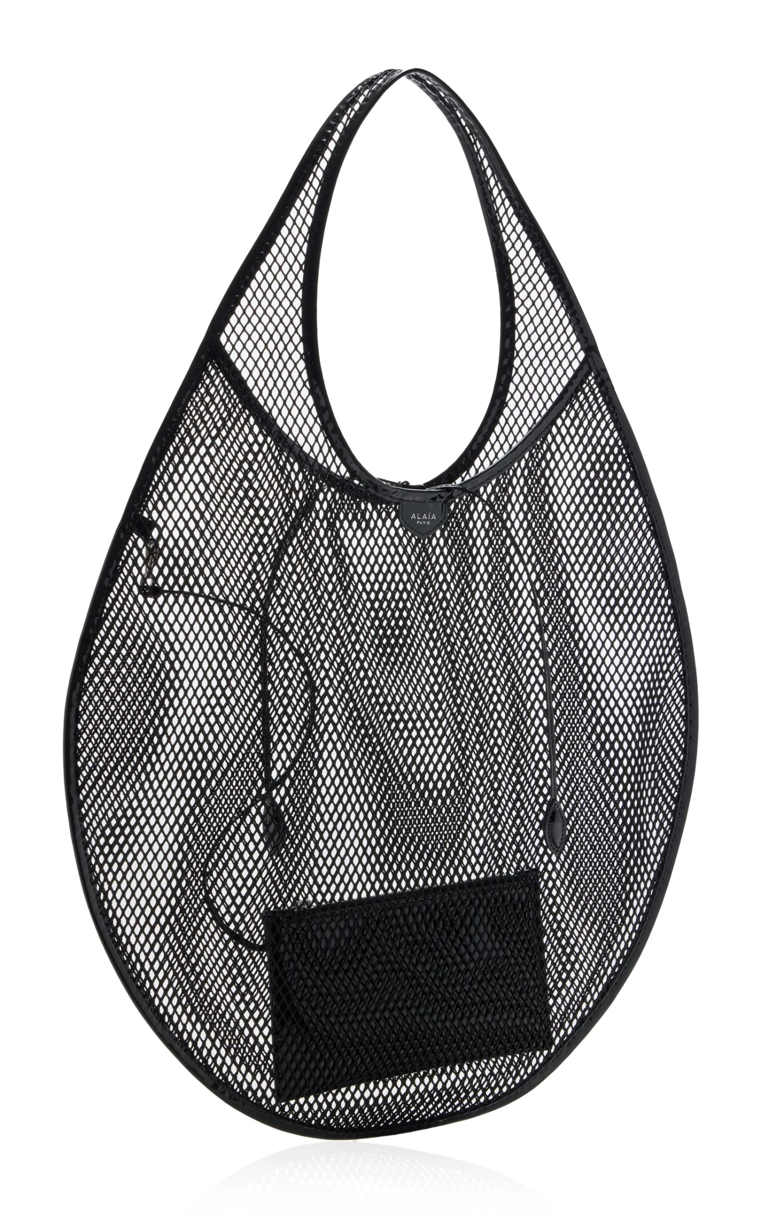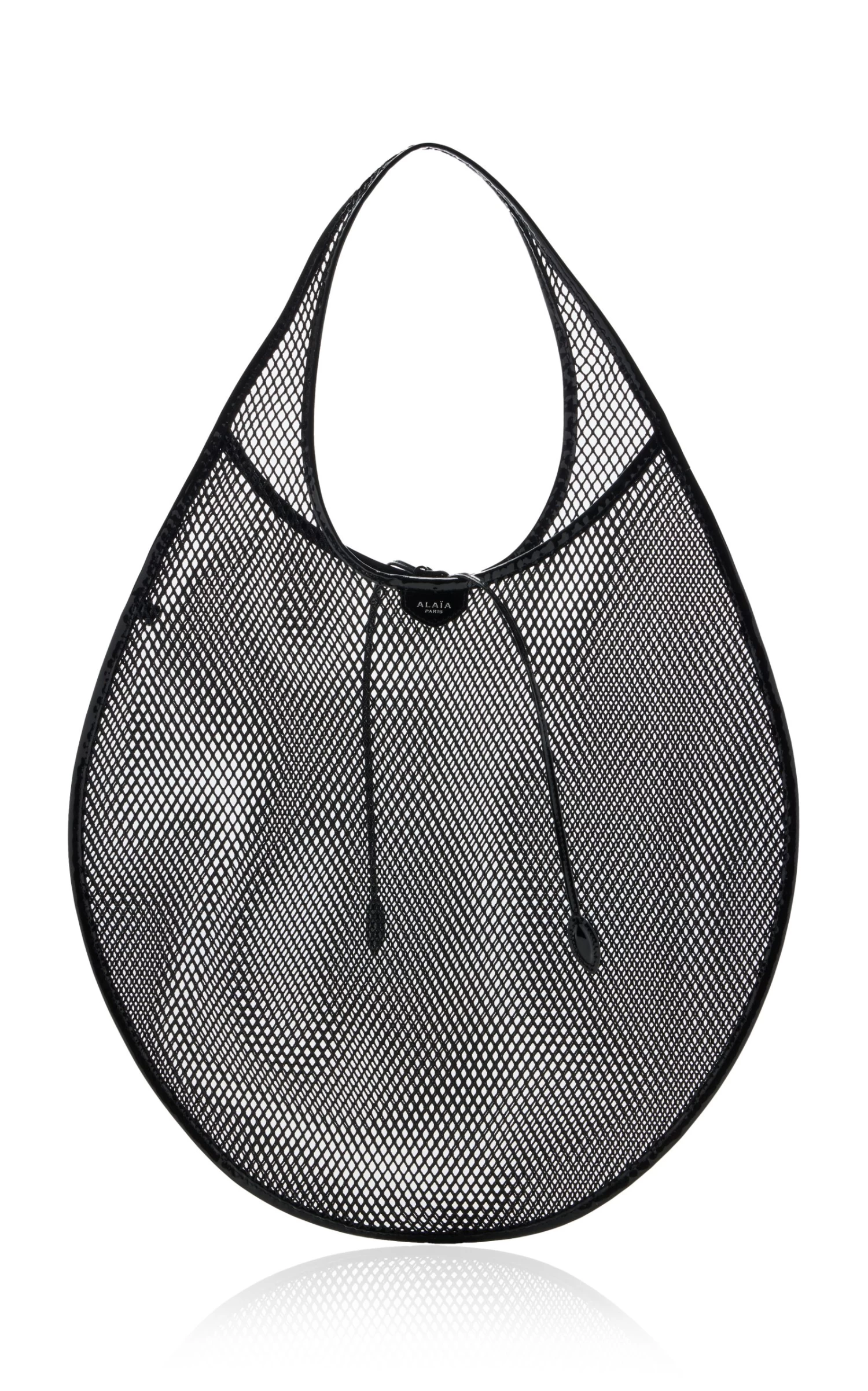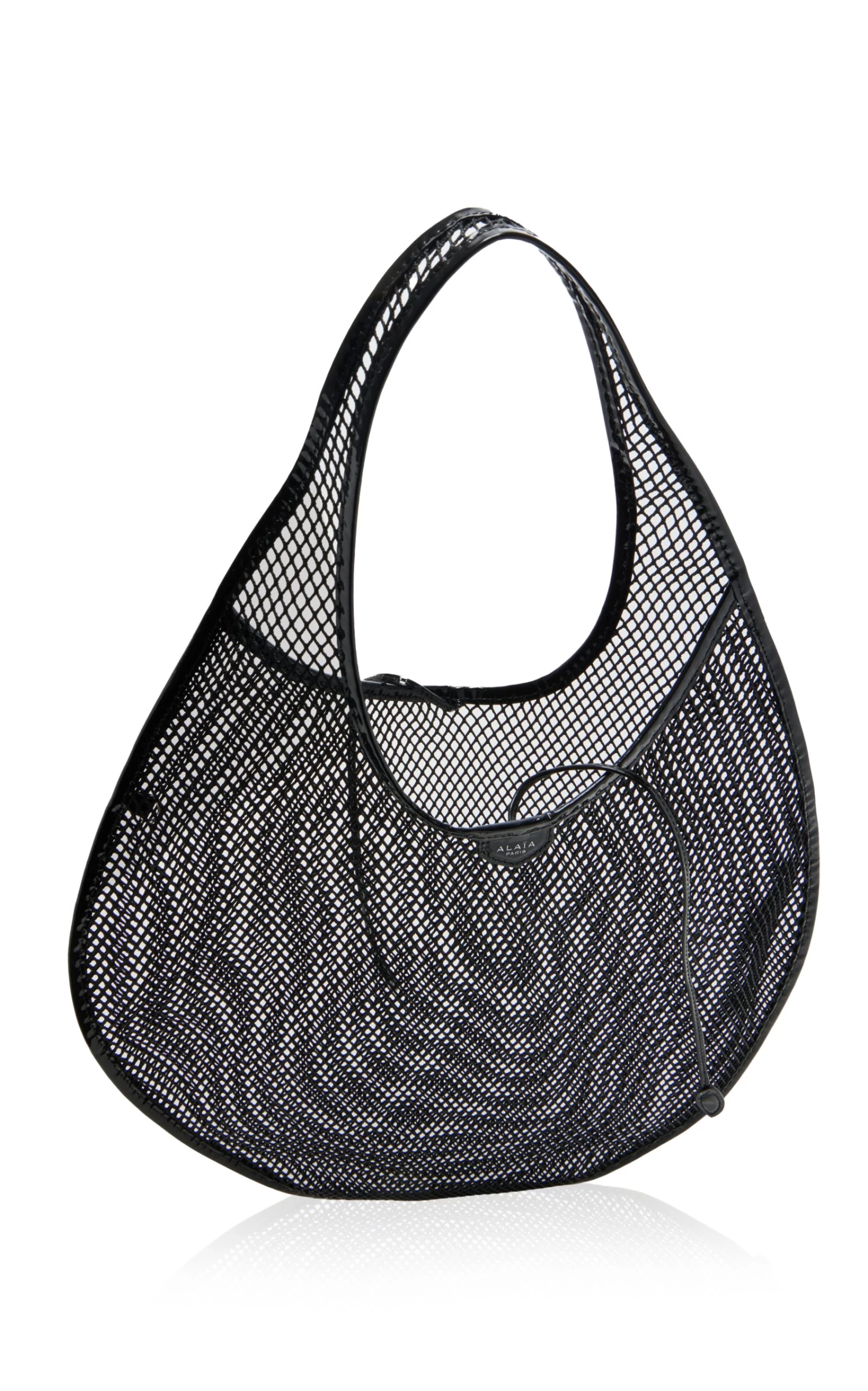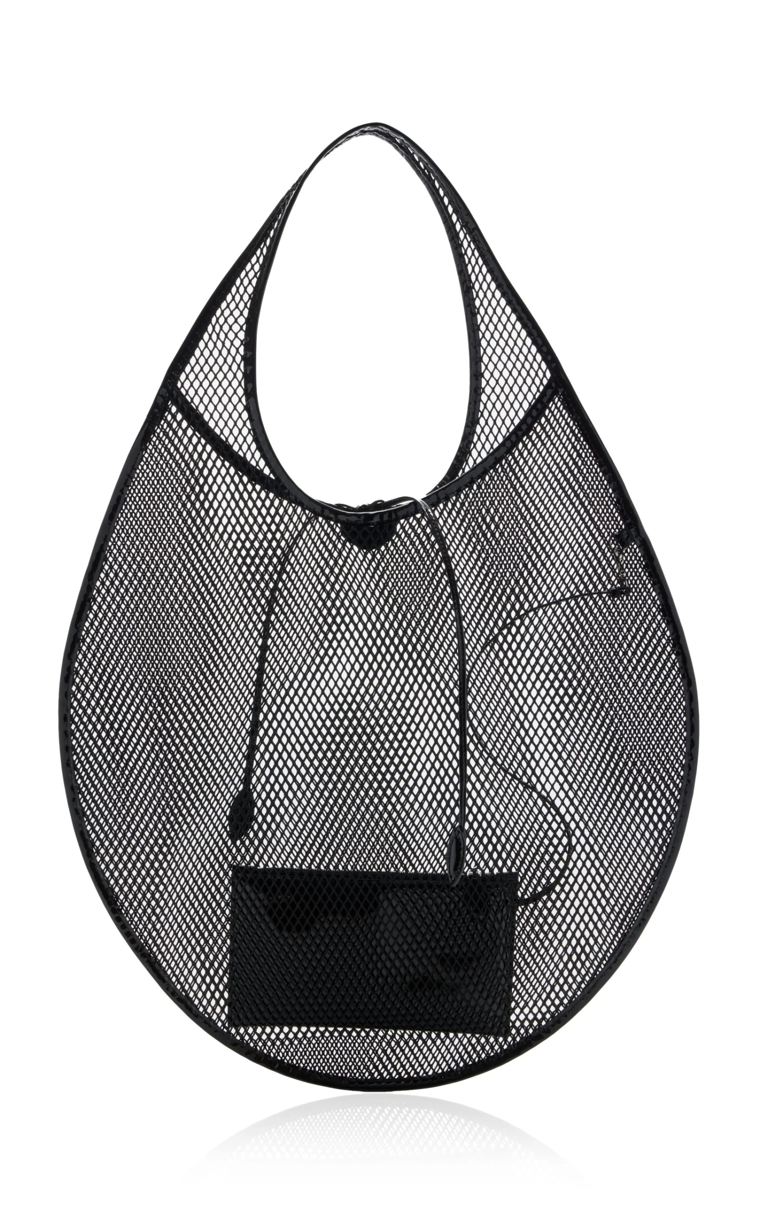 Made of laser-cut mesh, this tote has a semi-sheer body fashioned into a circular silhouette and trimmed with leather. Take yours to a day at the beach.