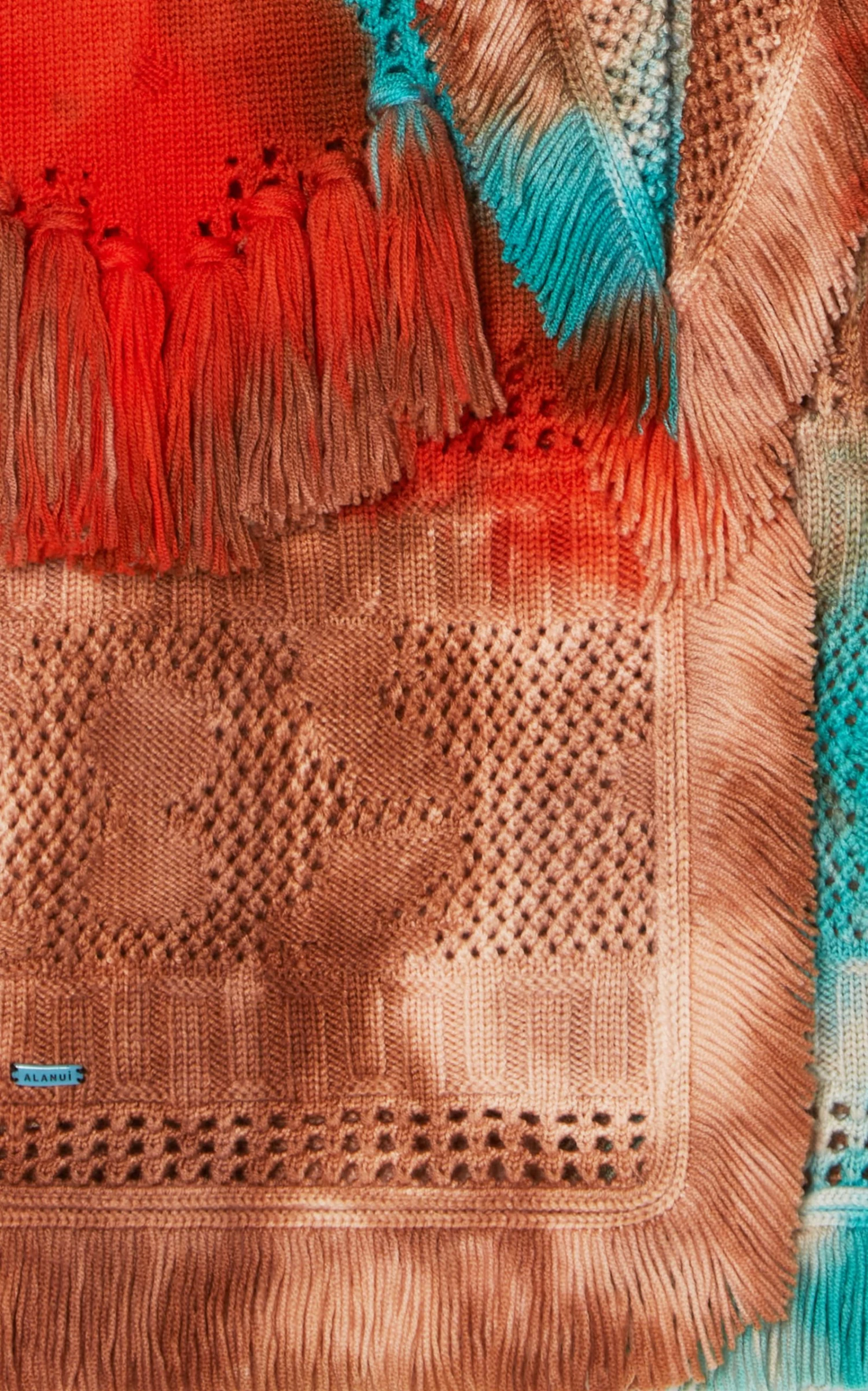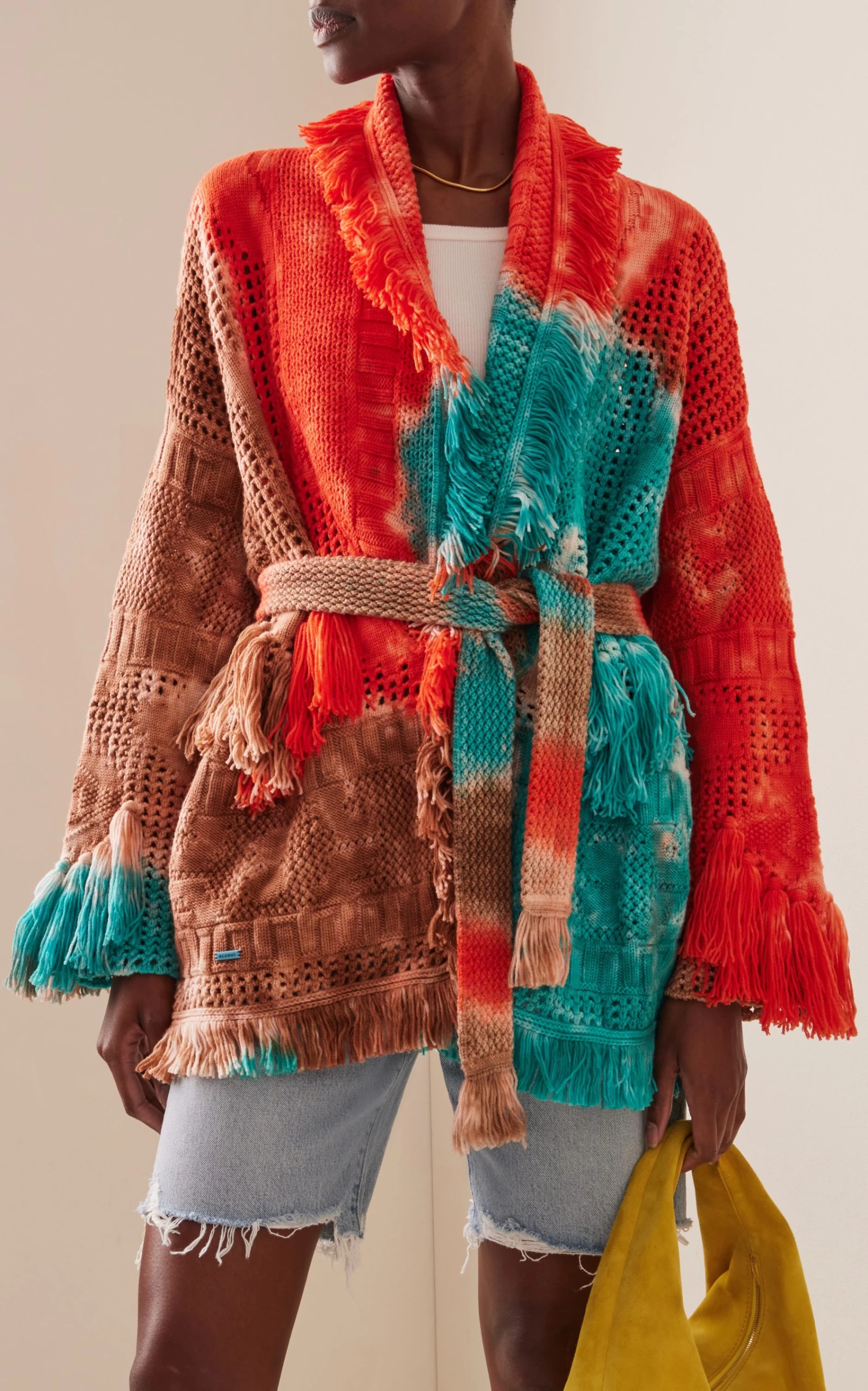 The ‘California Dreamin’ cardigan has a netted construction knit from tie-dyed wool with a signature fringed shawl collar. Wear it with or without the belt.