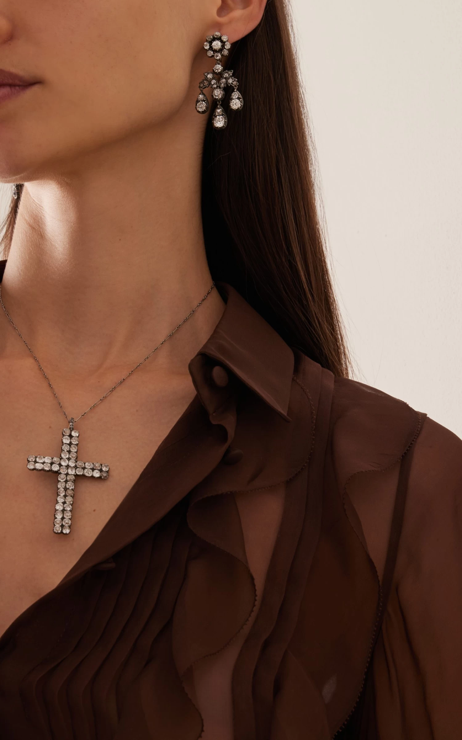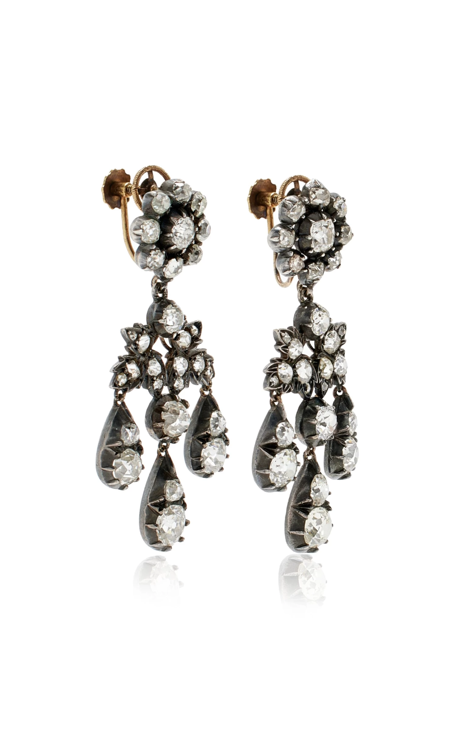 A pair of antique diamond girandole earrings, each circular cluster top suspending two leaves with tassel drops, mounted in silver and gold. English circa 1850