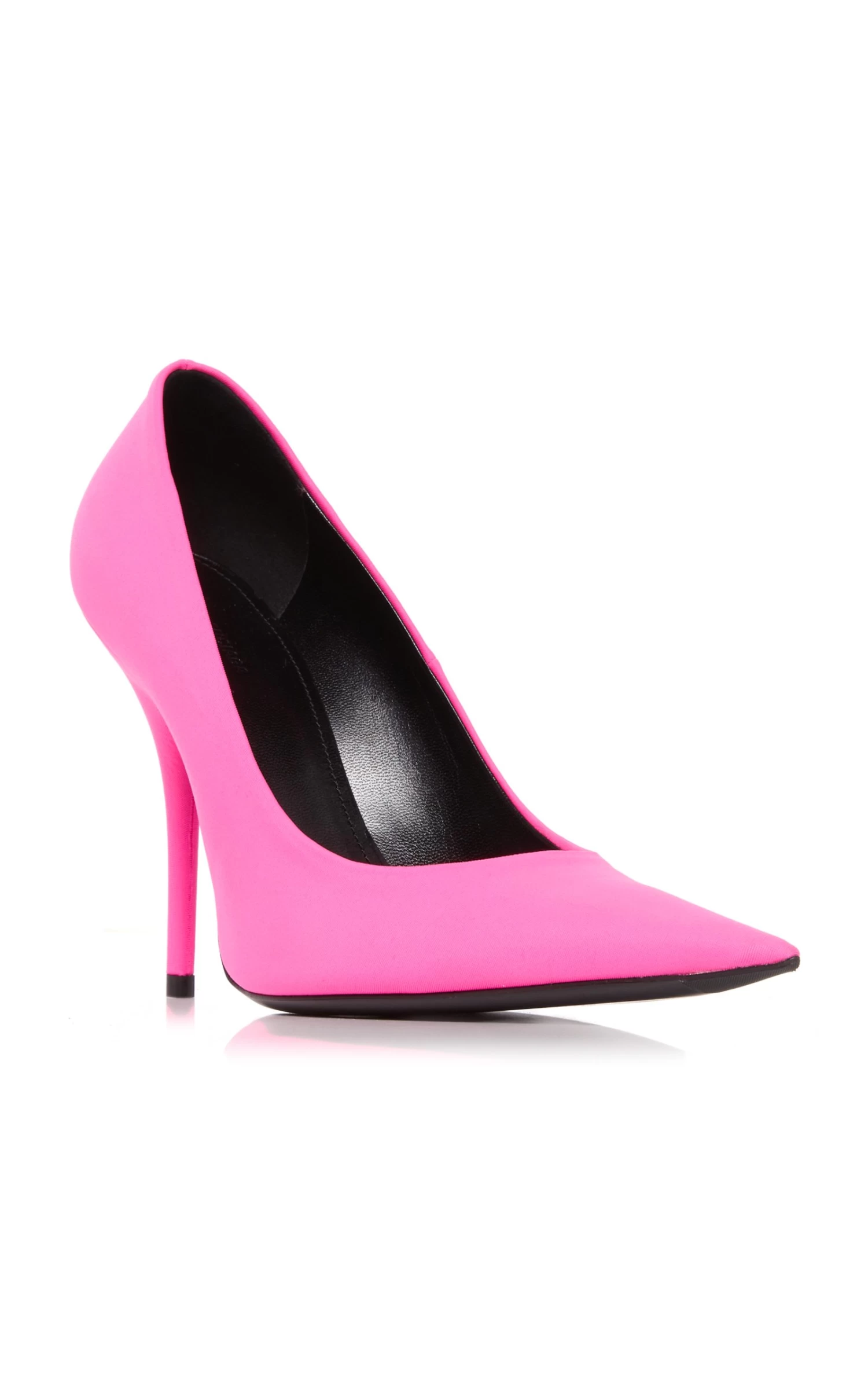 Designed to lengthen your legs, Balenciaga’s pumps have sharply pointed toes that resemble a knife. They’re made from leather covered with matte spandex jersey in a neon pink shade to add a pop of color to evening looks.