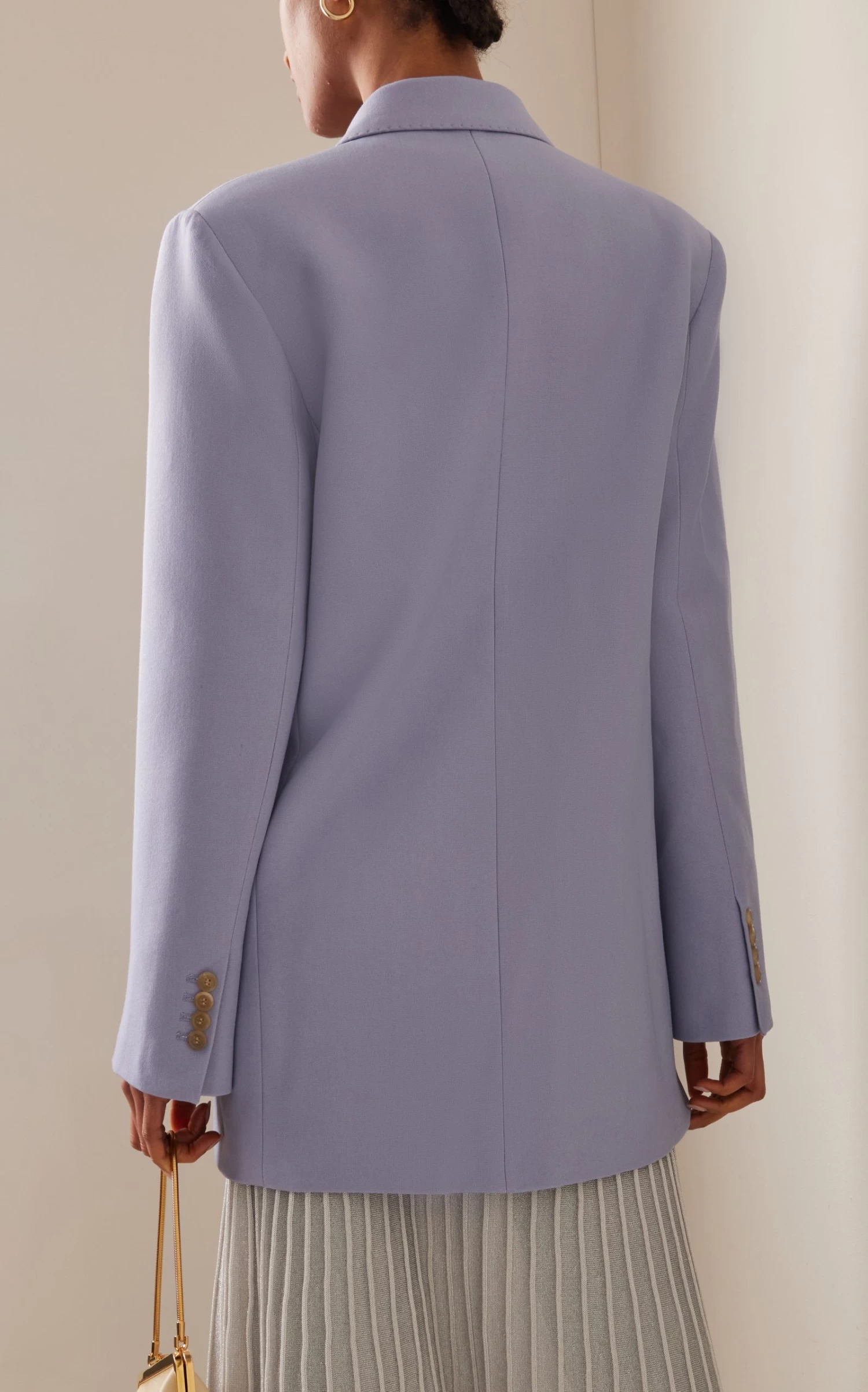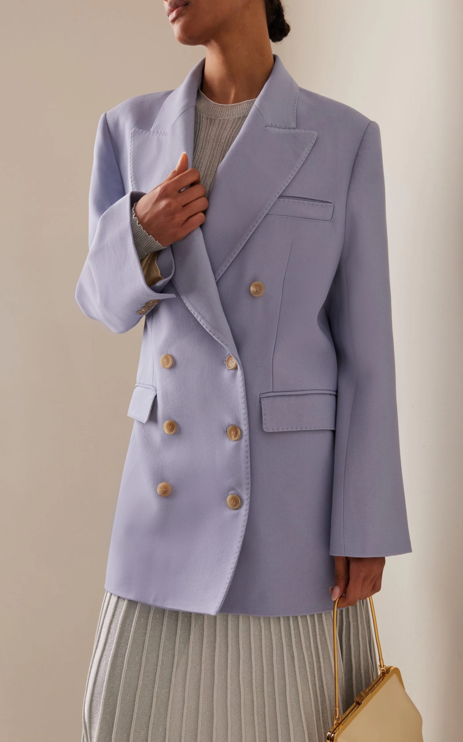Made of a wool blend, this relaxed double-breasted blazer features peaked lapels and flap pockets. Wear over a tee with high-waisted pants.