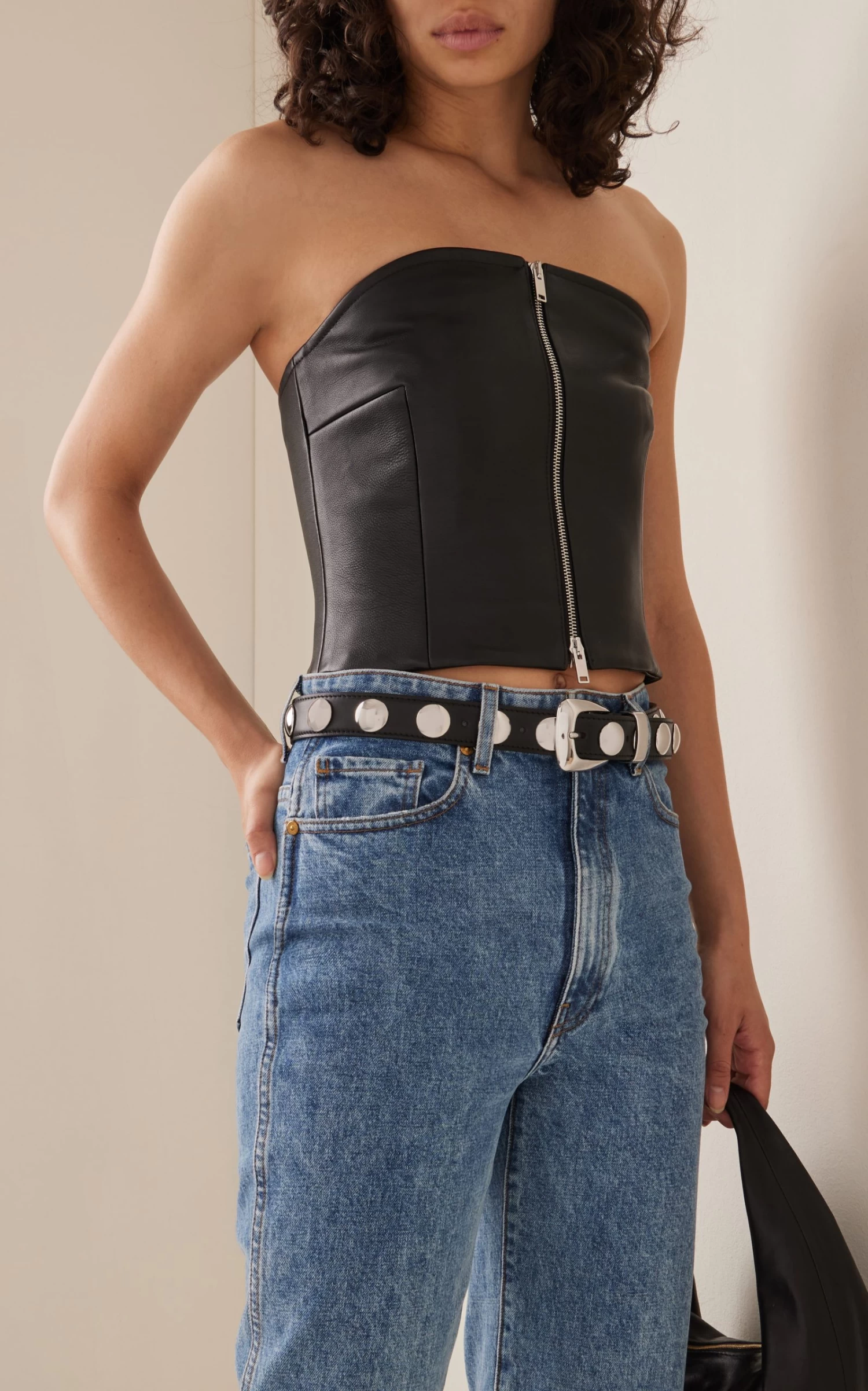 Crafted in Italy of lustrous calfskin with tonal topstitching, the ‘Benny’ is accented with gleaming, jewelry-like hardware: polished silver-toned discs paired with a brushed buckle, loop, and tip.