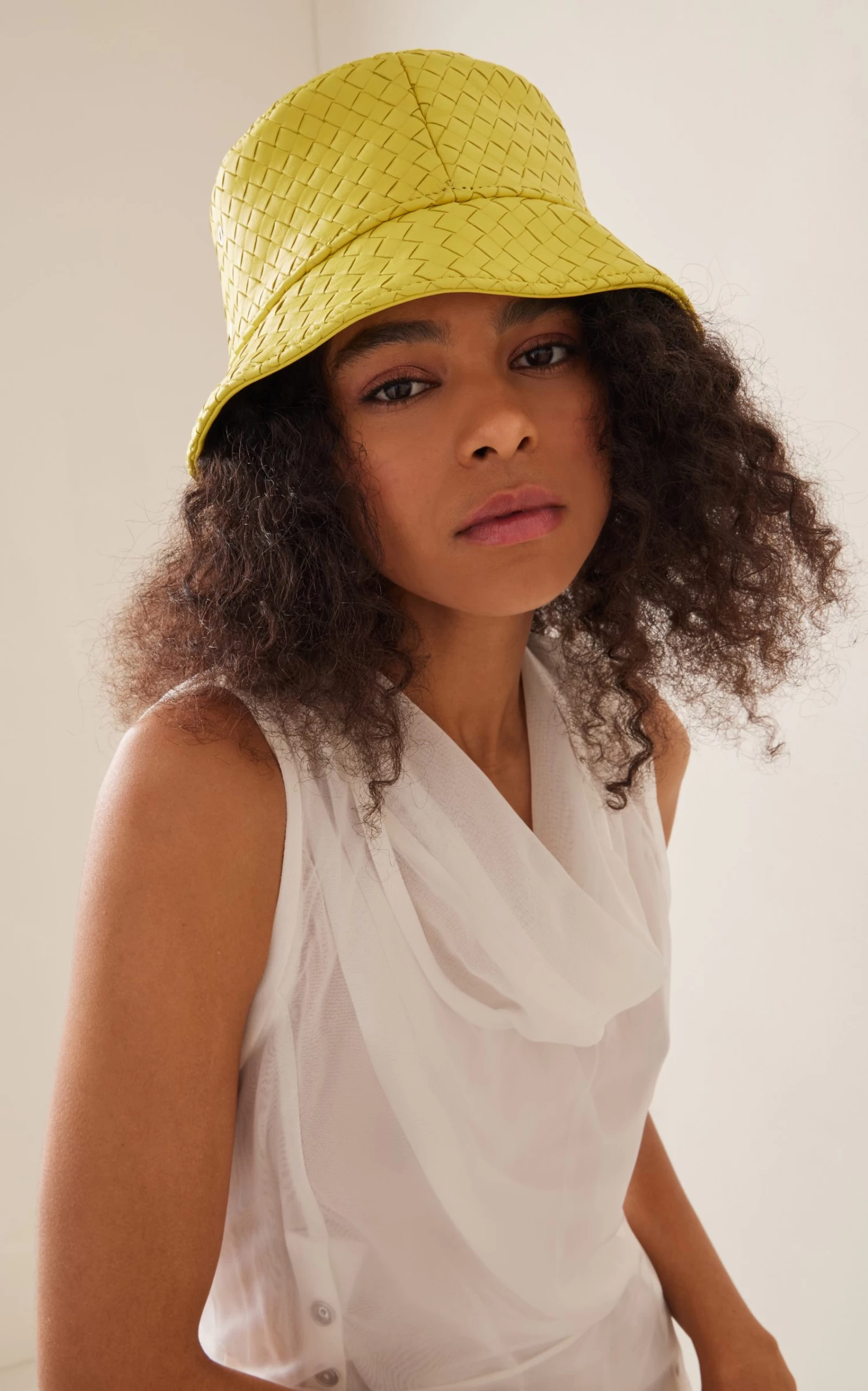 This bucket hat is made from nappa leather in the house’s signature intrecciato weave. Add slim shades for a retro look inspired by the 90s.