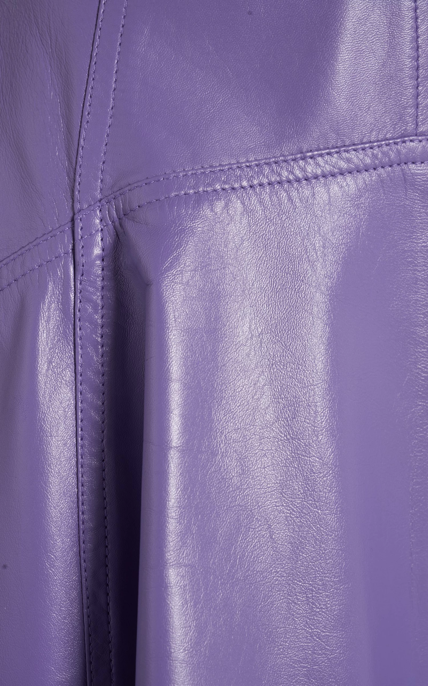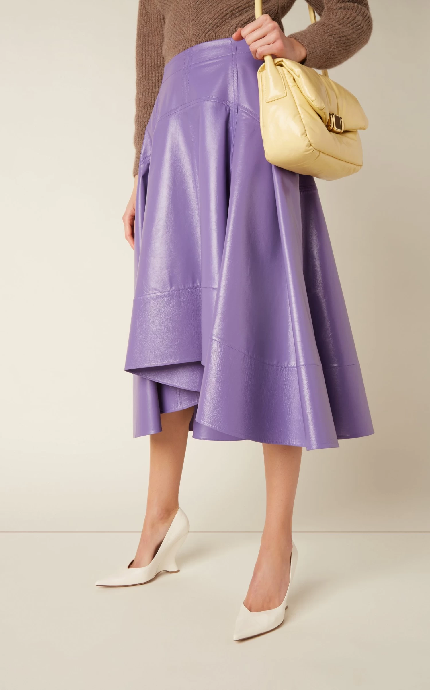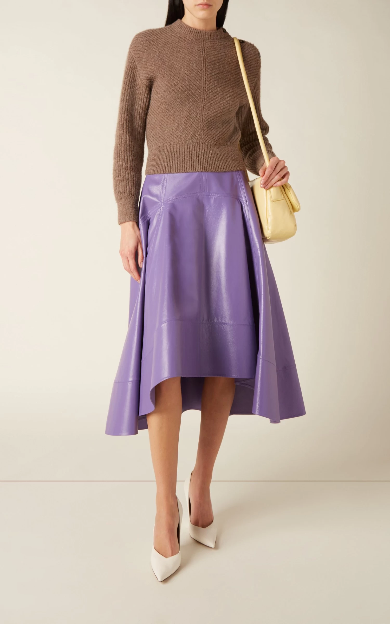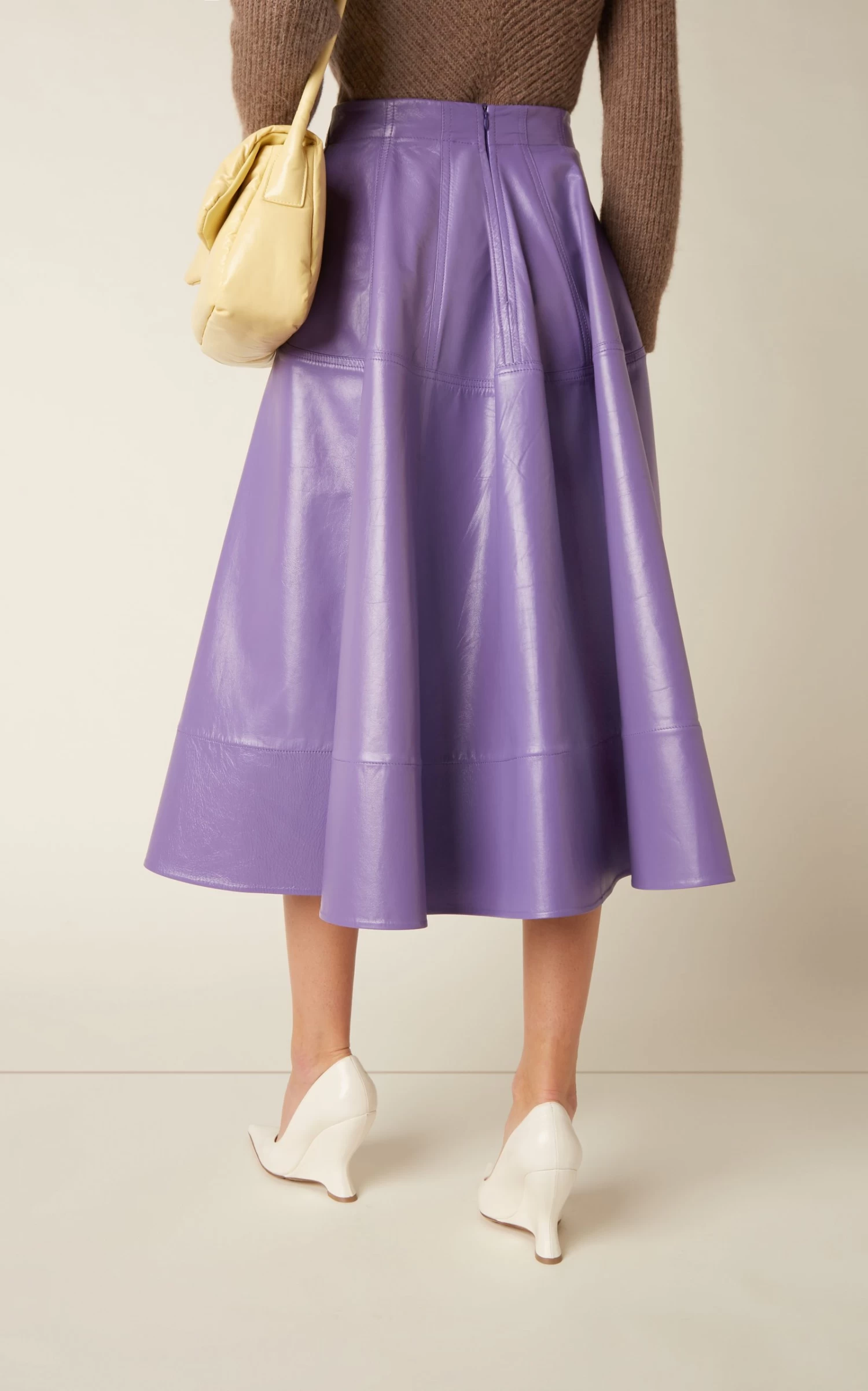 This skirt has a full, circle-cut silhouette made from glossy lambskin leather with a higher front hem. Match the vibrant shade with creamy neutrals.