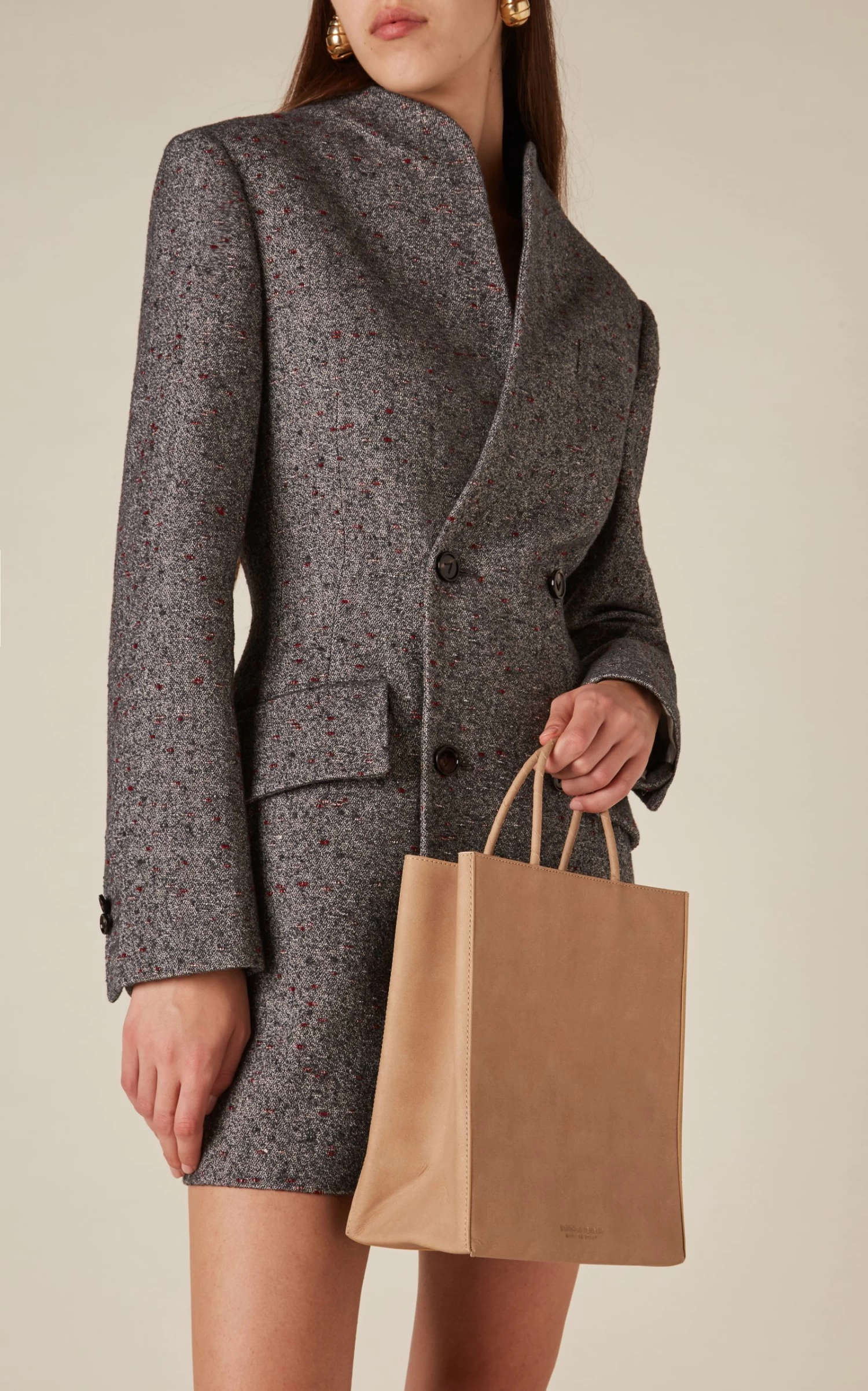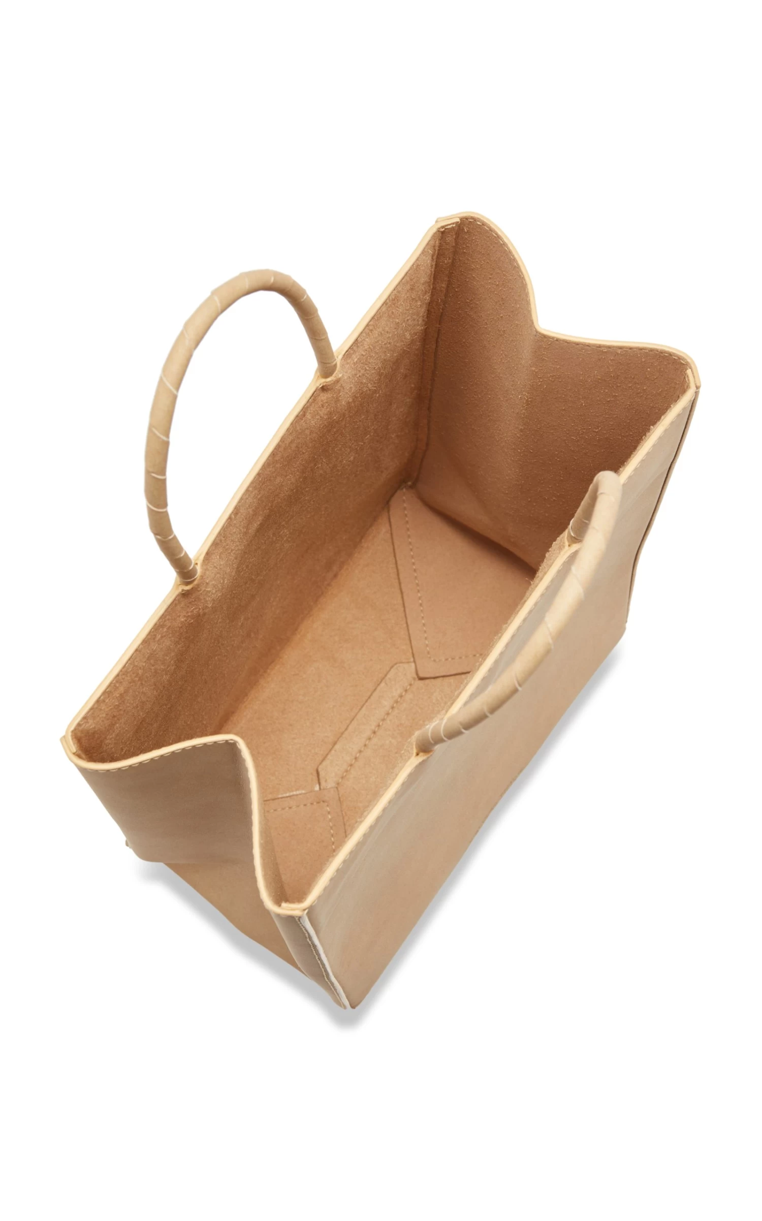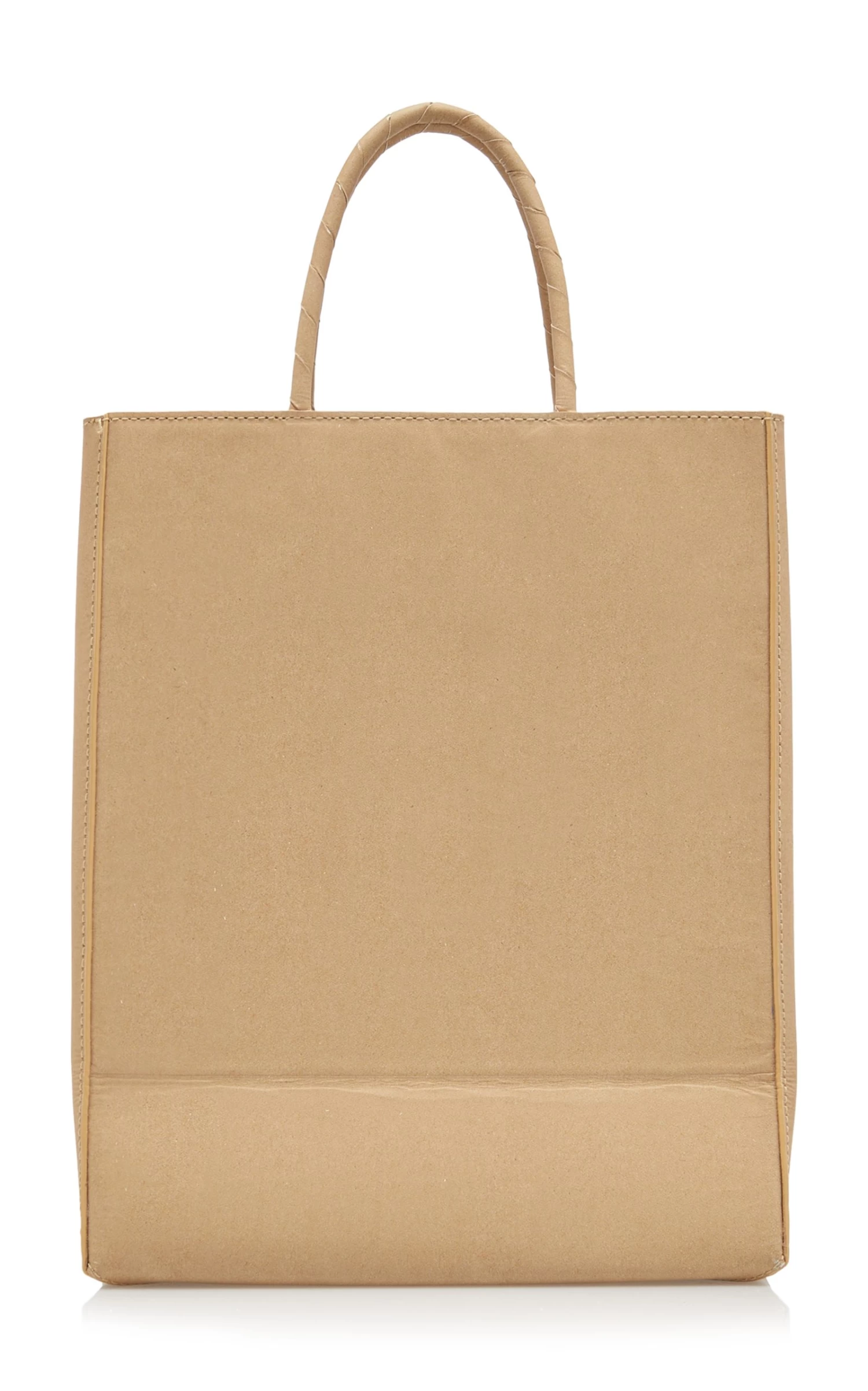 This tote has a North/South silhouette cleverly crafted from leather with a paper-like look and feel and a suede lining for structure. The wrapped handles mimic those found on shopping bags.