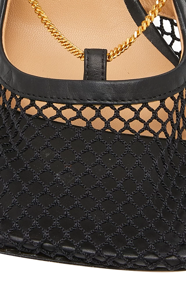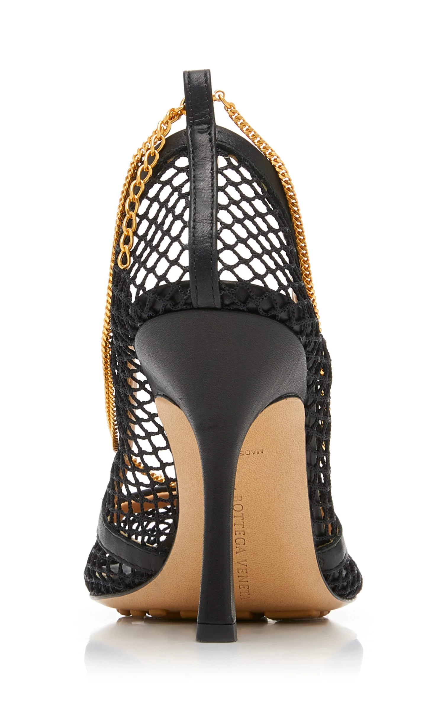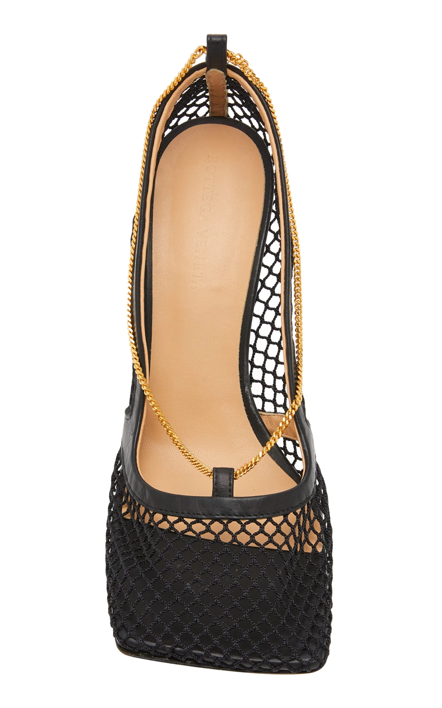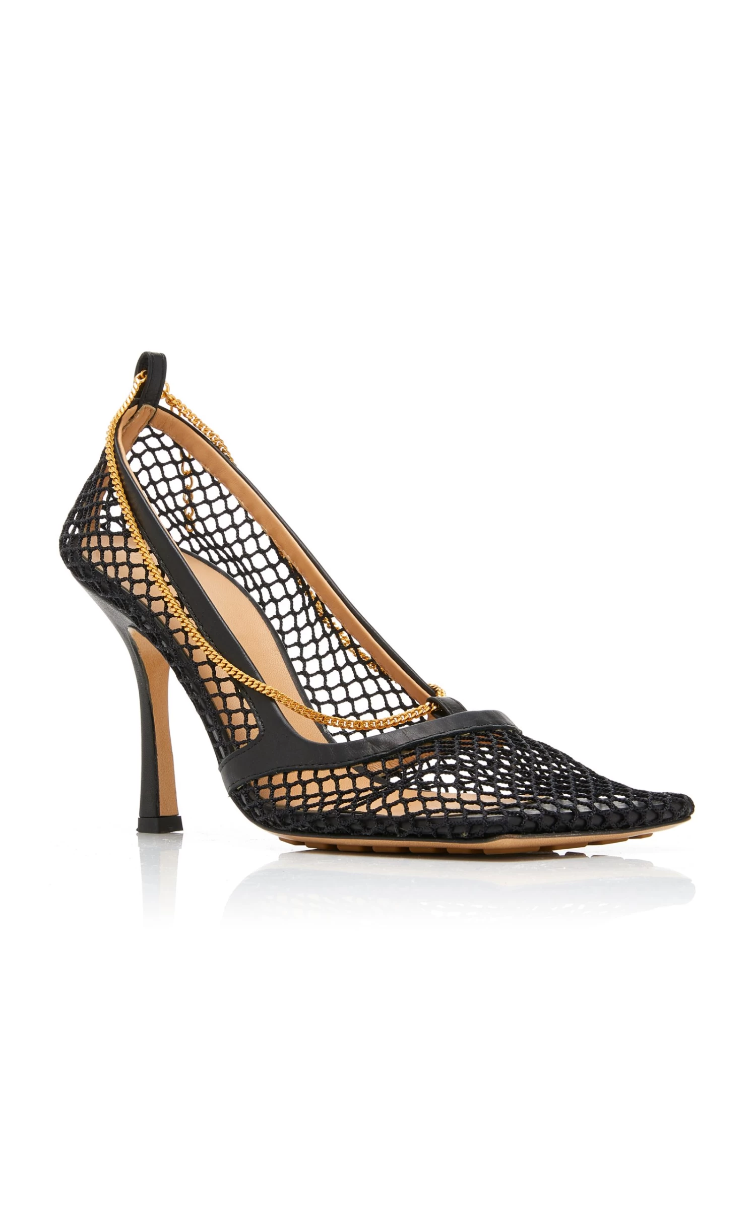 Bottega Veneta’s ‘Stretch’ pumps are crafted from leather with a mesh vamp that resembles netting. Embellished with a gold-tone chain, this pair sits atop a slim stiletto heel and is finished with a squared toe. Complement yours by styling with gilded accessories.