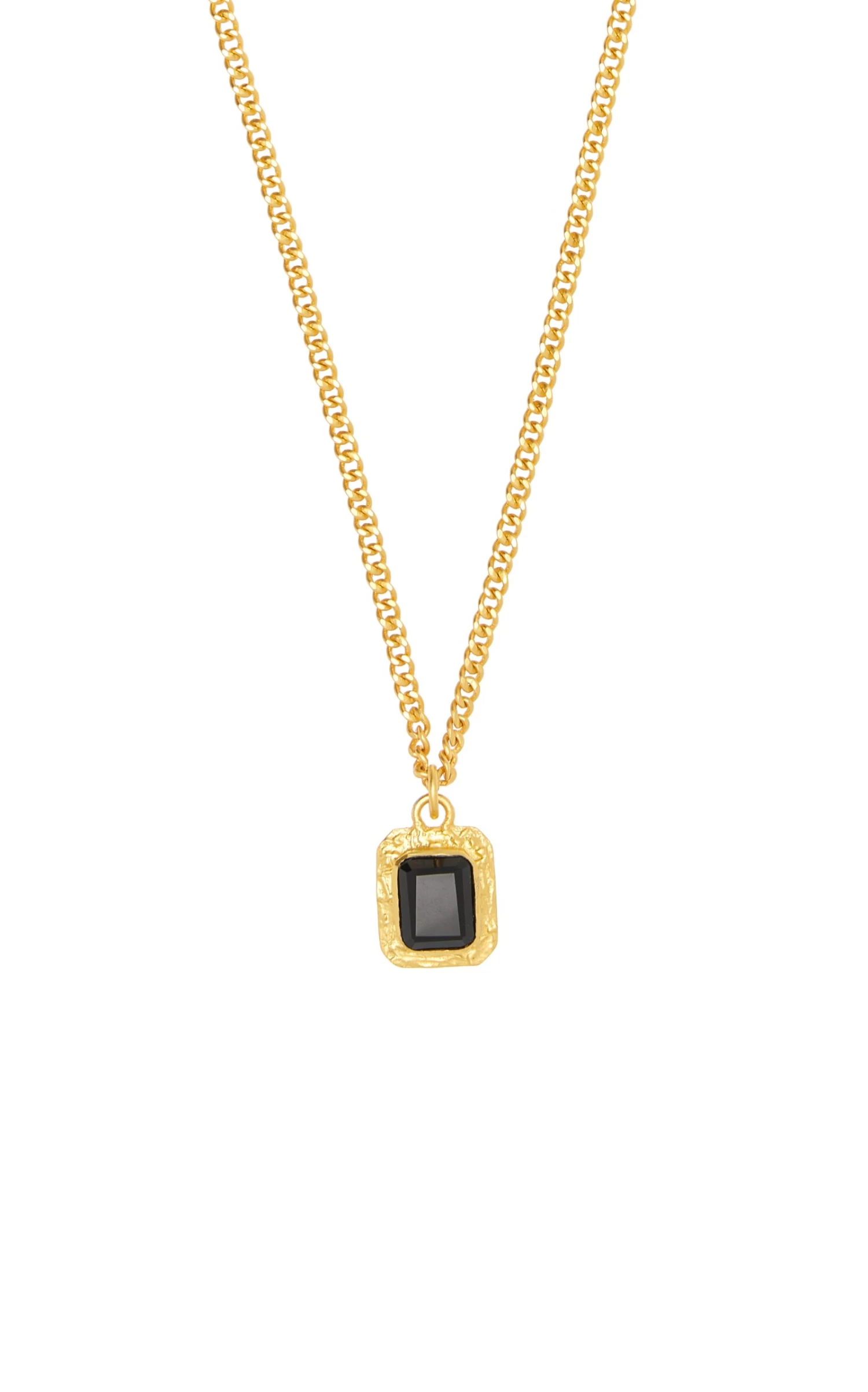 This 24K gold-plated necklace has a chain-link body and a square pendant set with black onyx. Layer with others over a knit sweater.