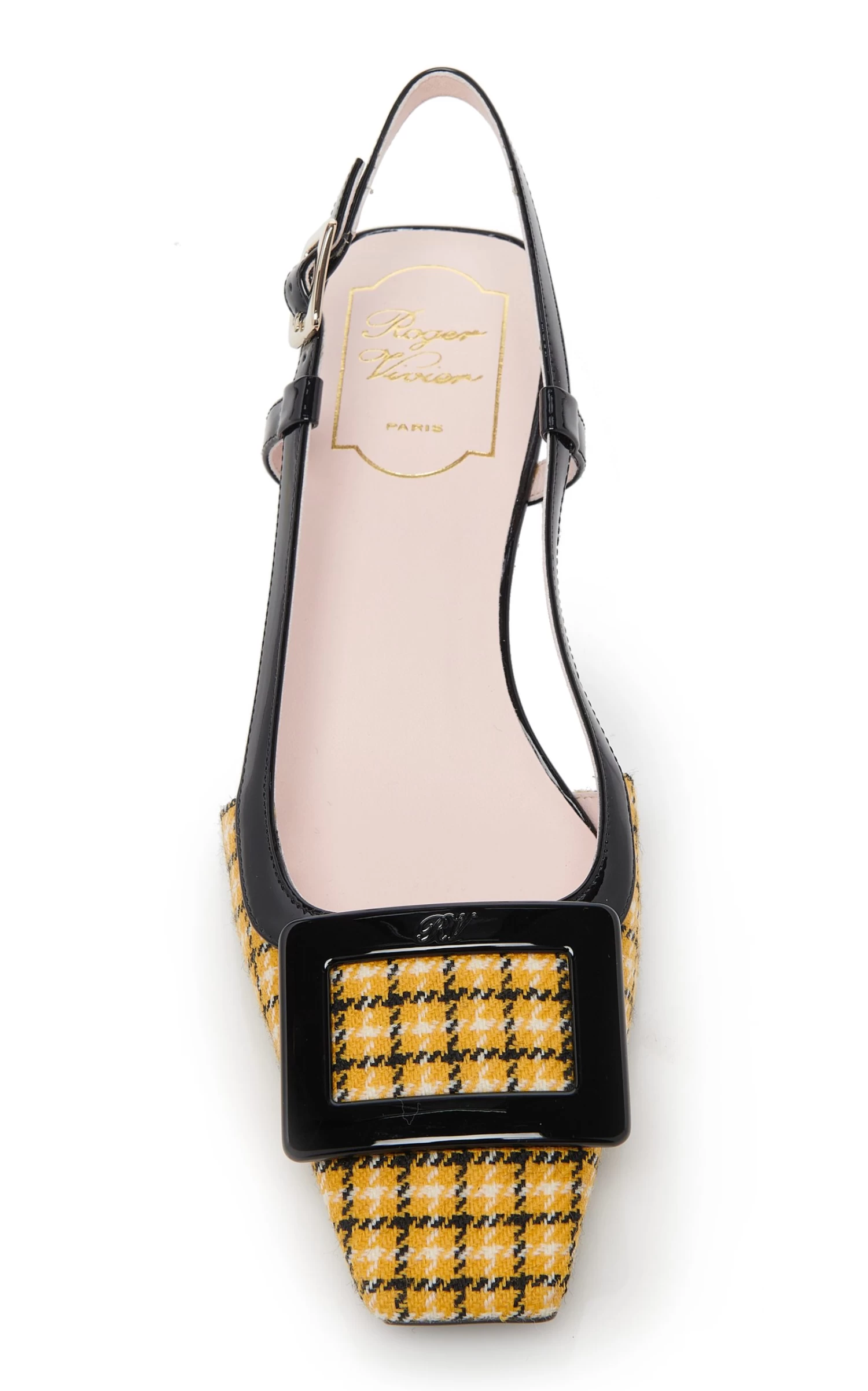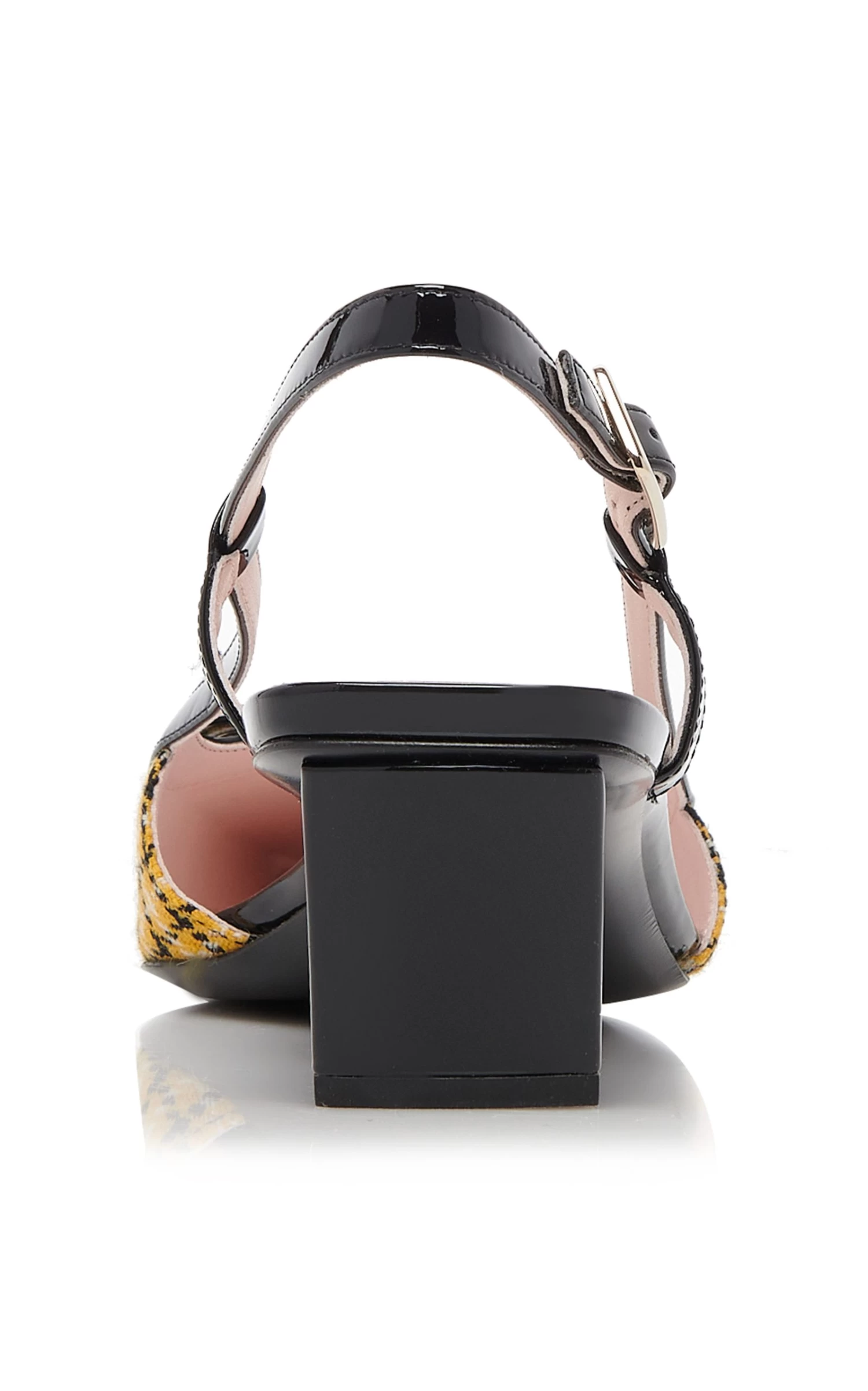 Crafted in Italy, these slingback pumps have a retro-inspired silhouette featuring a plaid body detailed with patent leather straps, block heel, and a signature buckle. Wear yours to add some interest to work-wear.