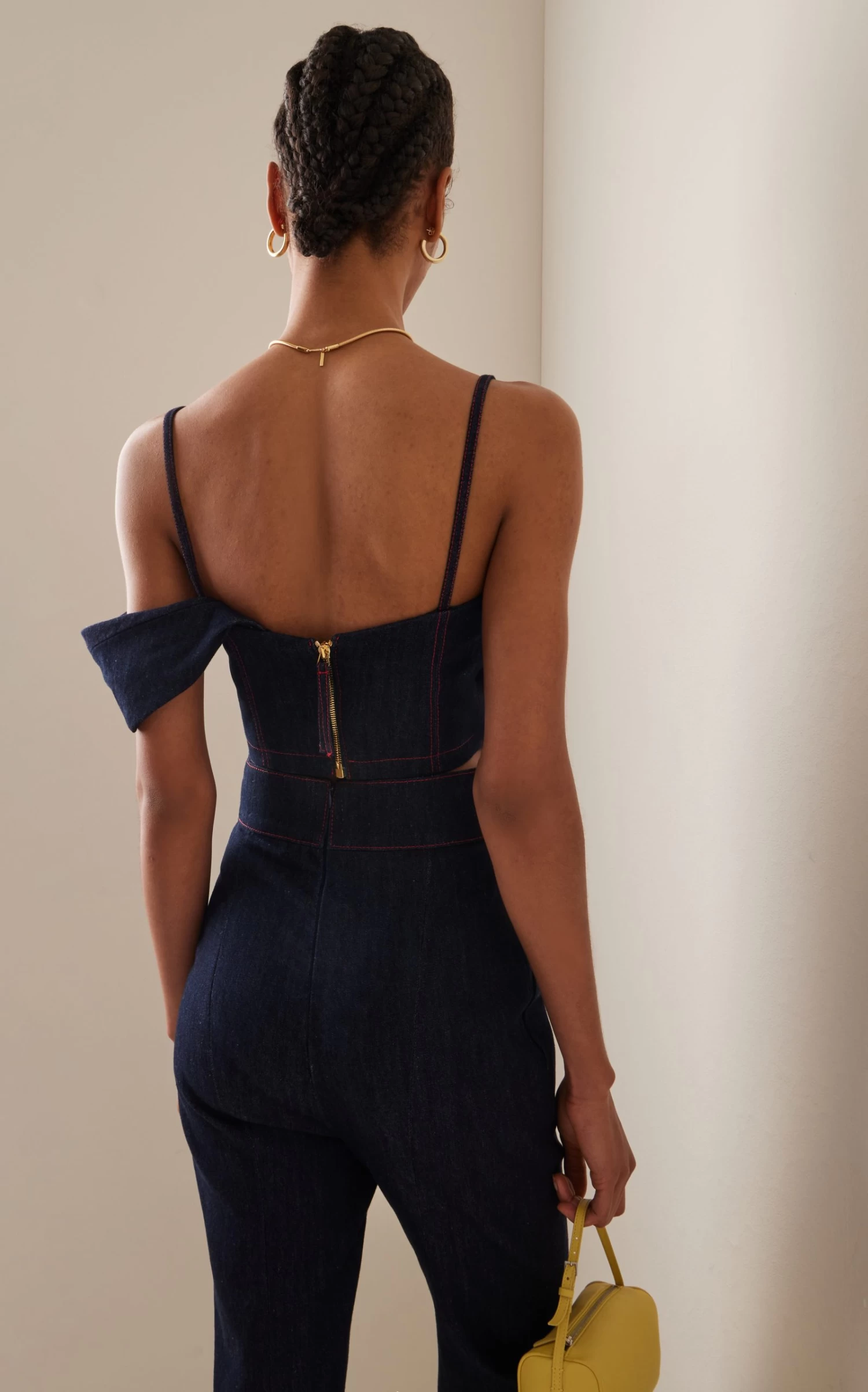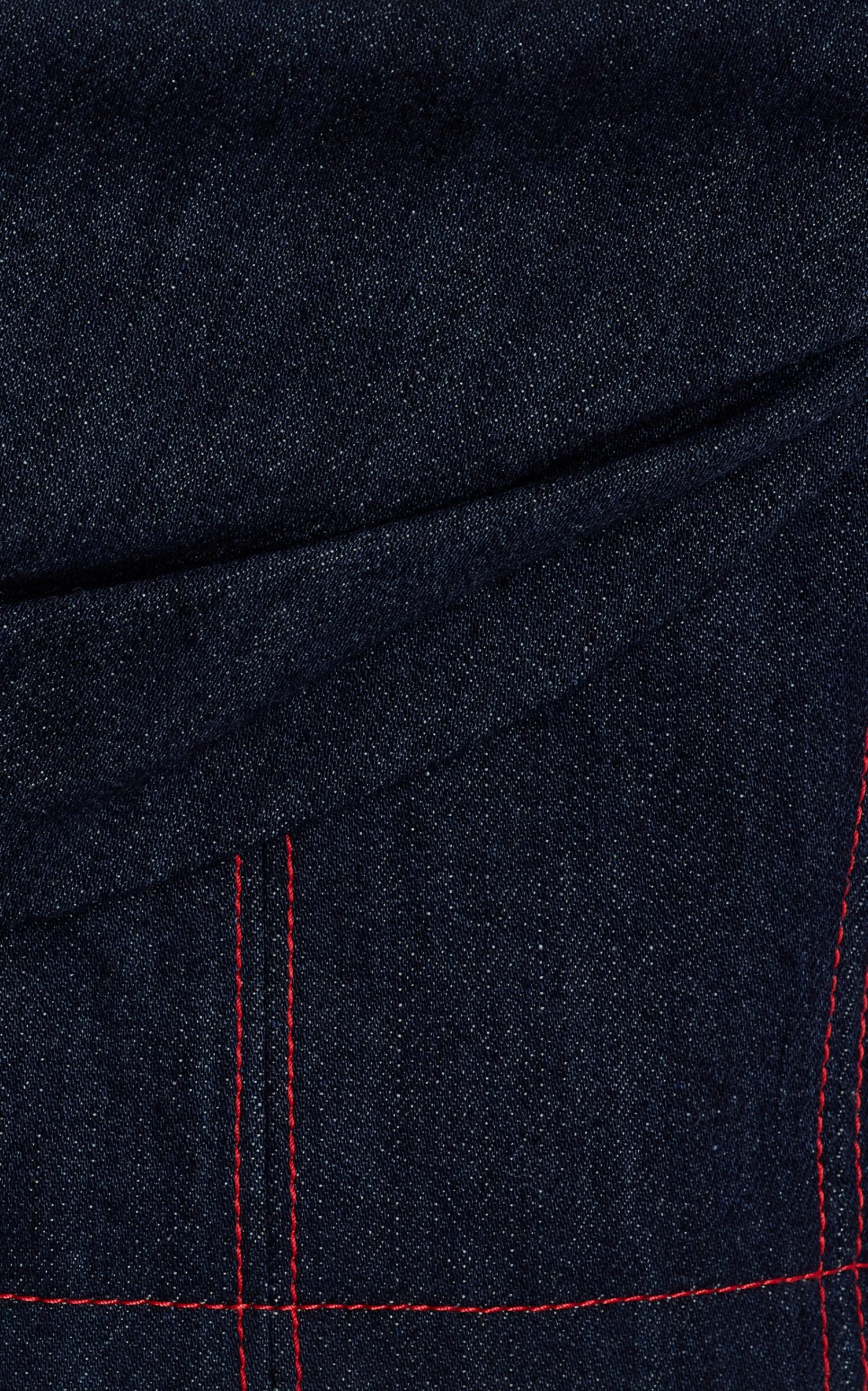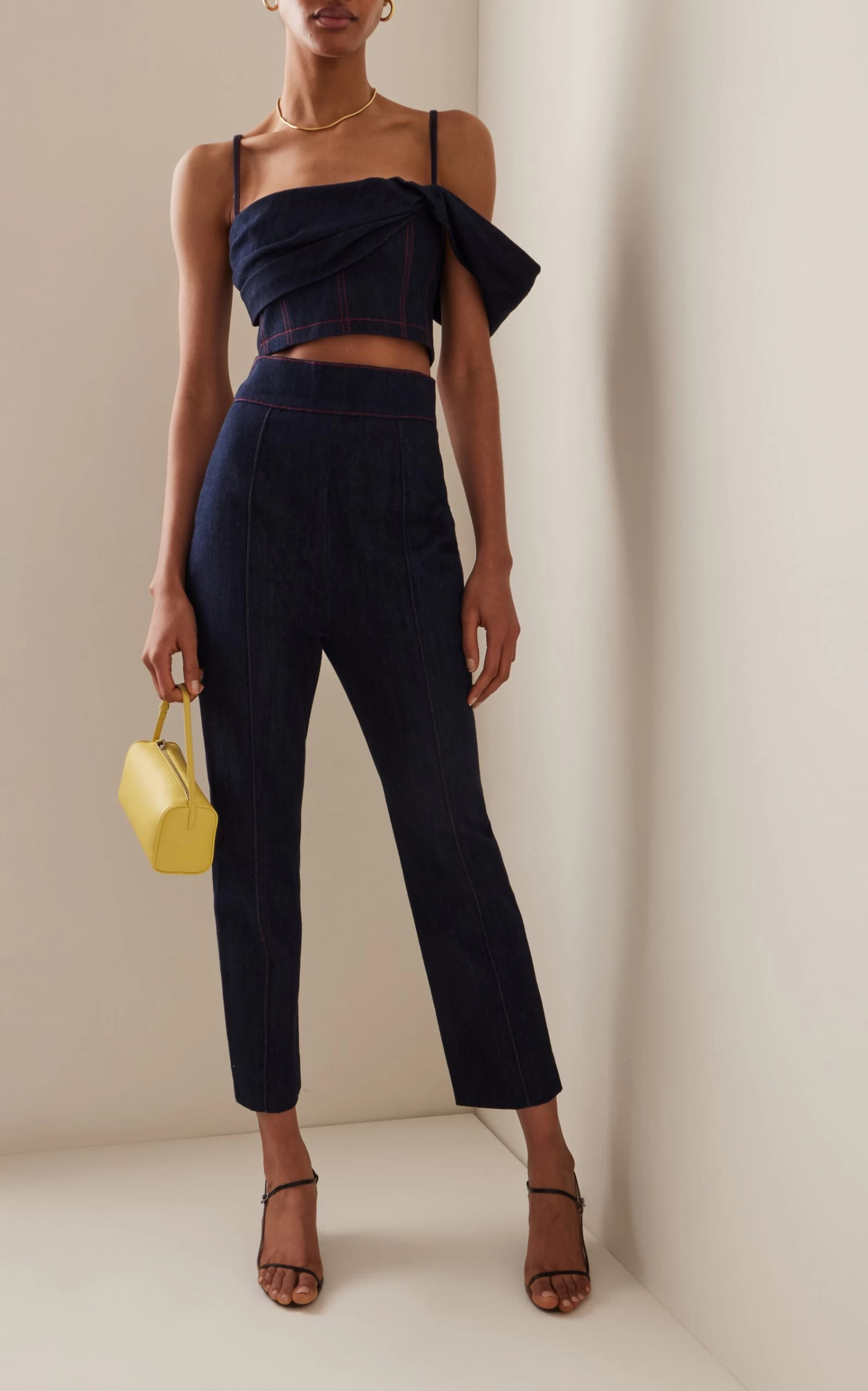 Cut from dark-wash cotton chambray, this cropped top features a corseted silhouette with a draped overlay that extends over the left arm. Wear it with the matching pant from this season.