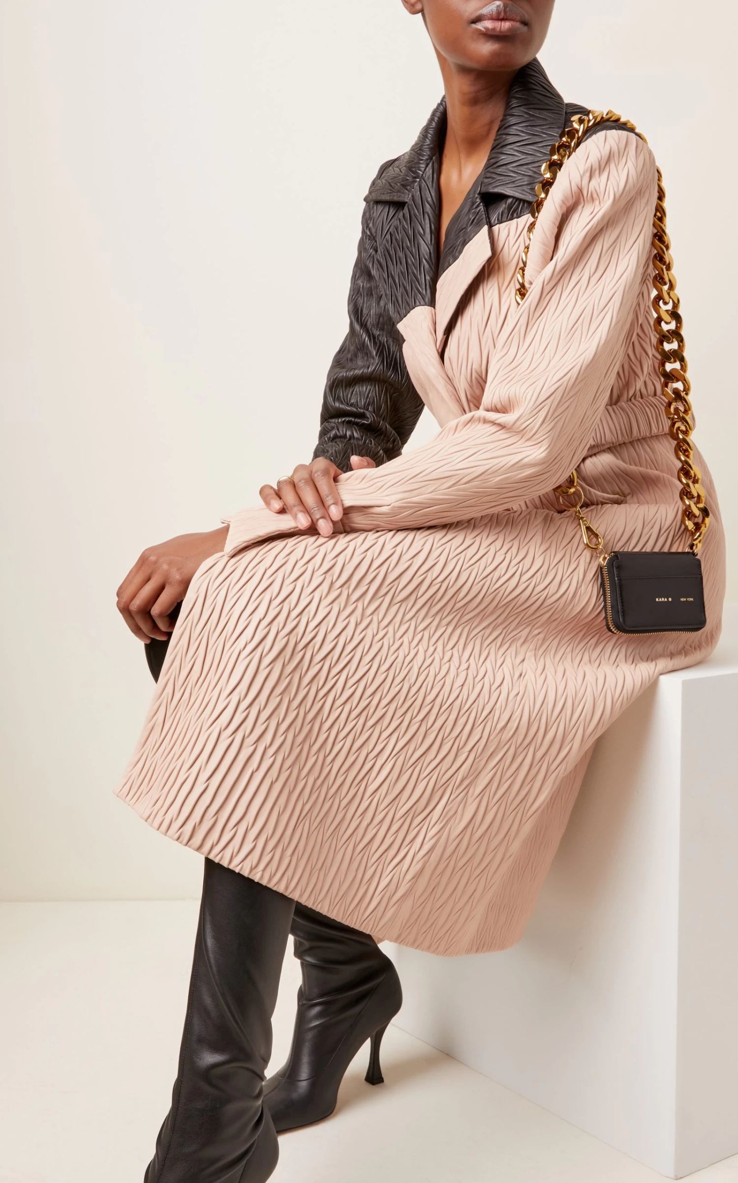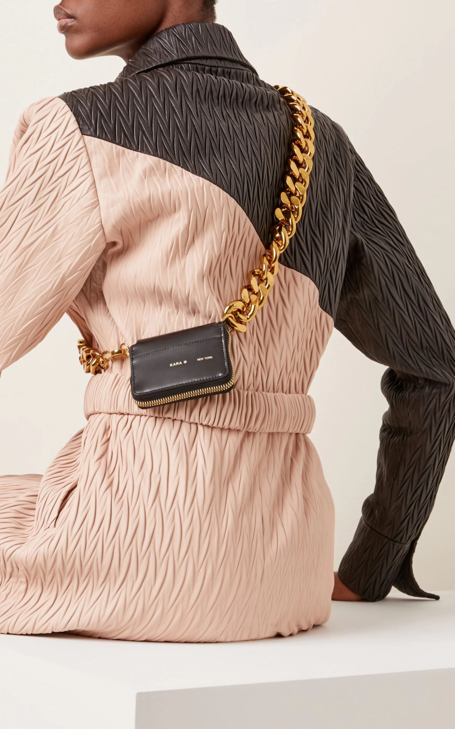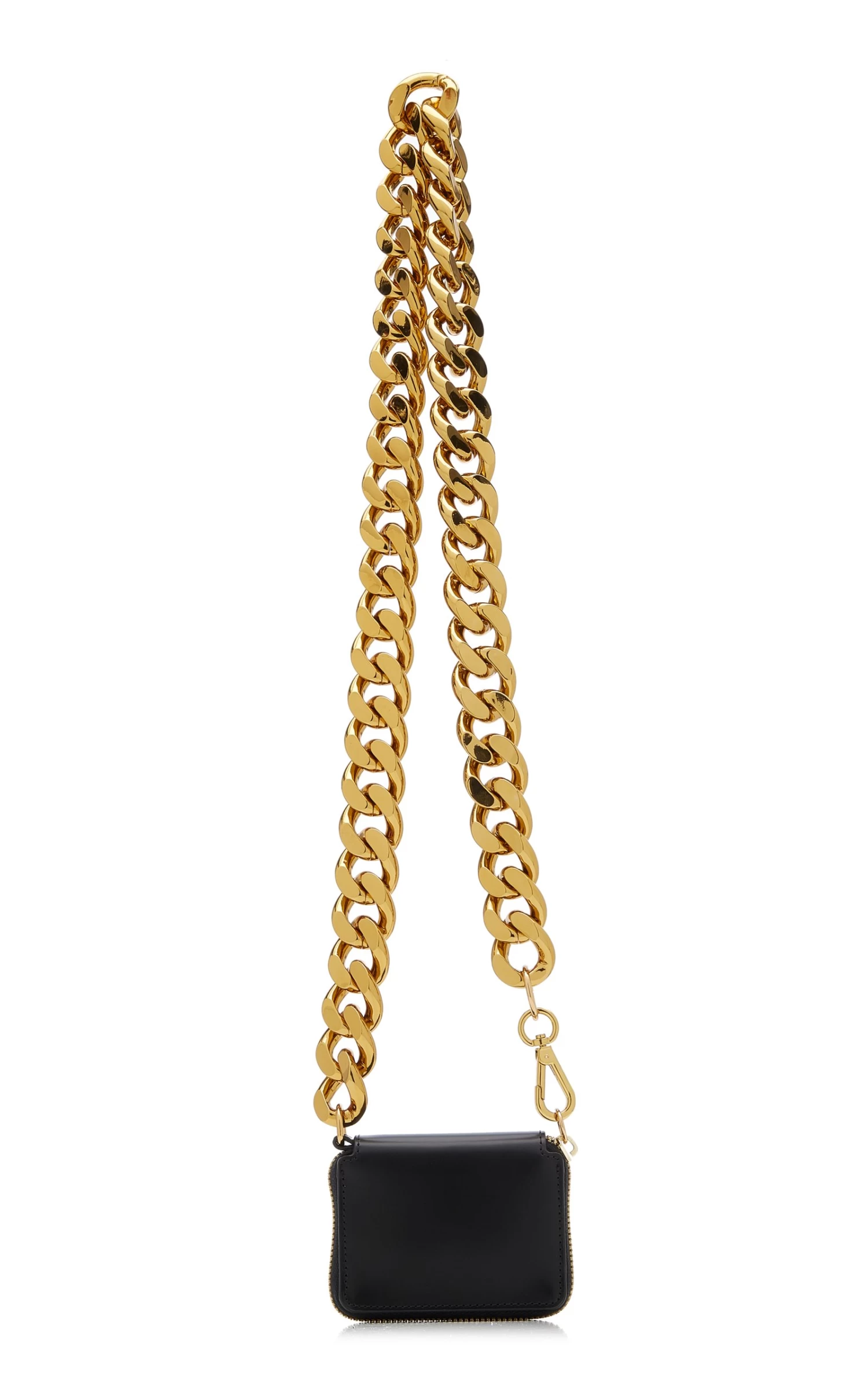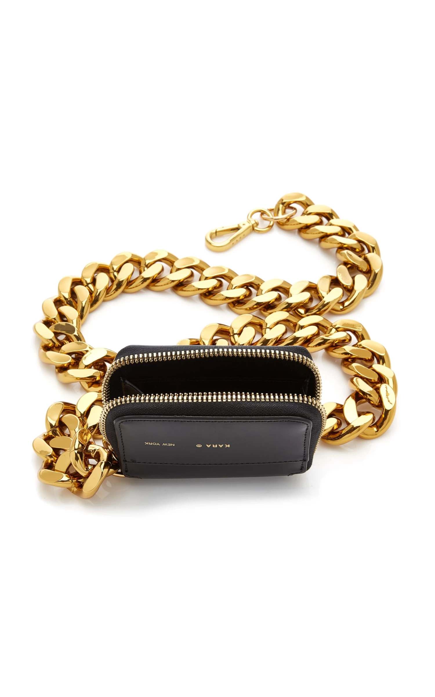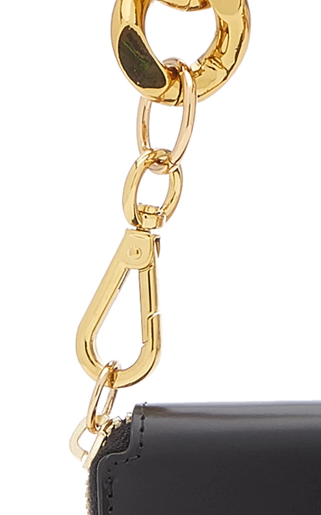 KARA’s ‘Bike’ wallet is inspired by the oversized locks worn by cyclists around New York City. It’s made from smooth black leather with an adjustable chunky gold-tone chain.
