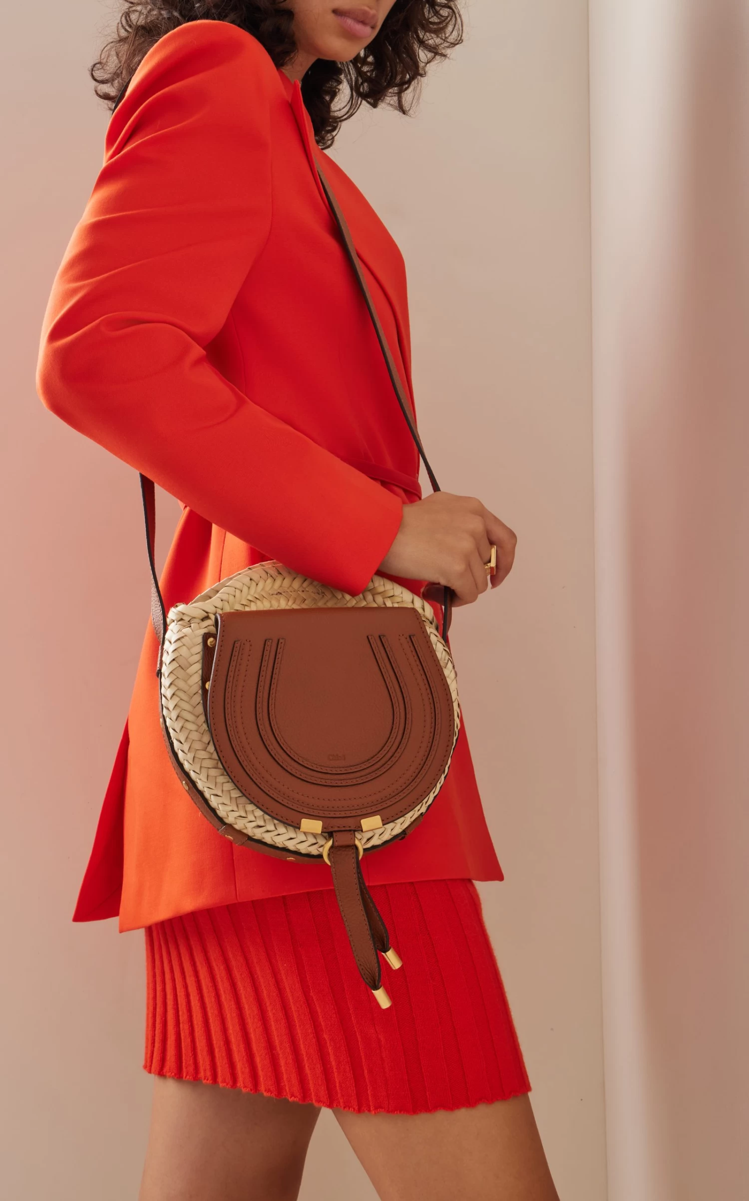 The ‘Marcie’ bag is constructed from hand-braided raffia with a signature lambskin leather front flap decorated with saddle stitching and hanging strips. The adjustable leather strap allows for cross-body and long shoulder wear.