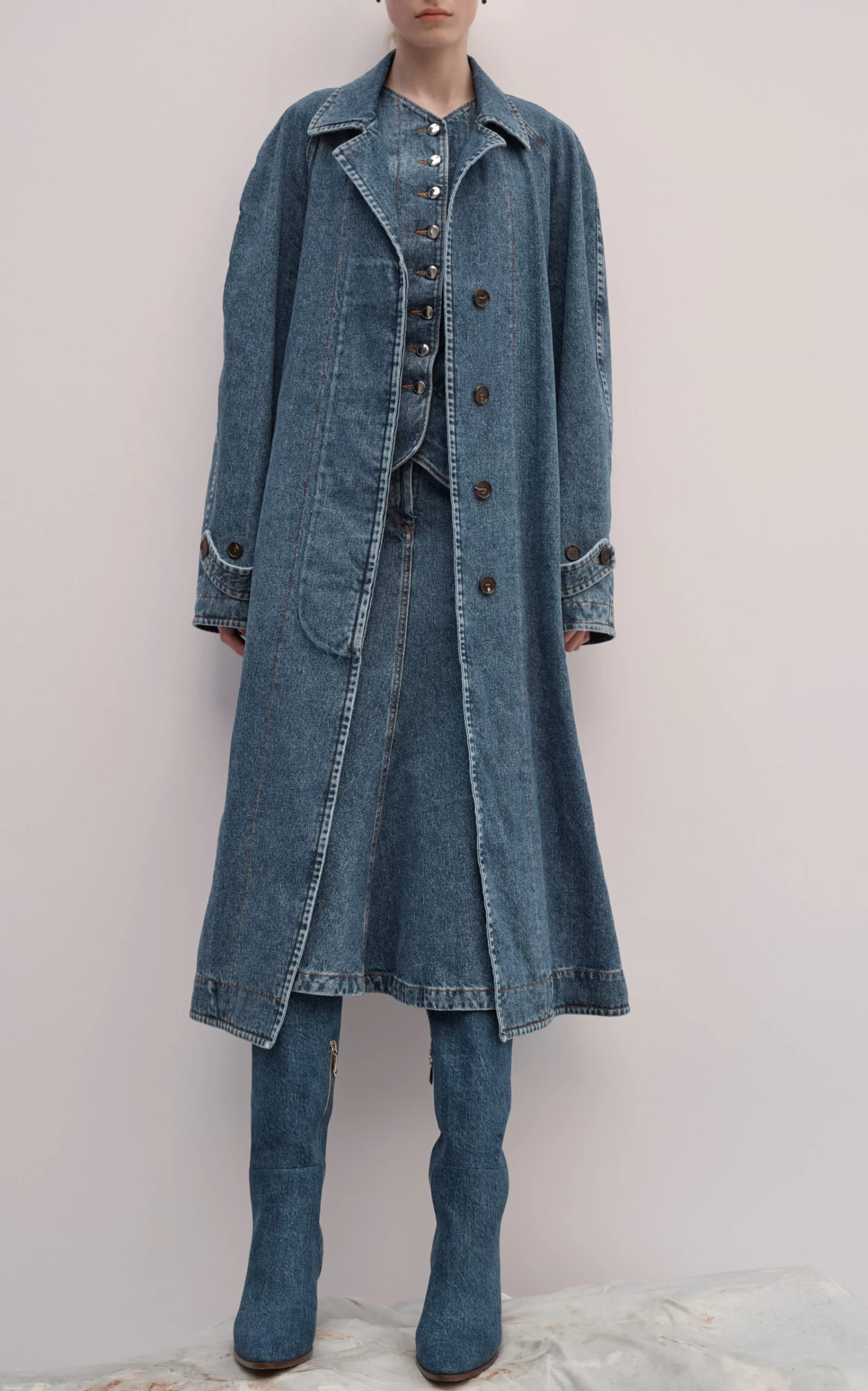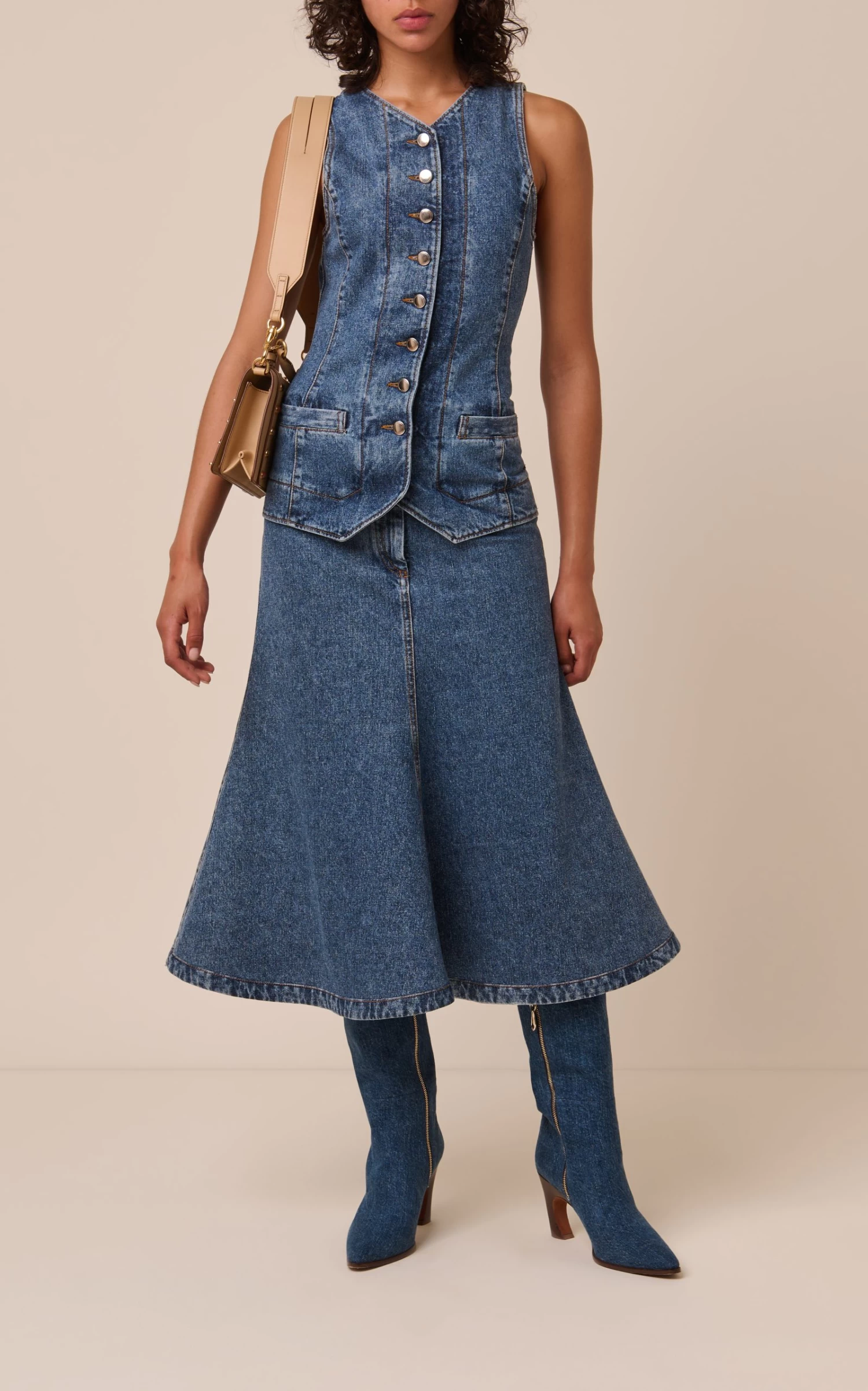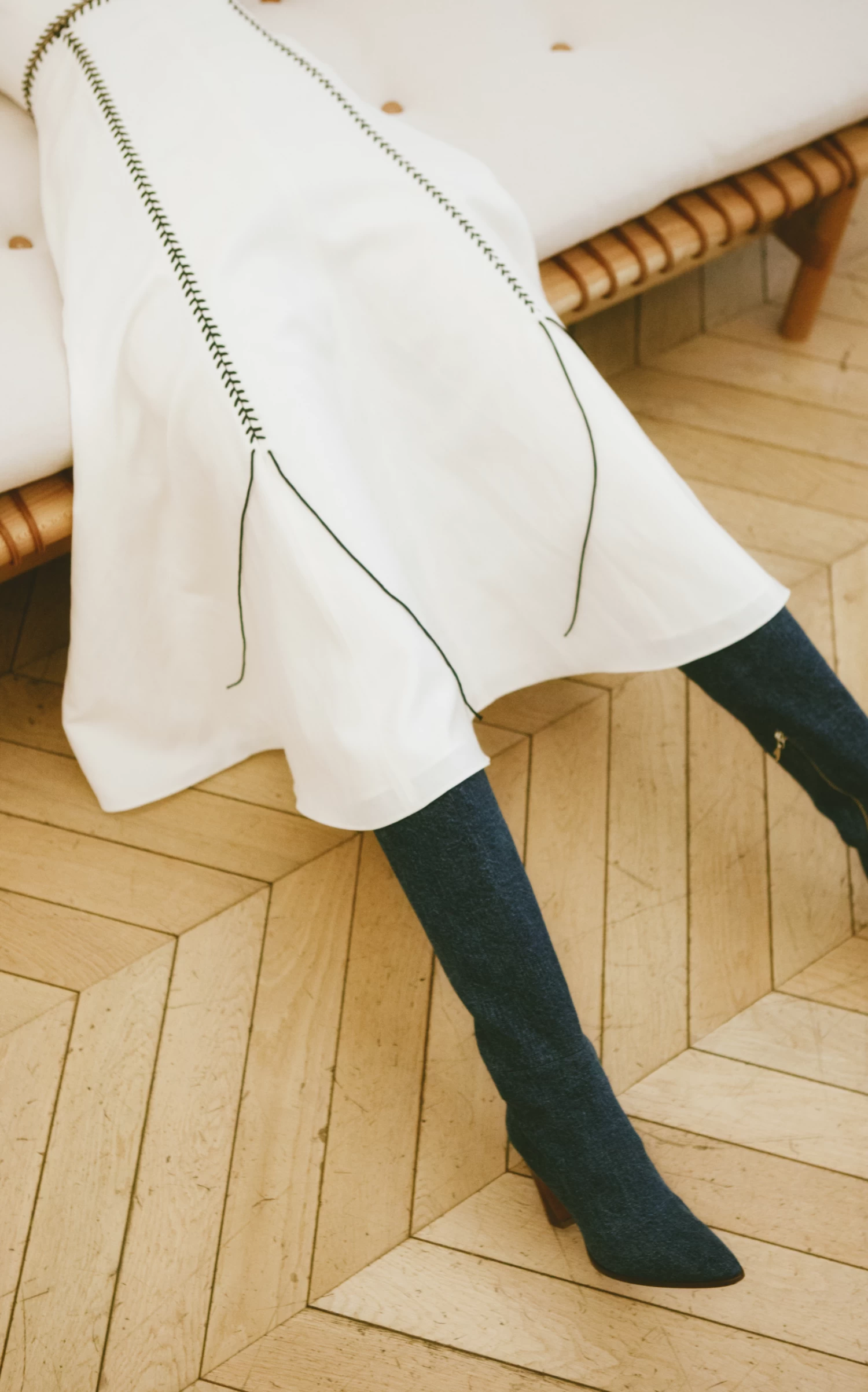 The ‘Oli’ boot has a knee-length silhouette made from dark-wash denim with pointed toes and a sculptural heel. Wear with all-denim looks.