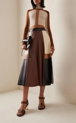 Made of patchwork leather, this skirt has an A-line silhouette and falls to a midi length. Wear yours with a blouse and strappy sandals.