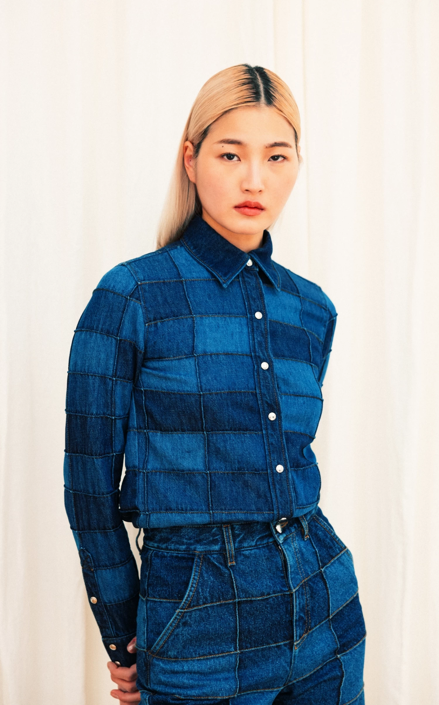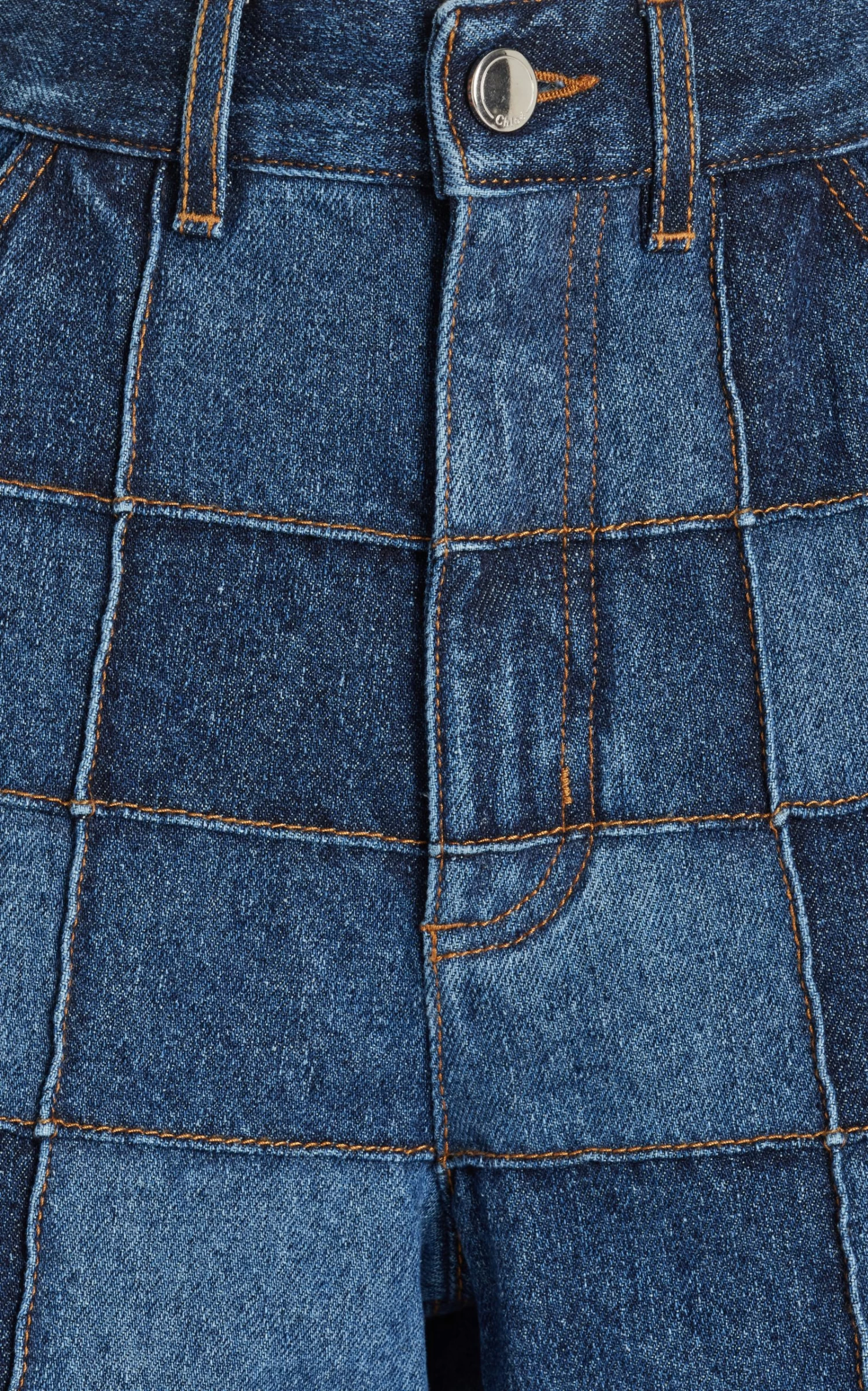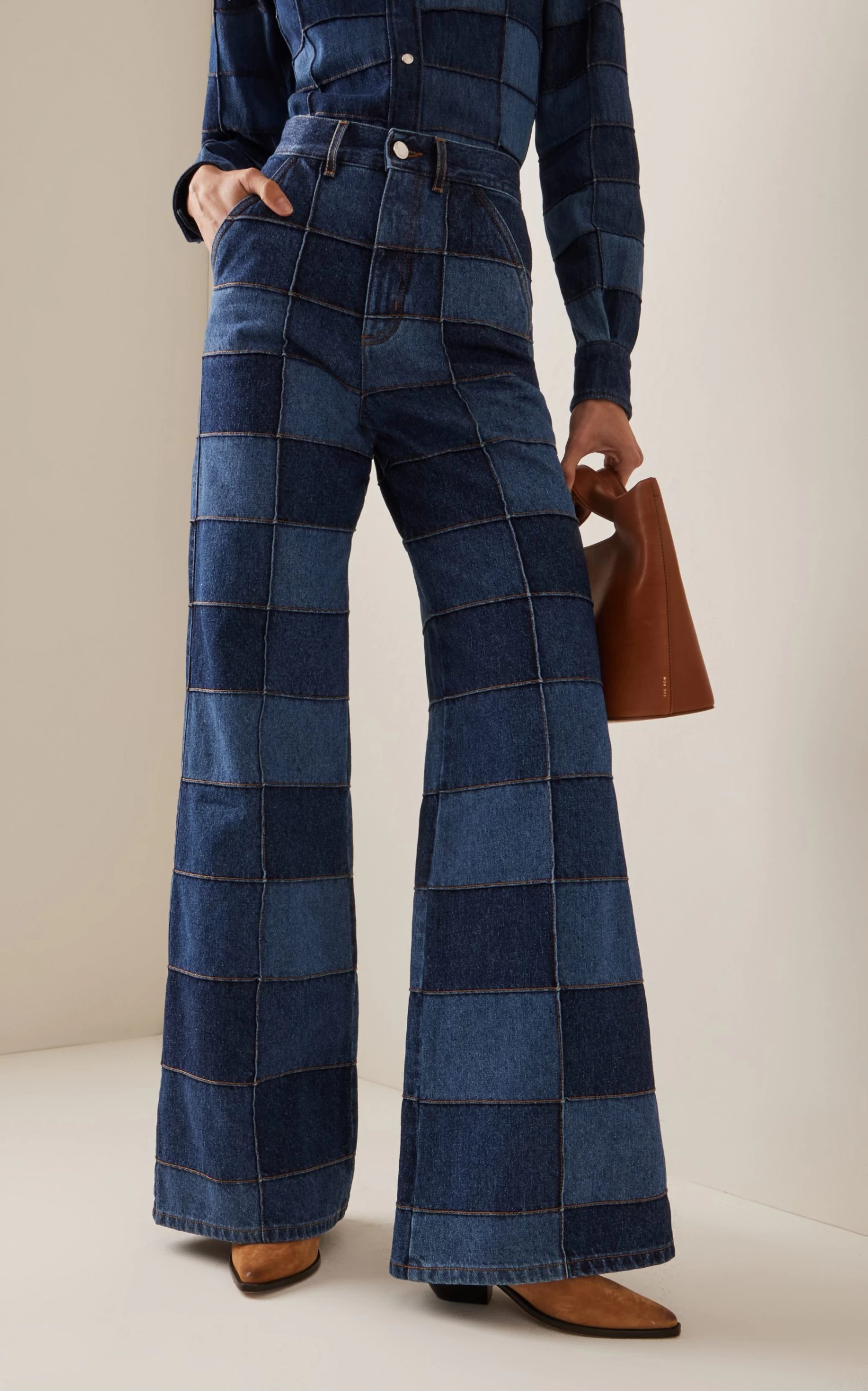 Cut from a patchwork of recycled cotton and hemp, these high-cut jeans have wide legs that flare out slightly from the knee. Complete the look with the matching shirt.