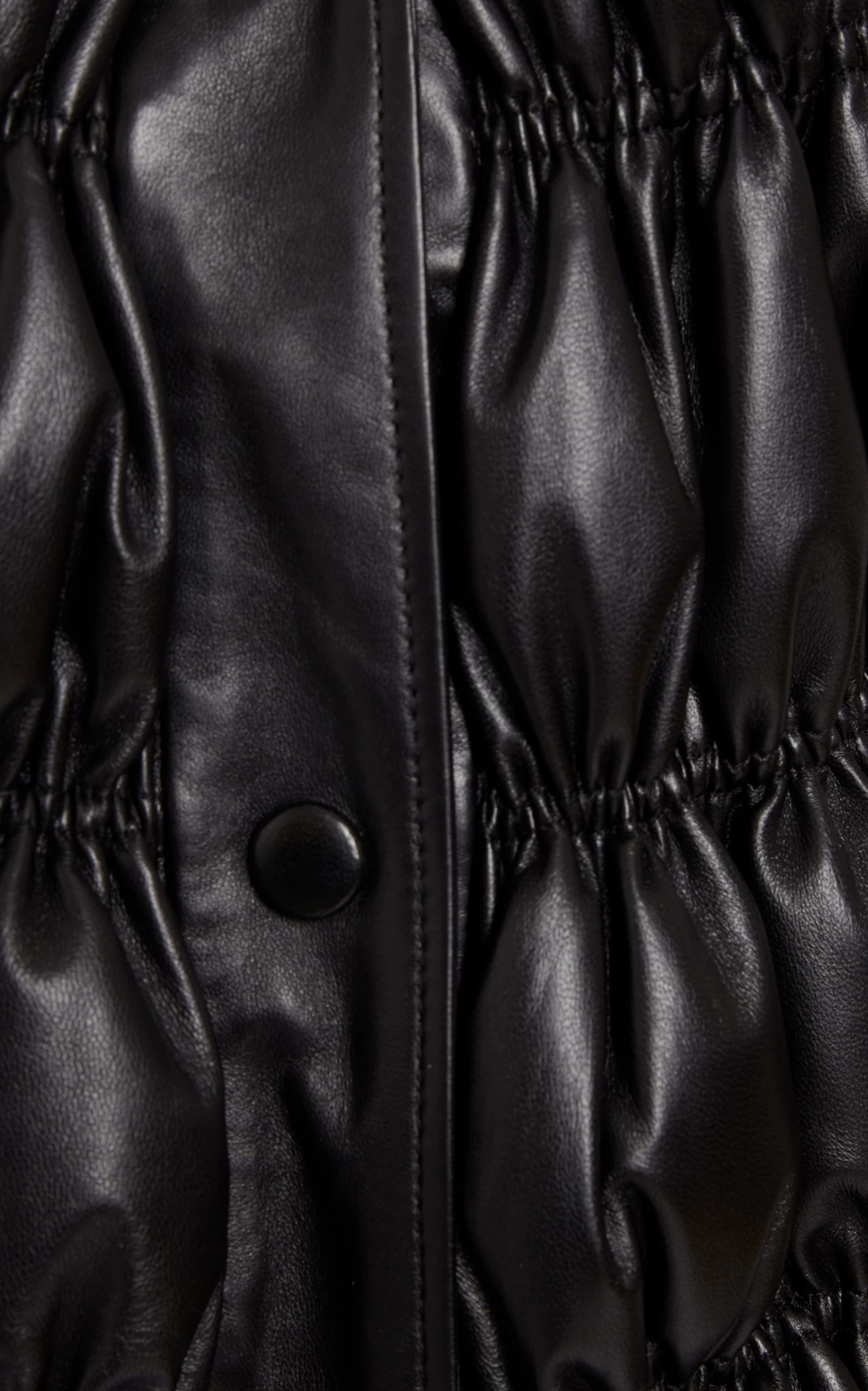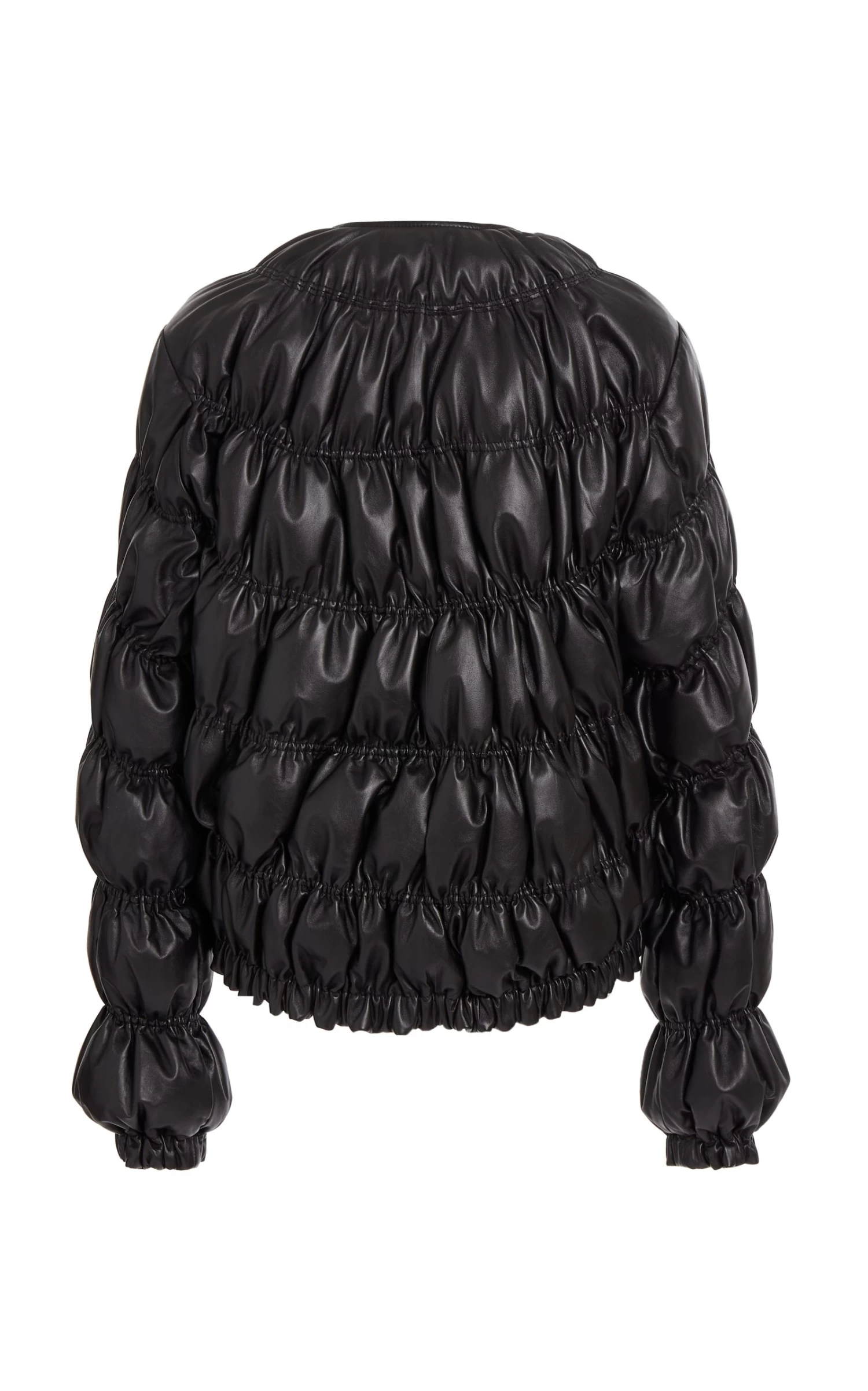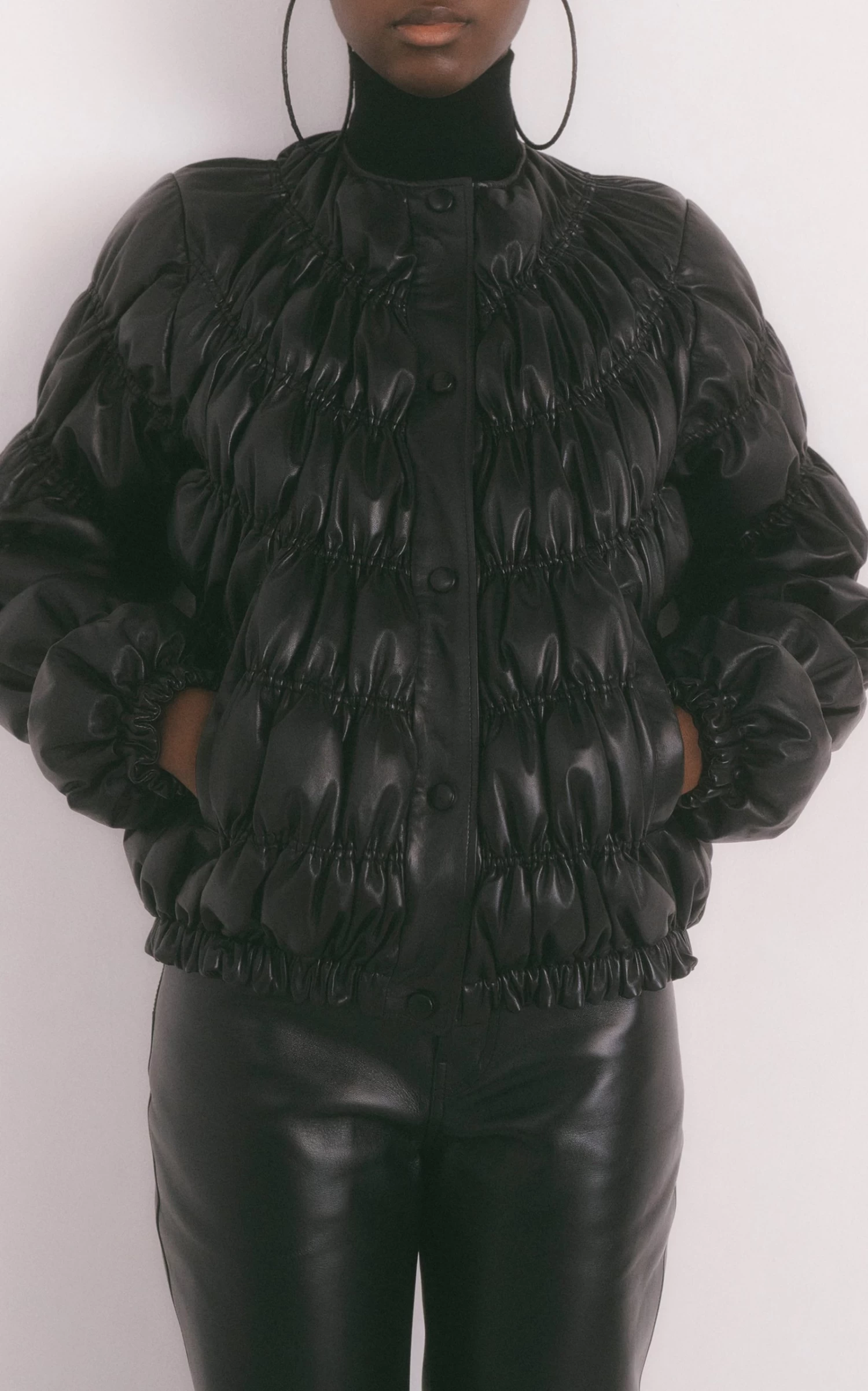 - Voluminous silhouette, quilted embroidery, cinched cuffs