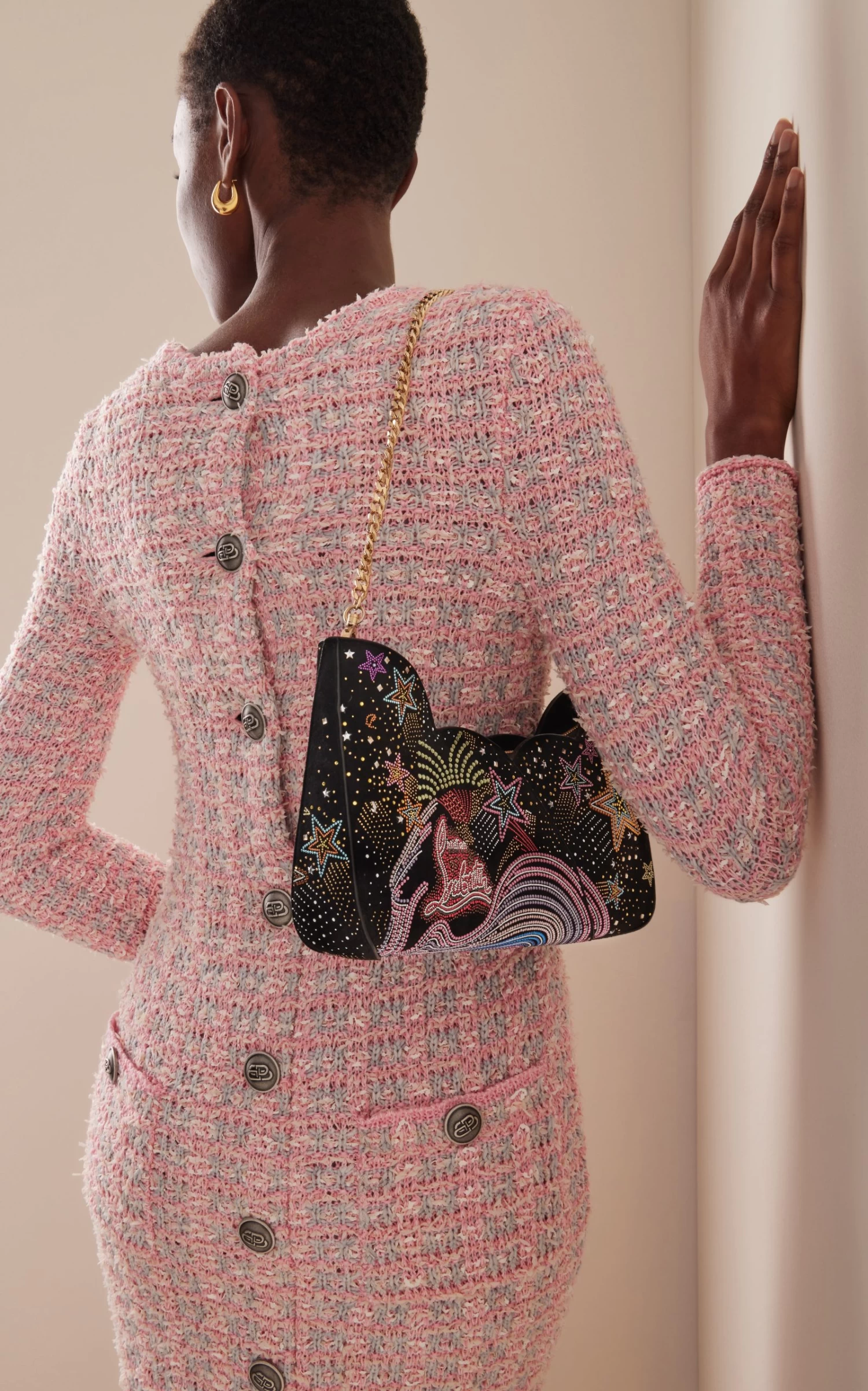 This ‘Hot Chick’ baguette comes with a removable gold chain so you can carry in multiple ways. Keep only the essentials in yours for a fun night out.