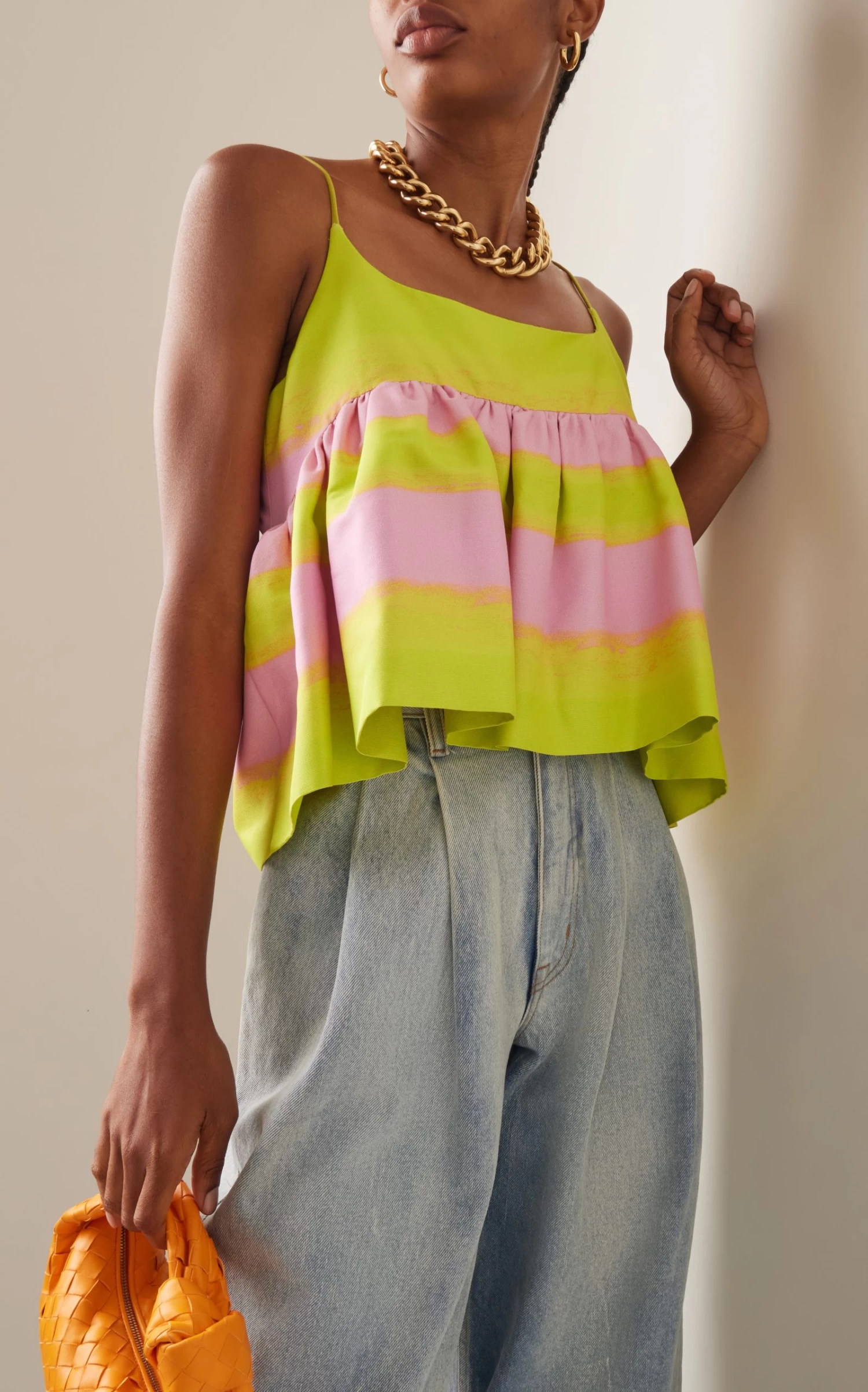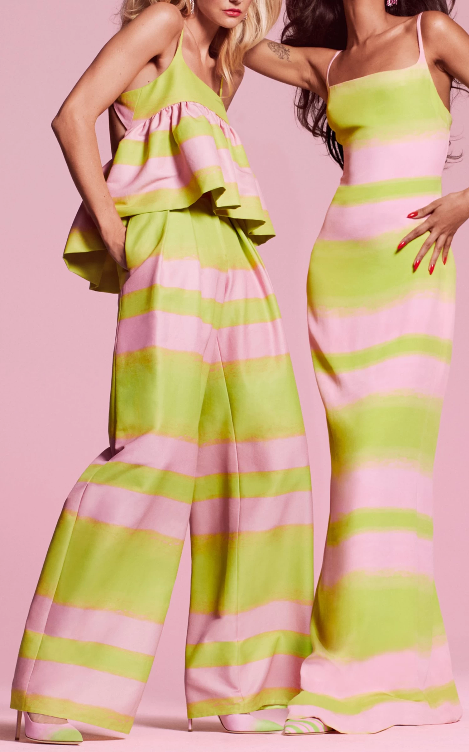 A collection designed during a protracted stay in California, Resort aptly delivers a joyful escapism. Party minis, full gowns, and ruffle-hemmed pencil skirts radiate a coastal exuberance with in-house painterly prints featuring electric hues and airbrushed palm trees (inspired by the tees sold on Venice Beach).