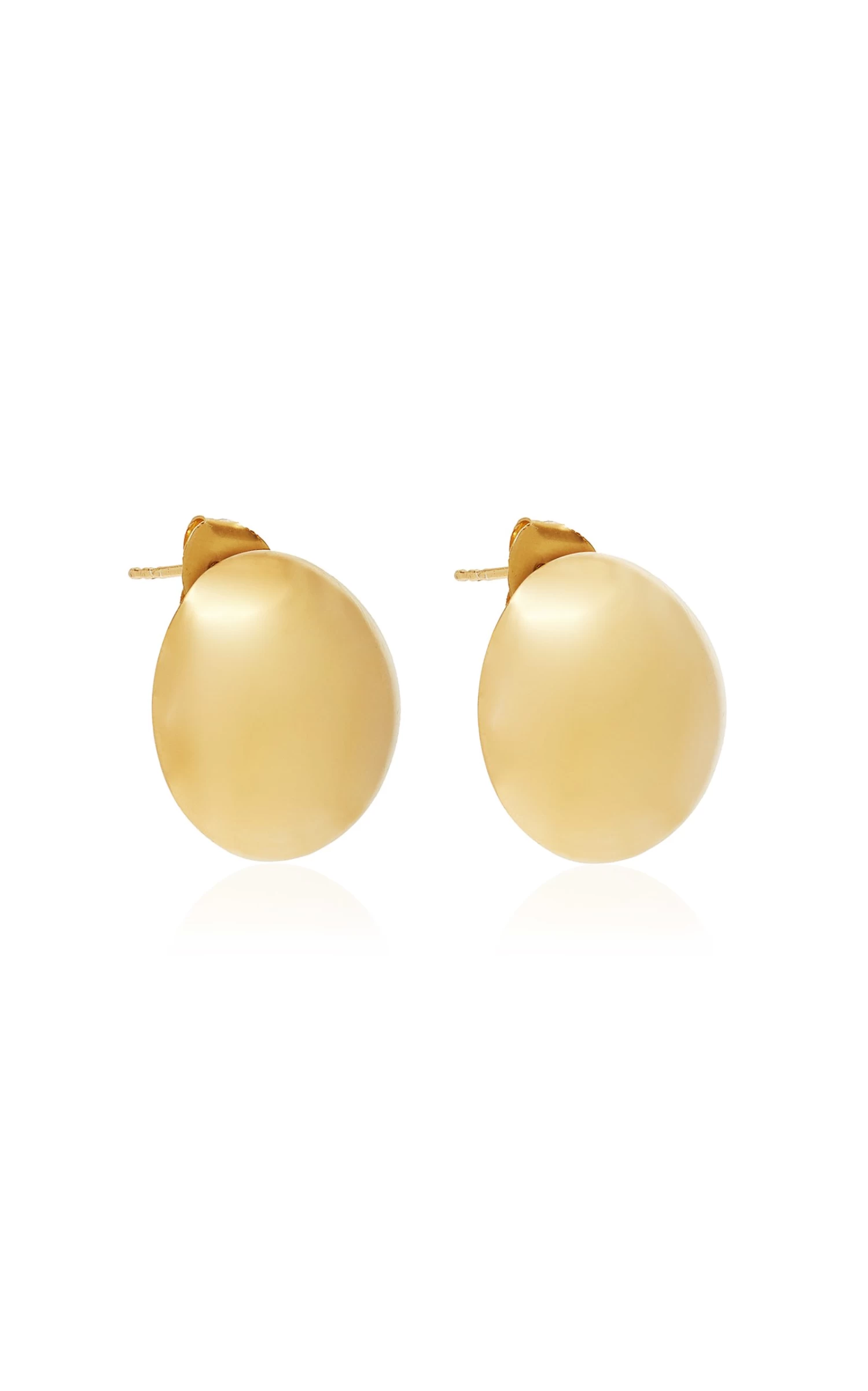 The ‘Critical Citizens’ earrings have a spherical silhouette made from recycled sterling silver with a 14k gold plating. The lightweight pair hang just below the lobe.