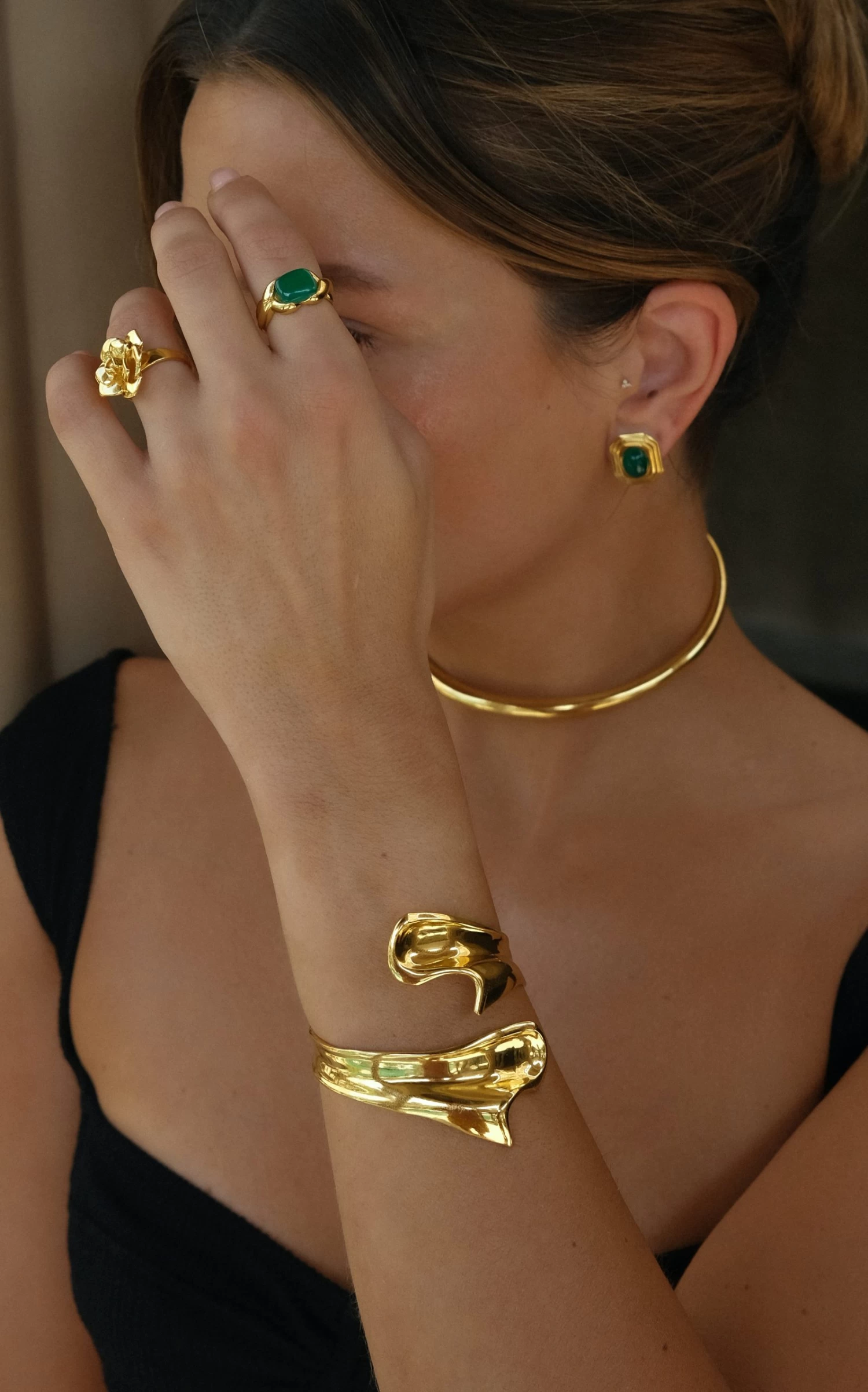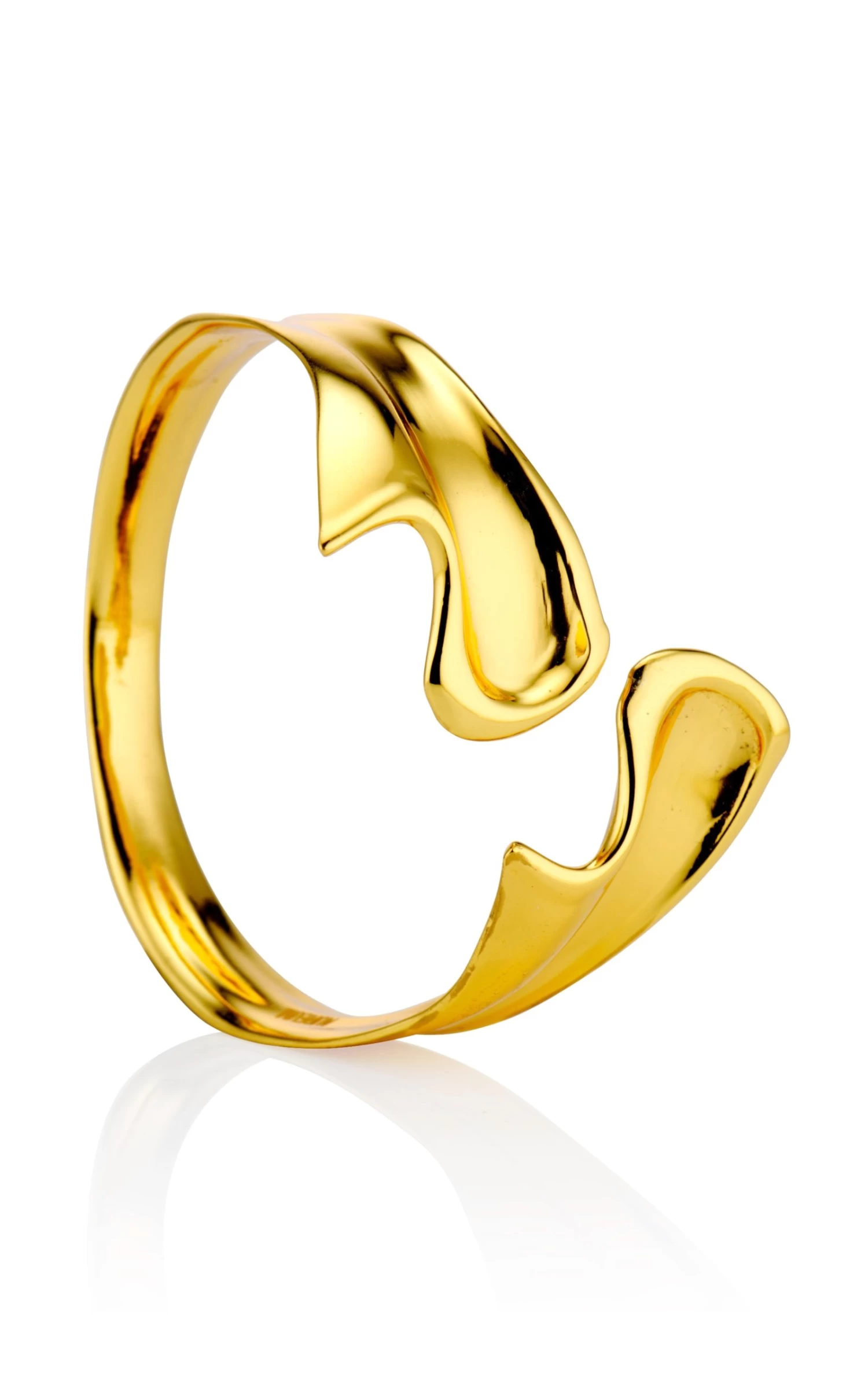 - Cuff silhouette, 24k gold-plated brass body, sculptural design, split detailing