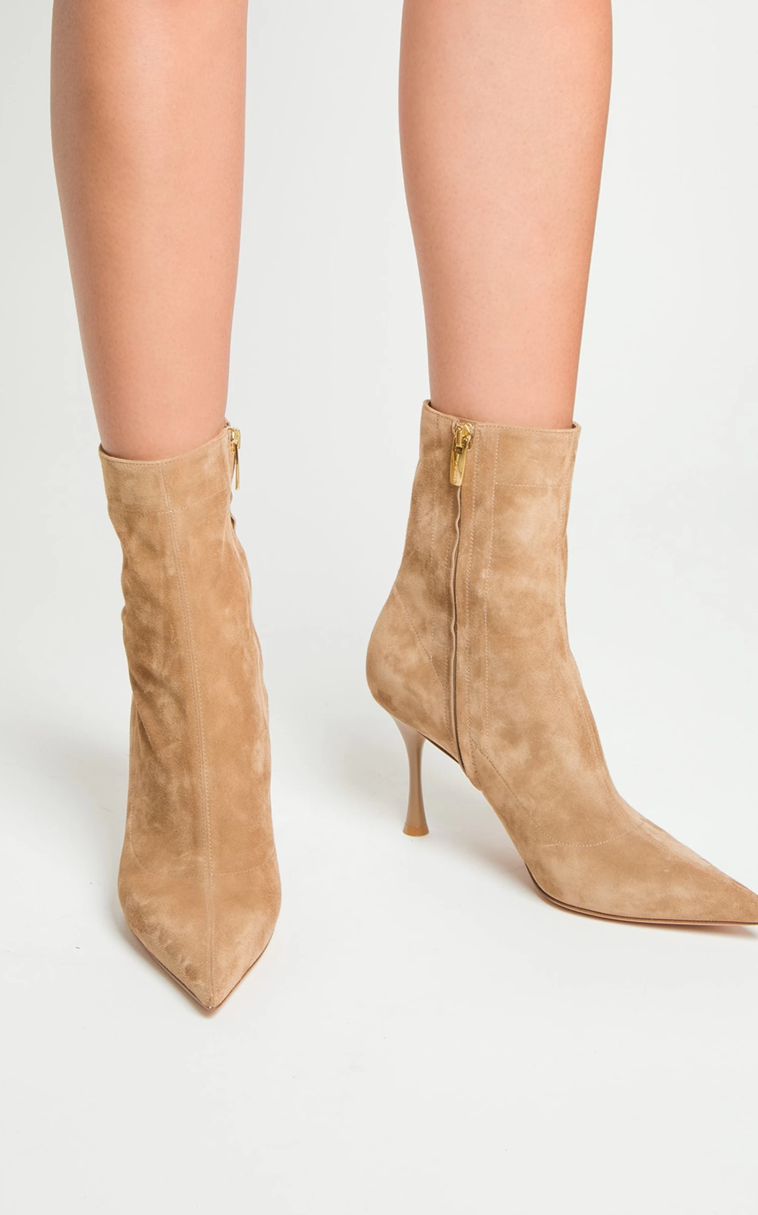 Handcrafted in Italy from buttery stretch-suede, the ‘Dunn’ boots have an ankle-length silhouette with elongating pointed toes and a stiletto heel. The camel shade complements any look, particularly those with a neutral color palette.