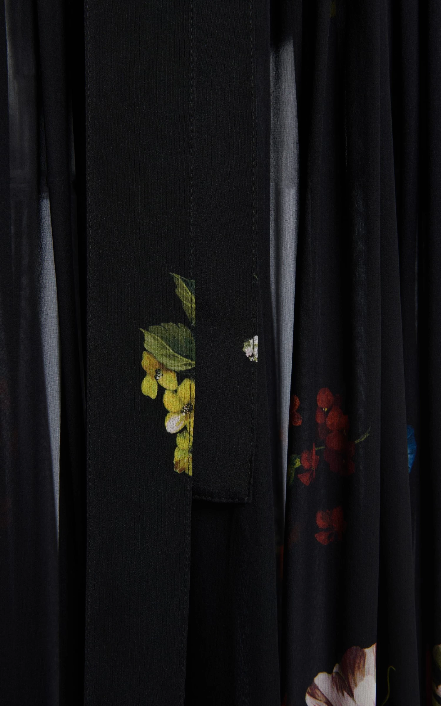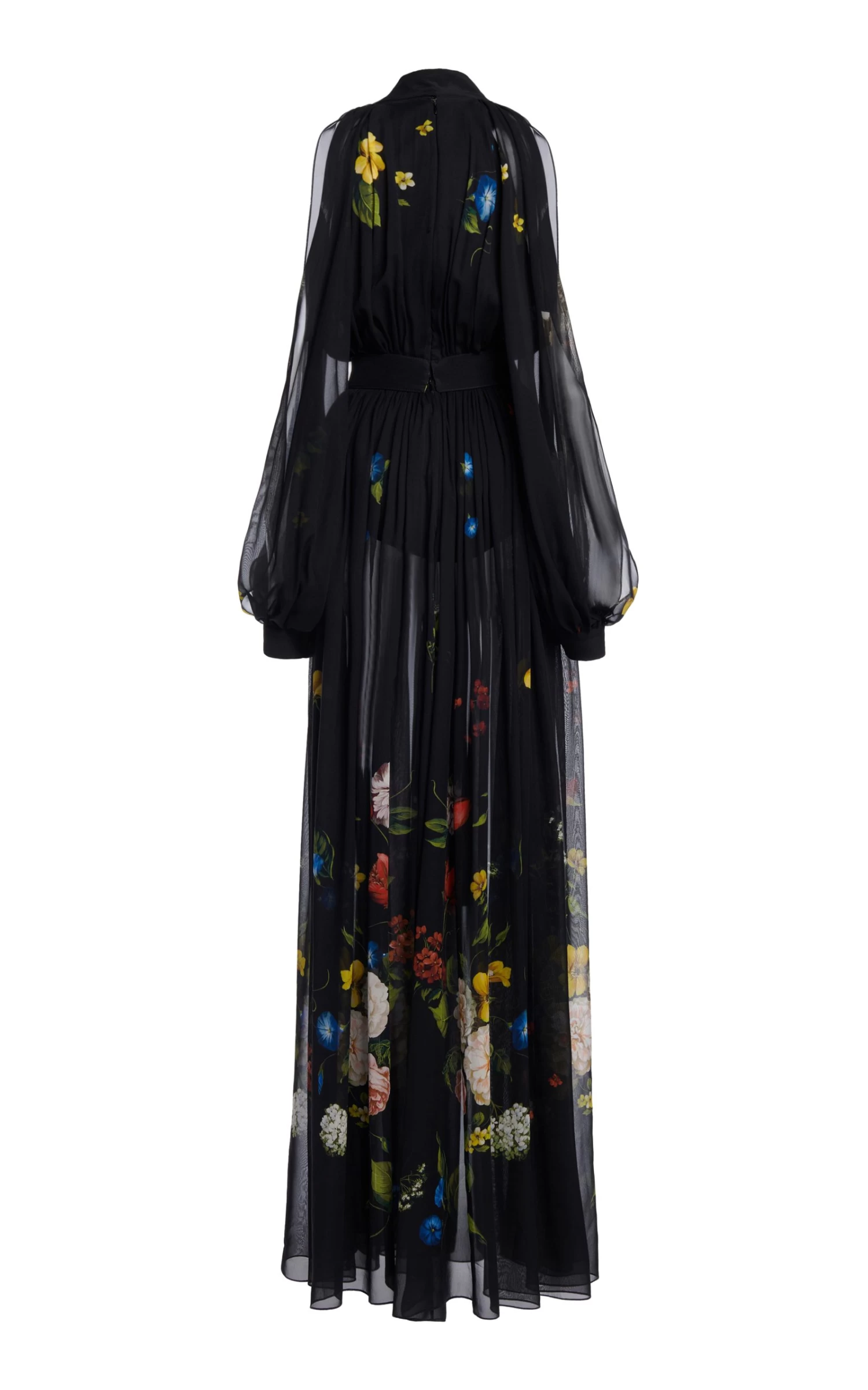 Made of airy silk chiffon, this maxi dress has a draped silhouette belted at the waist and detailed by billowy, cold-shoulder sleeves, a plunging V-neckline, and floral motifs throughout. Style yours with a sleek updo and tonal pumps for a fresh event look.