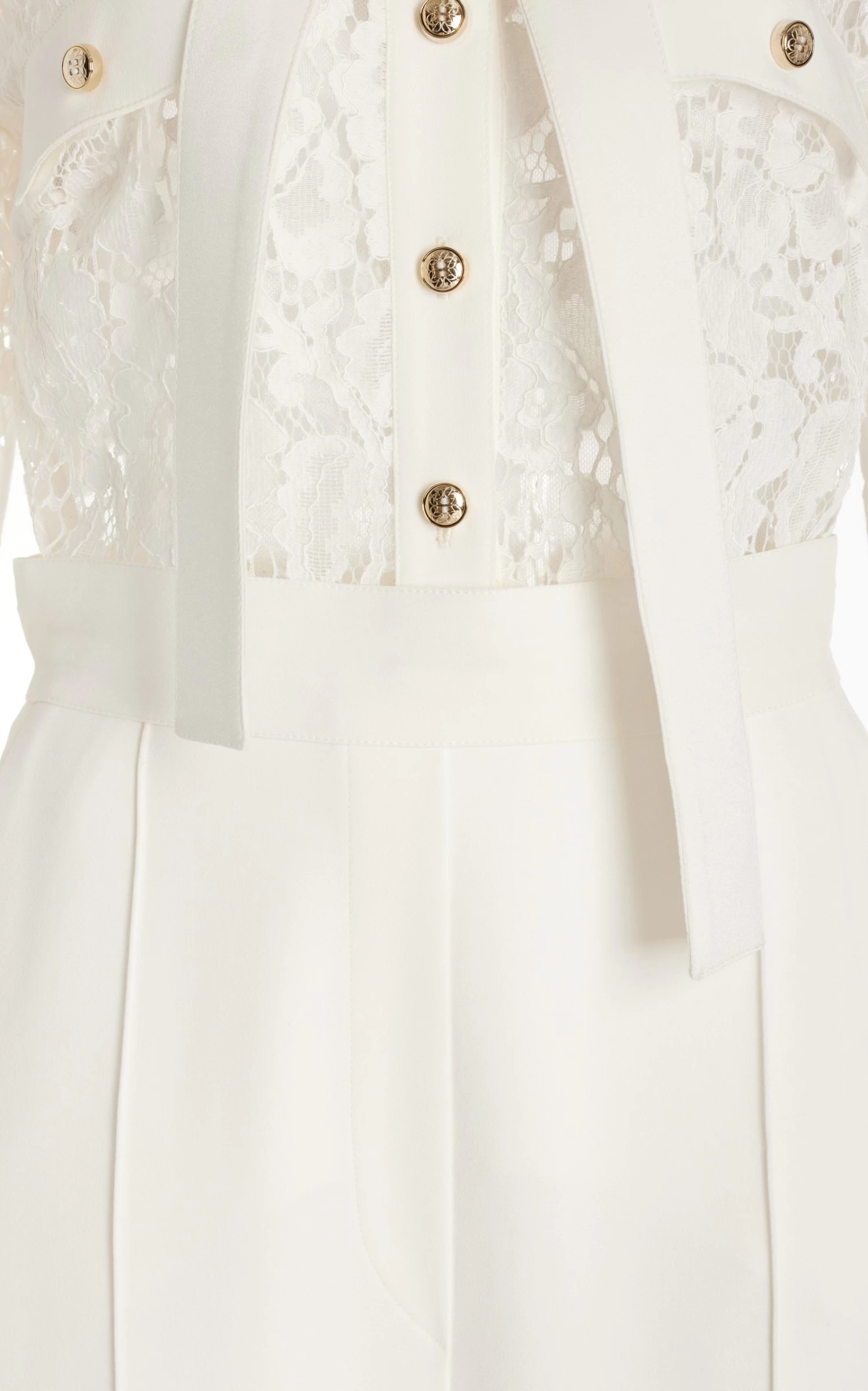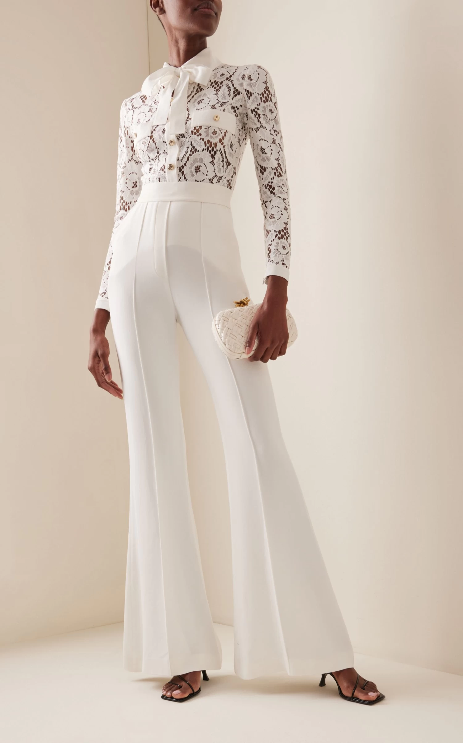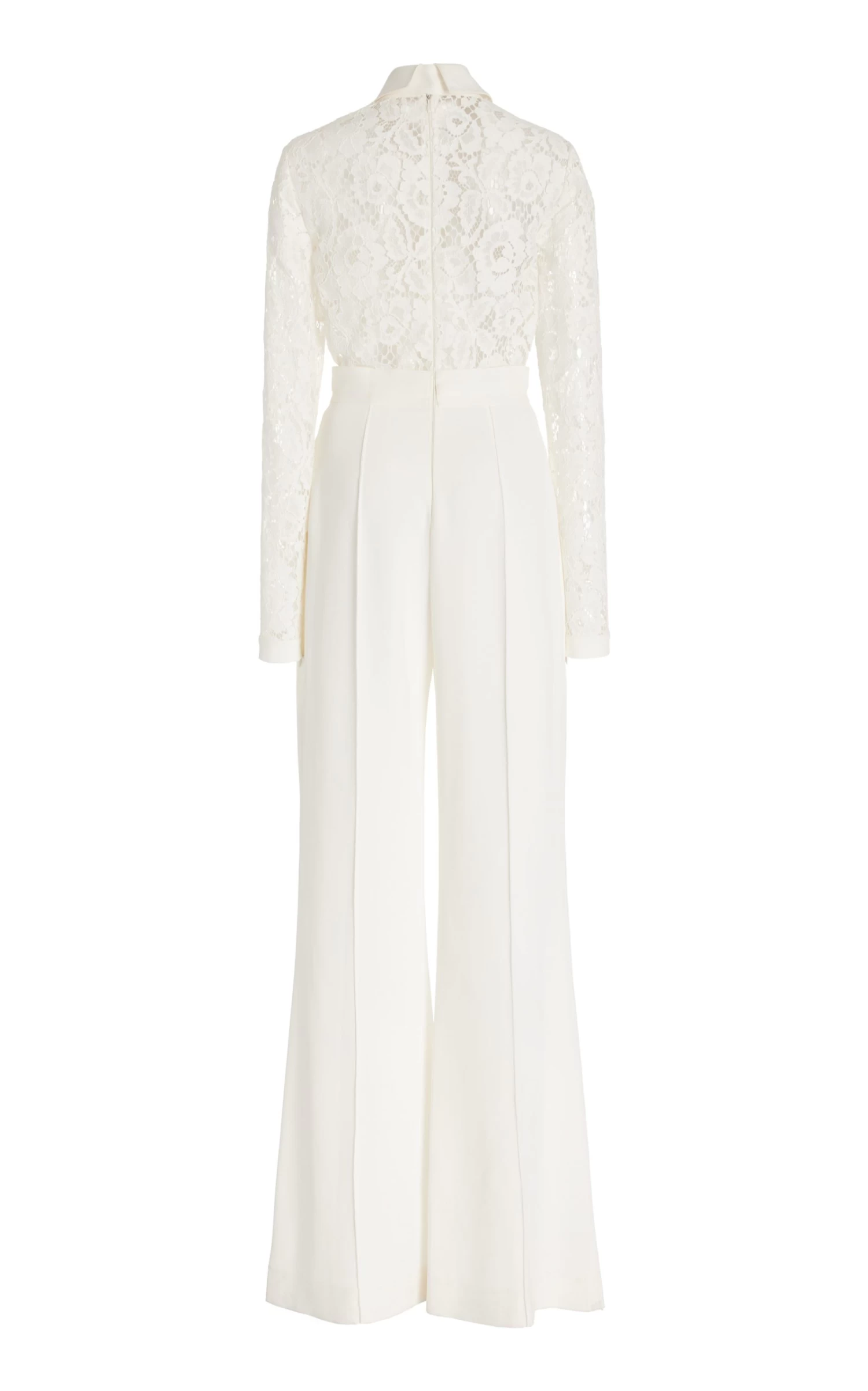 This slim jumpsuit has a collared lace top with crepe, wide leg pants. Style yours with platform sandals and pearl studs.