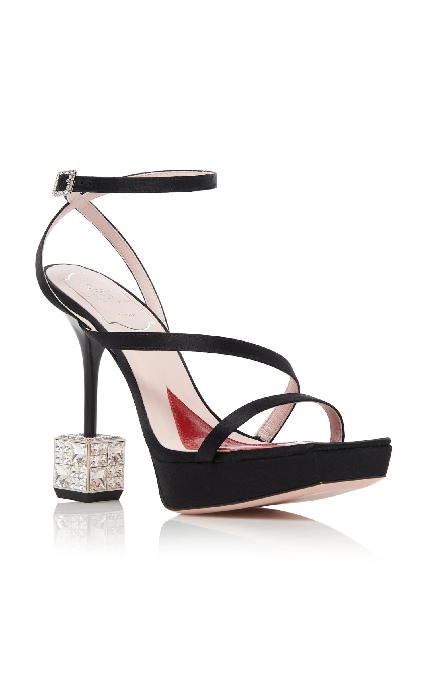 This platform heel has a strappy, sandal silhouette with a sleek, satin body supported by an embellished cube heel. Style with a satin midi skirt and silver accessories for an elevated day look.