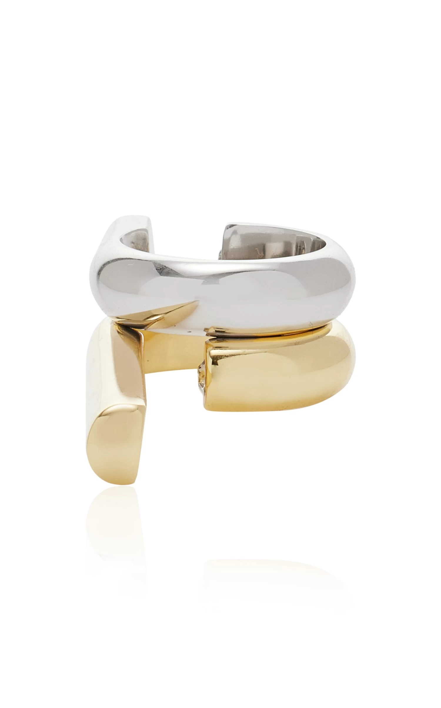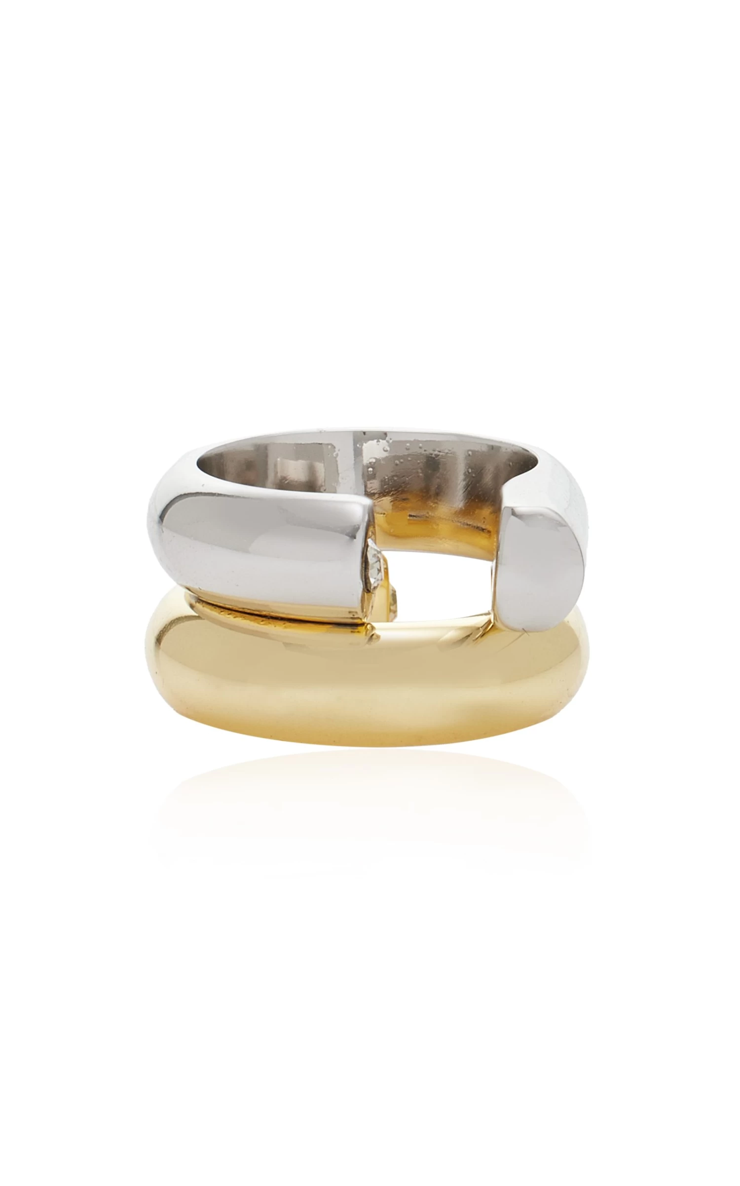 The ‘Esme Bypass’ ring has a two-tone architectural design cast from 12k gold-plated brass and silver-plated stainless steel. The waterproof finish ensures it lasts through light wash and wear.