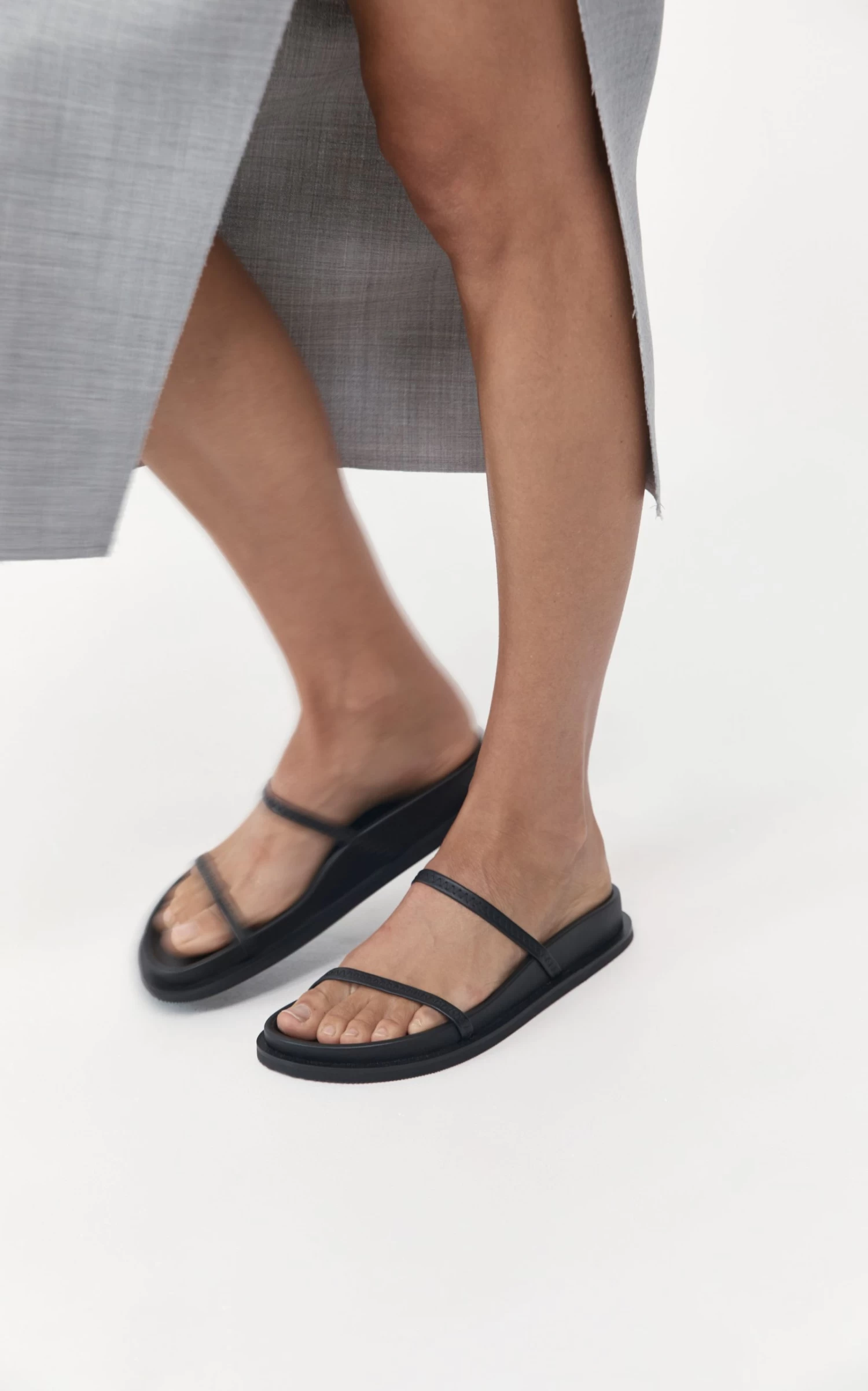 - Slide sandal silhouette, leather body, thin toe straps, rounded toe