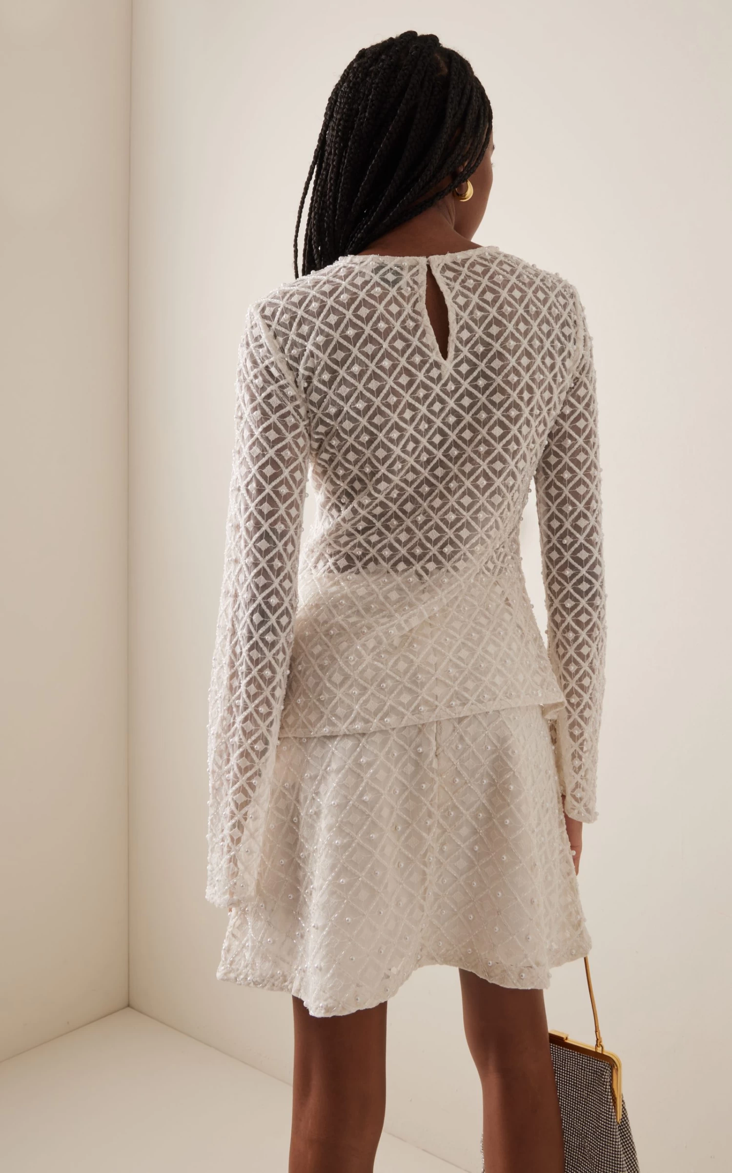 The ‘Freya’ top is fitted with long, flare sleeves and a feminine-cut silhouette, finished with crystal and pearl embellishments throughout. Treat yourself to a dazzling set and pair with the matching mini skirt.