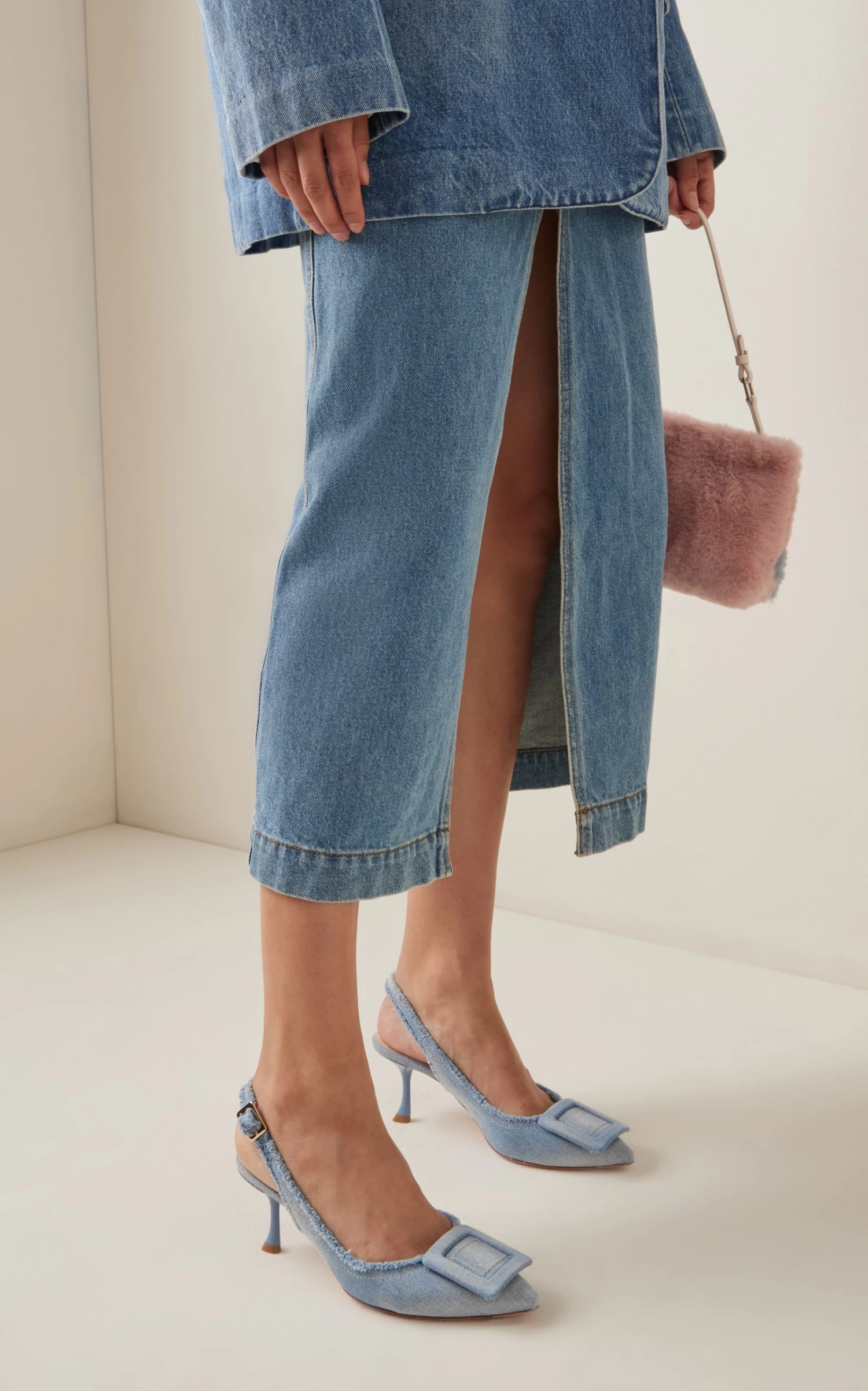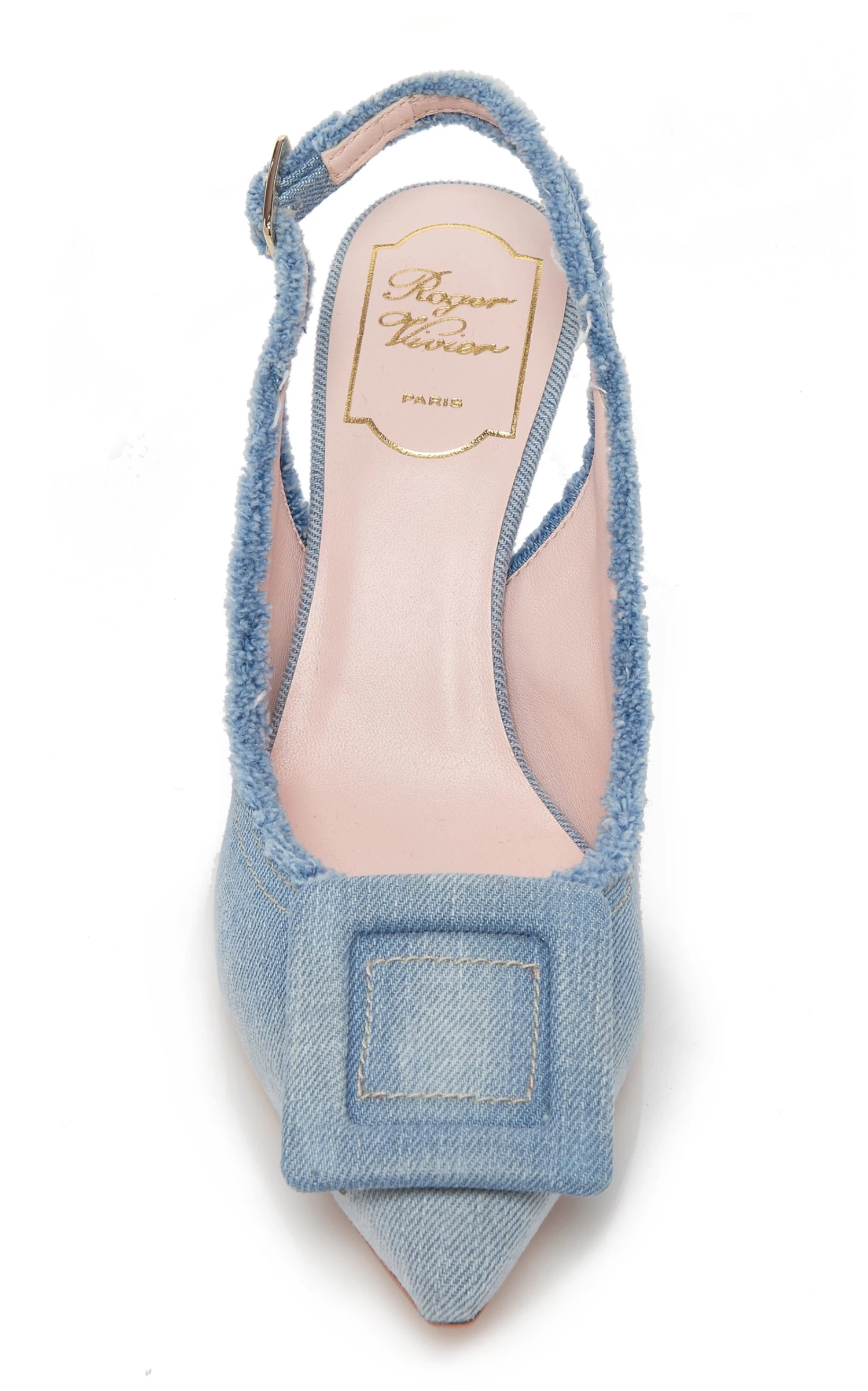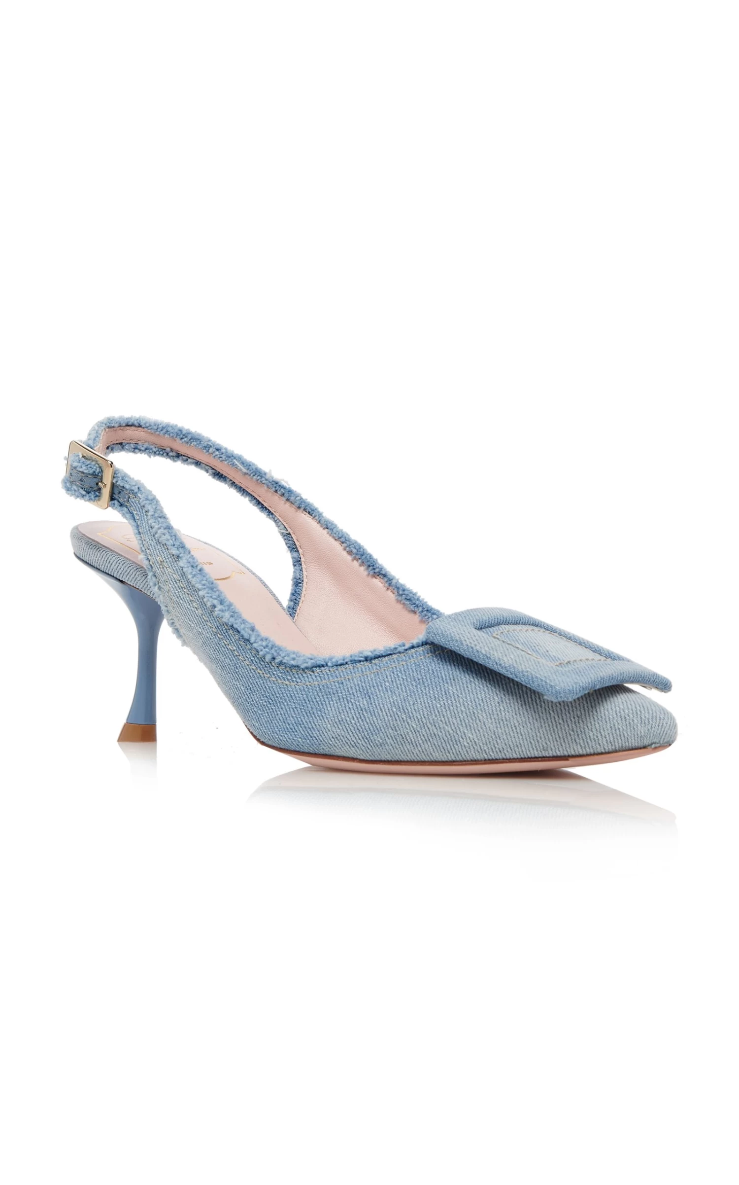 These slingback pumps have a frayed denim body supported by a low, tapered heel and feature a tonal buckle detail attached to its pointed toe. Style with more denim for a cool, co-ordinating look.
