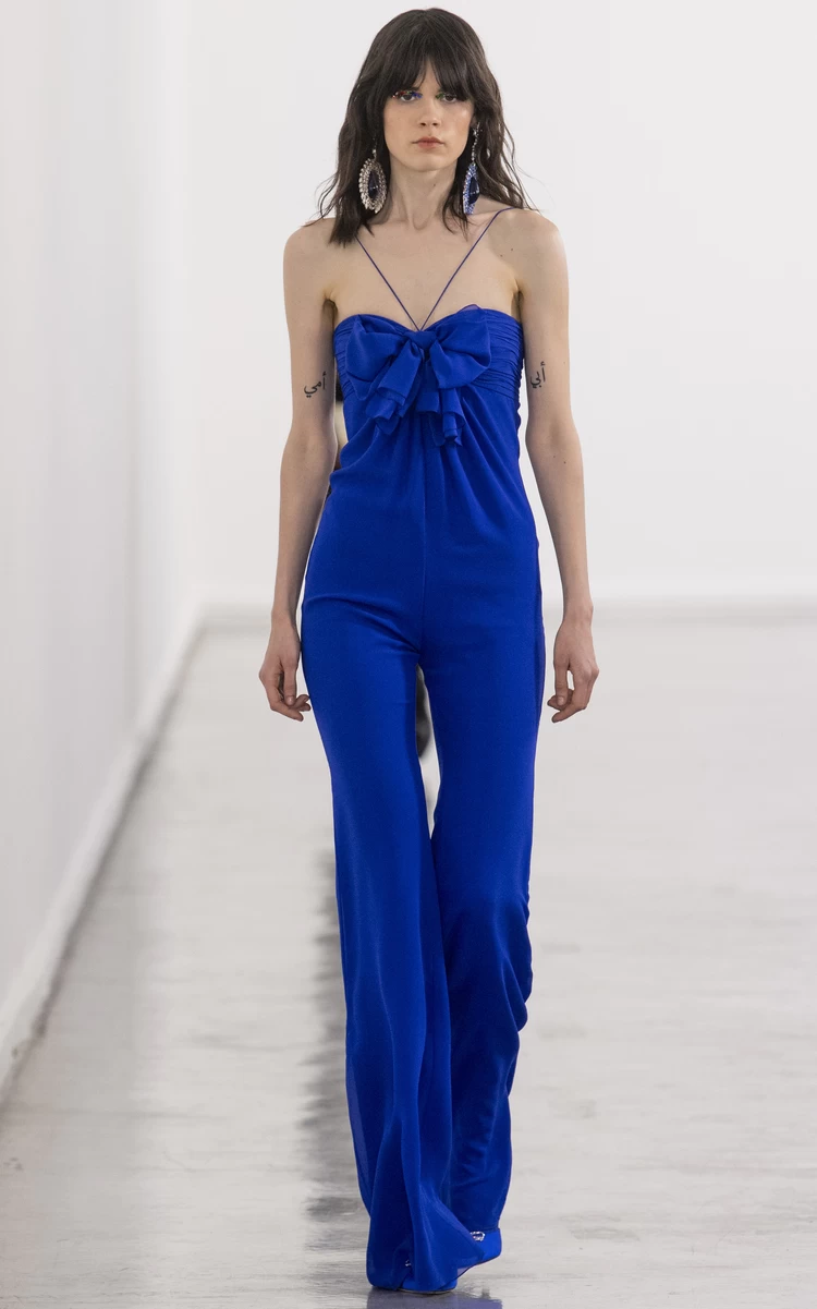 Sleek and slim-fitting, this jumpsuit has a halter neck, wide-leg silhouette detailed with a ruffled bow along the bust. Try yours with a pair of statement hoops and a jeweled clutch for an evening out.