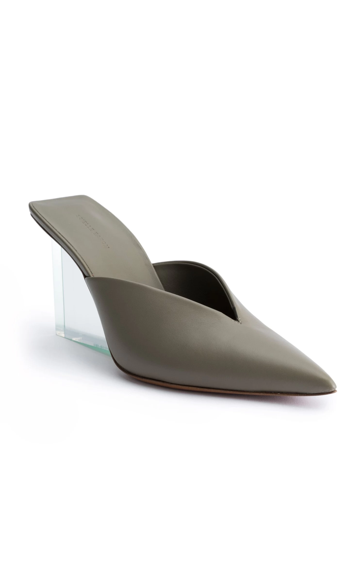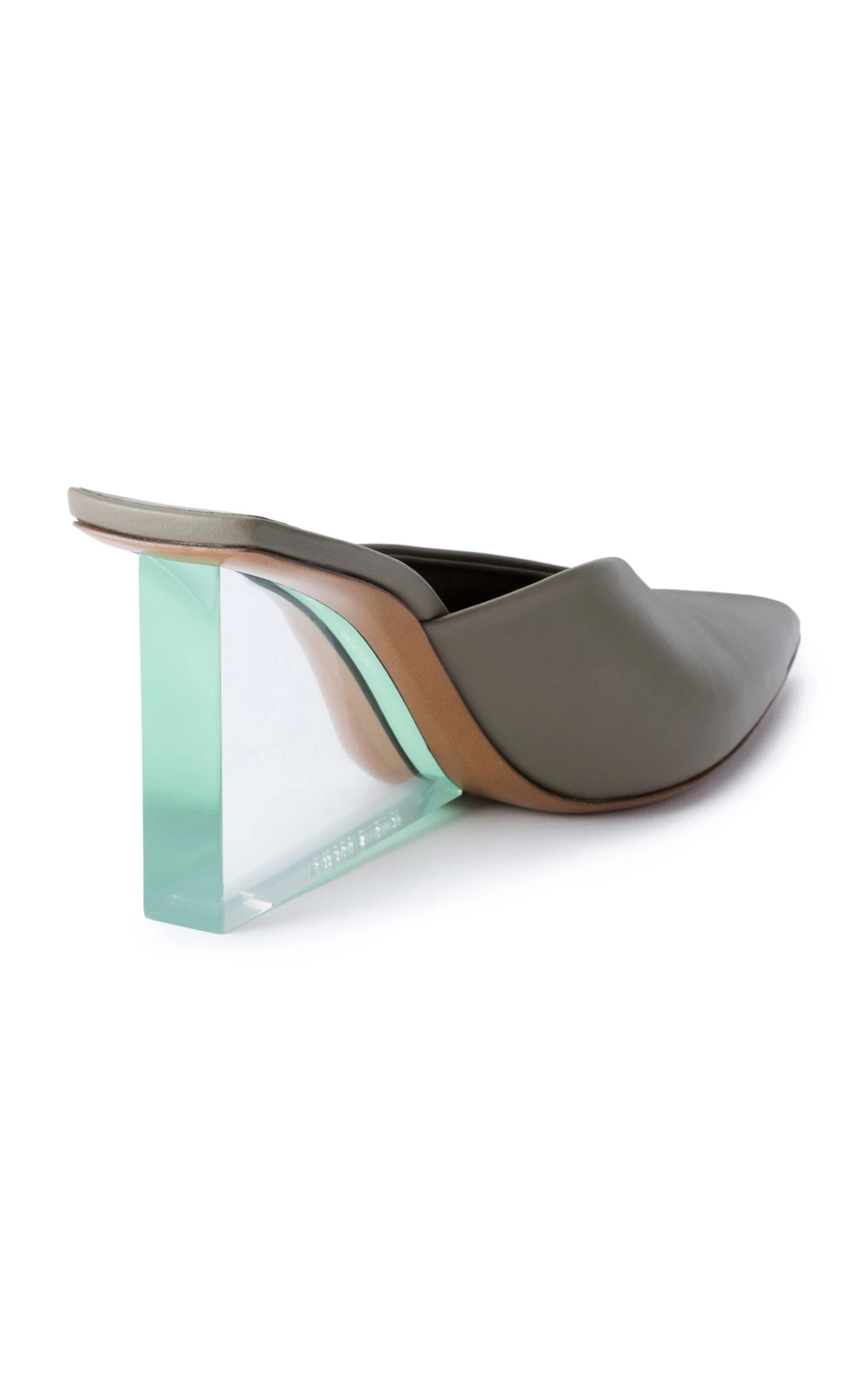 Made from smooth calfskin leather, the ‘Glass Works’ mule features a sleek glass lucite heel that strikes a hyper-cool, barely there minimalism.
