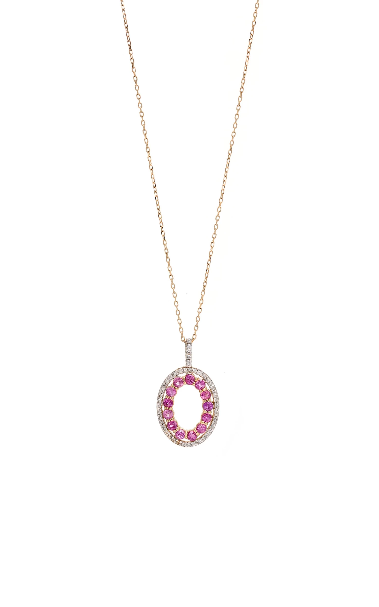 Strung with a halo-shaped pendant, Mateo’s necklace hangs from a delicate 18” chain. It’s made in a dainty gold setting that’s encrusted with tonal pink sapphires. Layer it with the collection’s matching tennis style.