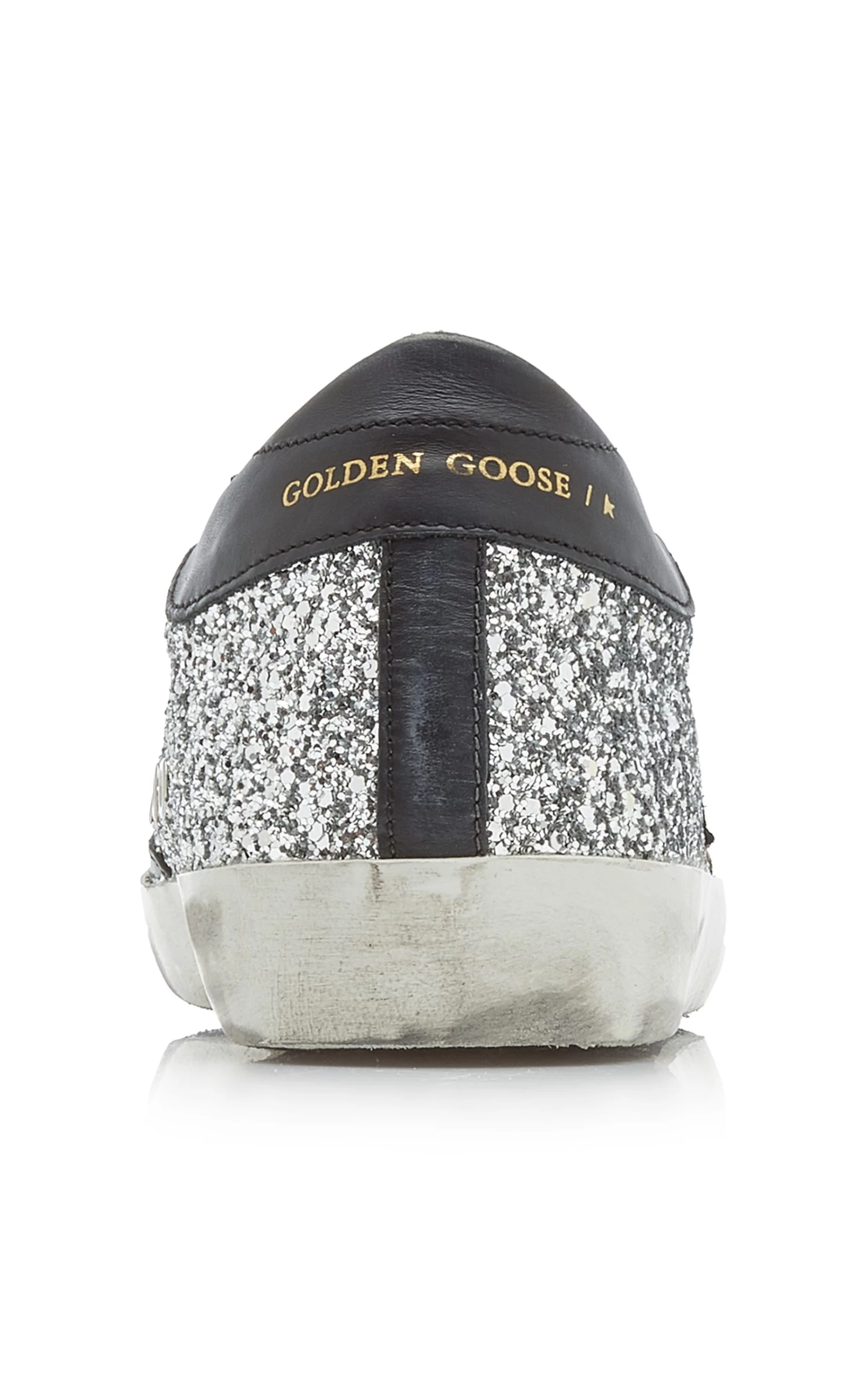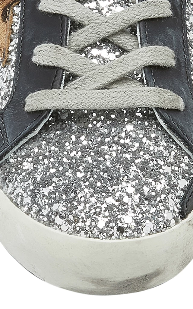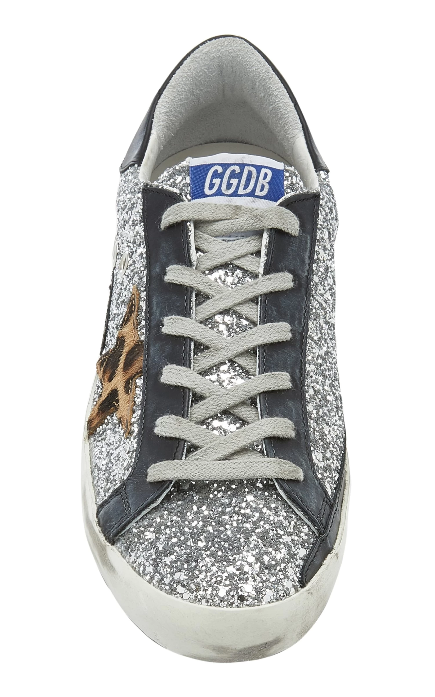 Golden Goose’s distressed low-top sneakers embrace maximalism this season and an allover glitter embellishment and leopard print motif. Featuring the label’s trademark star adornment, these popular shoes can be worn with both office attire and casual weekend separates.