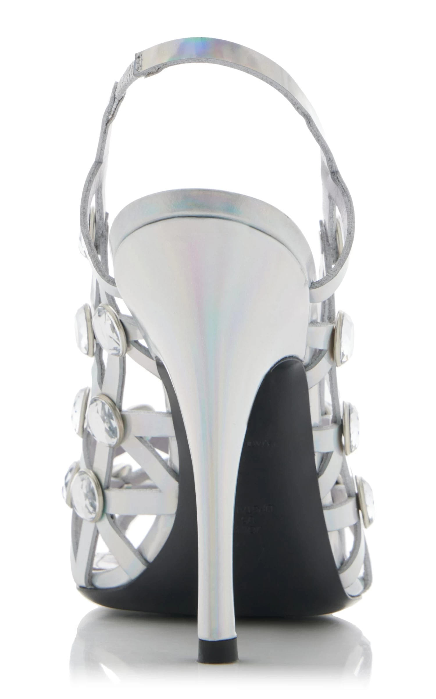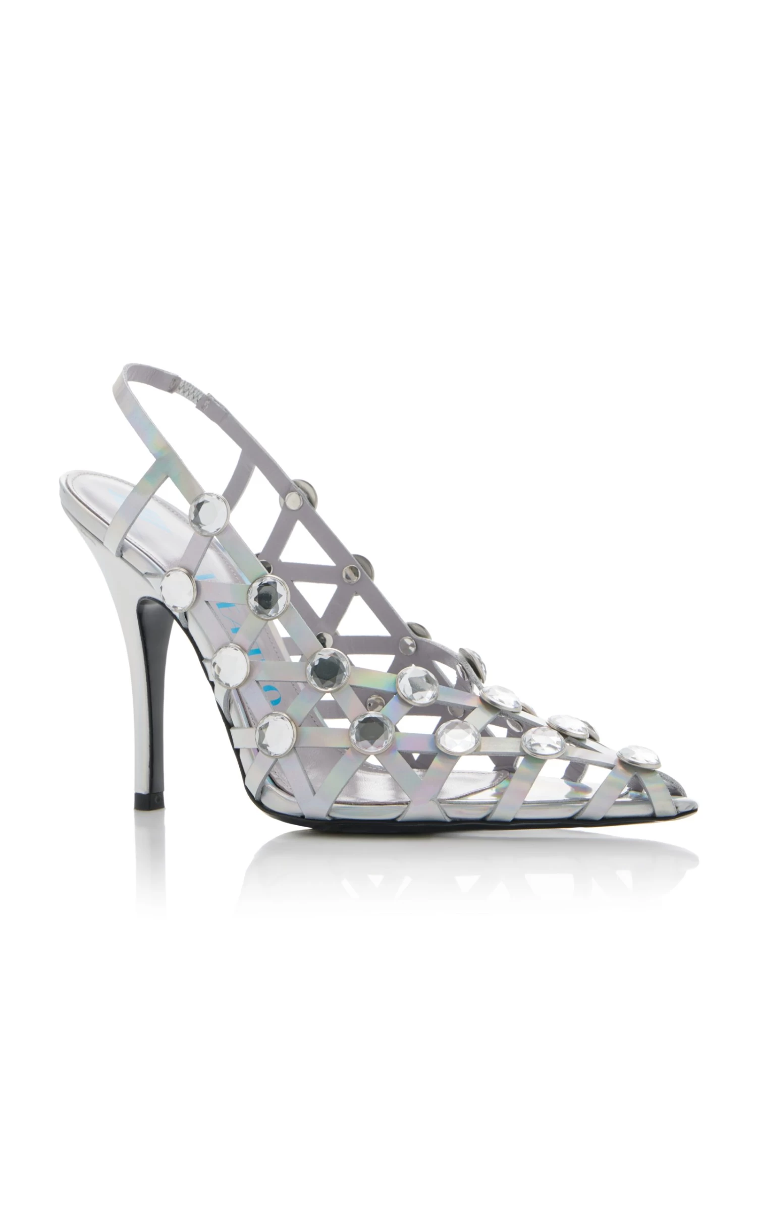The ‘Grid’ pumps have a multi-tone glisten amongst its slingback, mid-heel silhouette and geometric, cage body. Show yours off with mini hemlines.