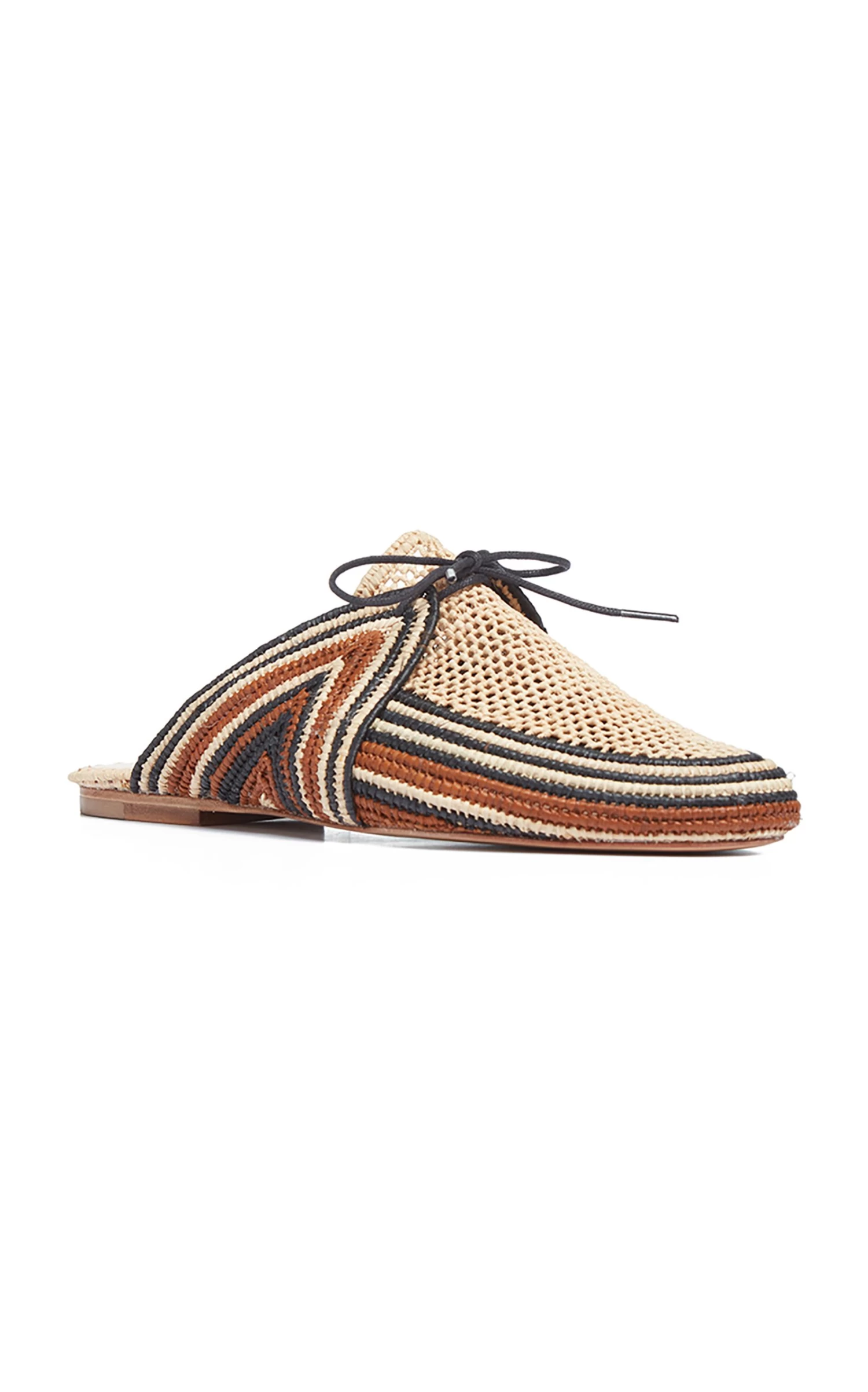 - Slide mule silhouette, loafer inspired design, woven raffia body, rounded toe