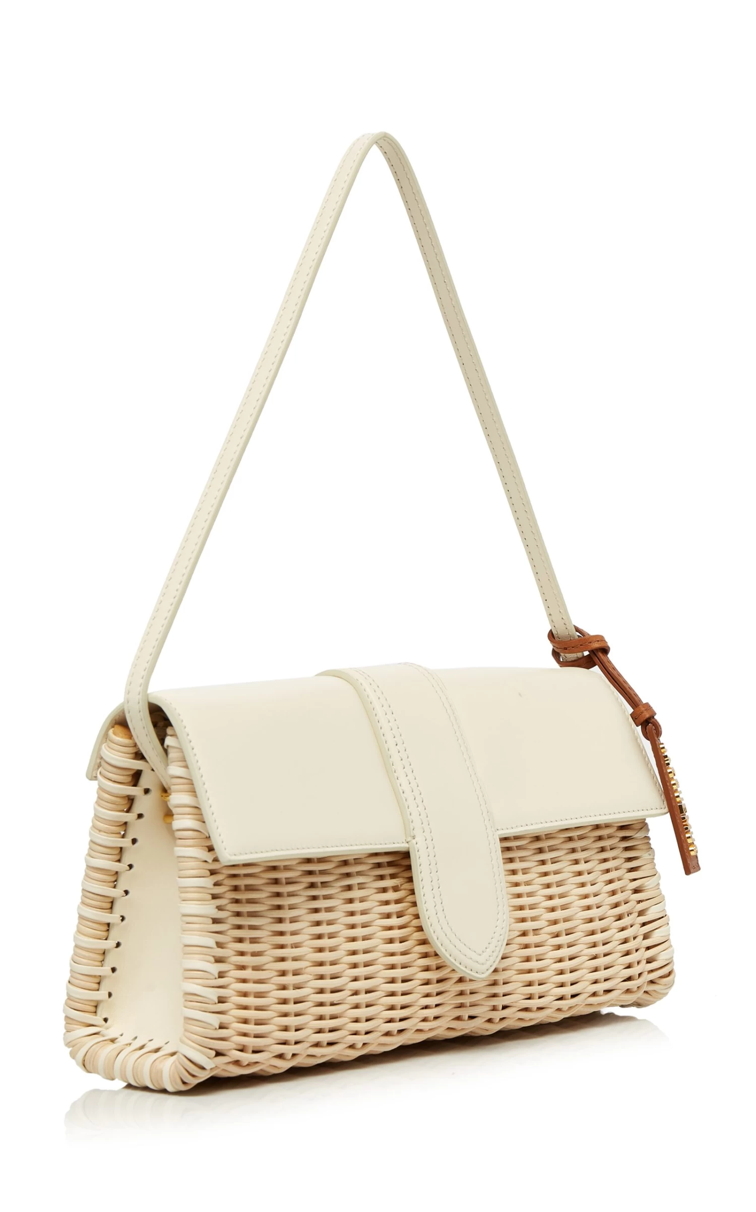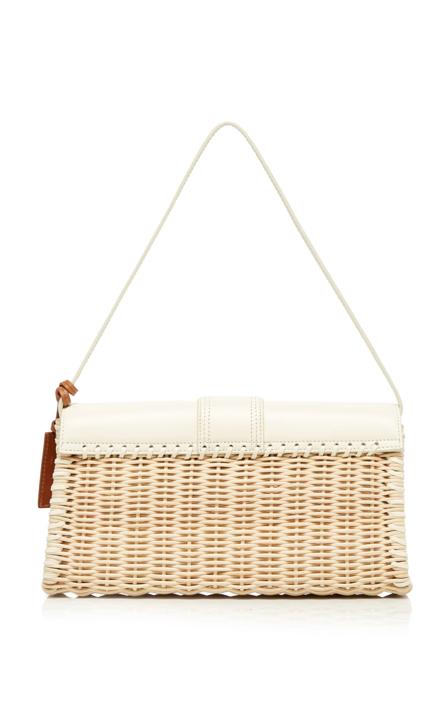 ‘Le Bambino’ is the latest ‘It’ bag from Jacquemus — the master of ‘It’ bags. This longer iteration is made from rattan into a structured box silhouette with a leather flap top.