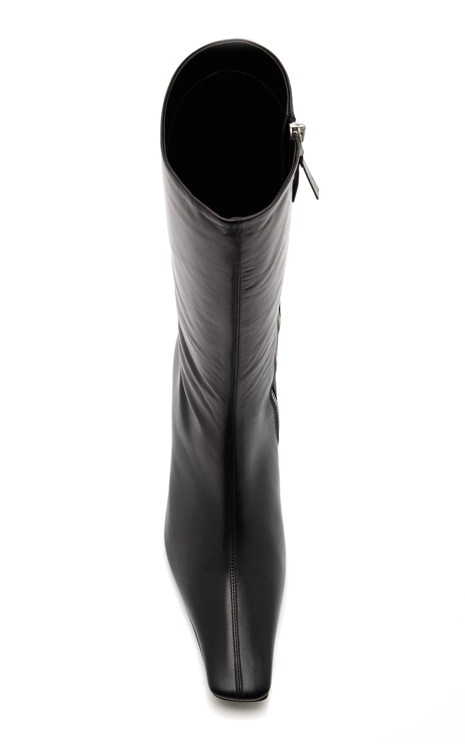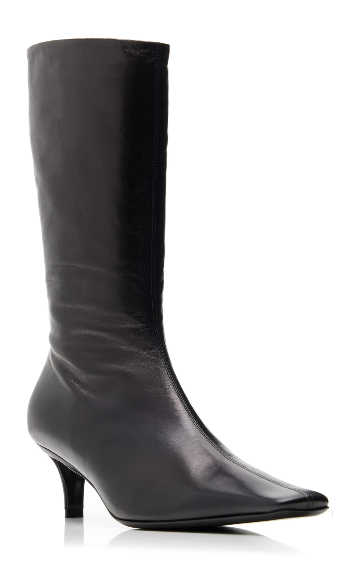 These ankle boots have a foot-hugging design made from smooth goatskin with elongated square toes that lengthen your frame. The midi heel makes them comfortable enough for all day wear.