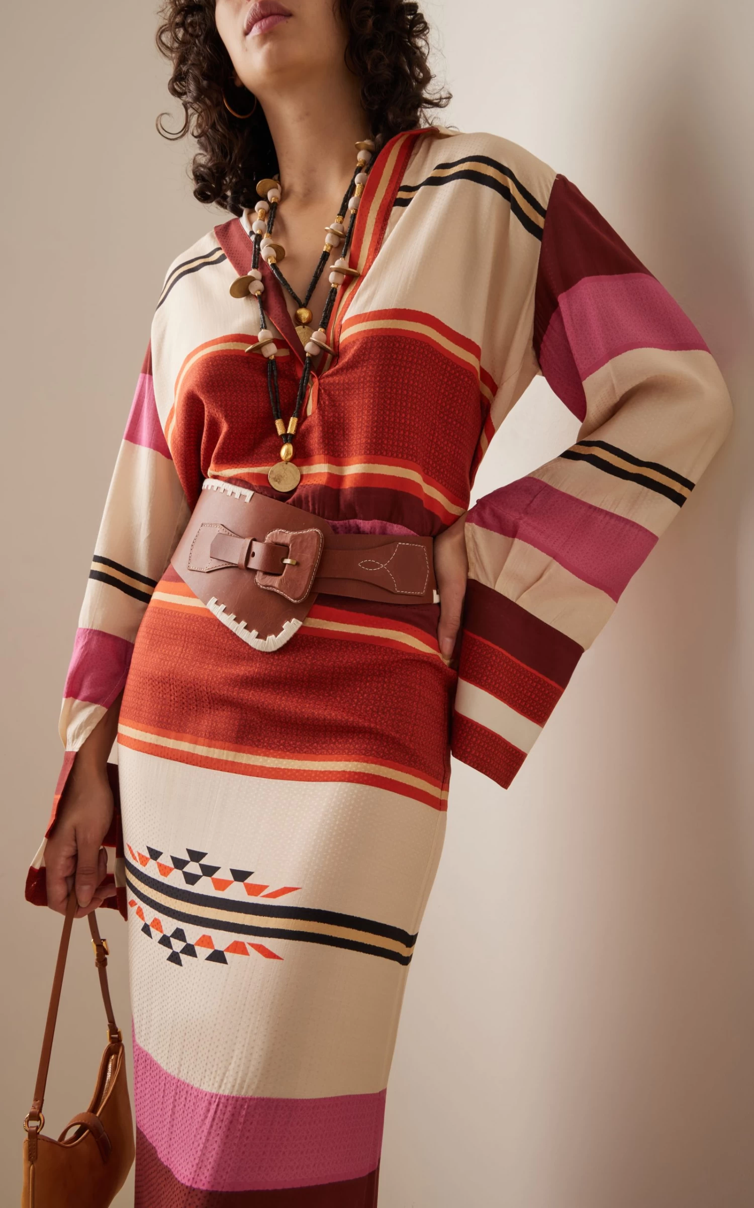 Made of genuine leather and cotton detailing, the ‘Lenguas Perdidas’ belt features a wide-waist, asymmetric silhouette, tonal bubble buckle, and cream-colored contrast stitching. Style yours with a maxi dress from the brand for a chic day look.