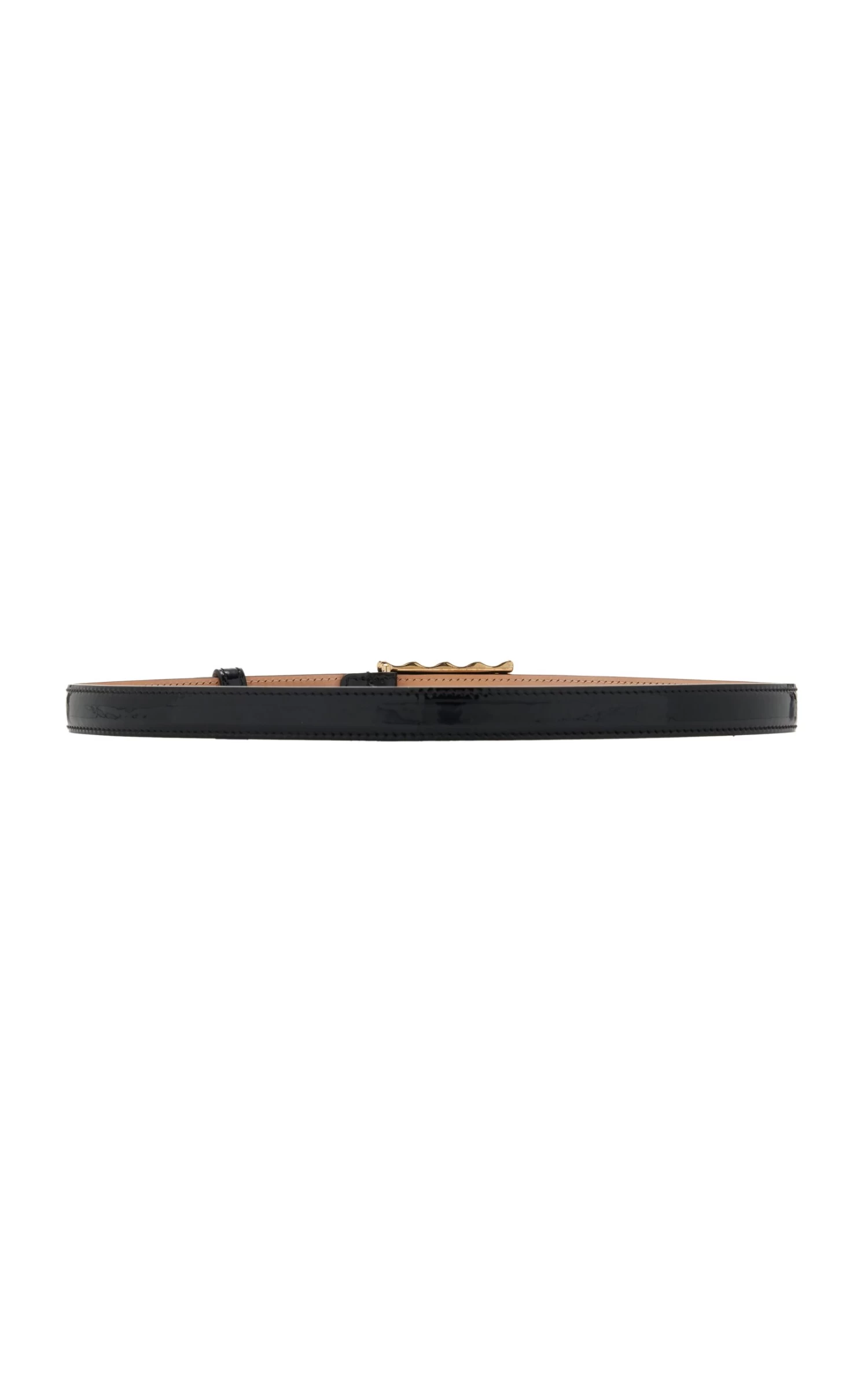 Made from patent calfskin leather, this skinny waist belt has an oversized gold-tone buckle. Show off yours with high-waisted jeans.