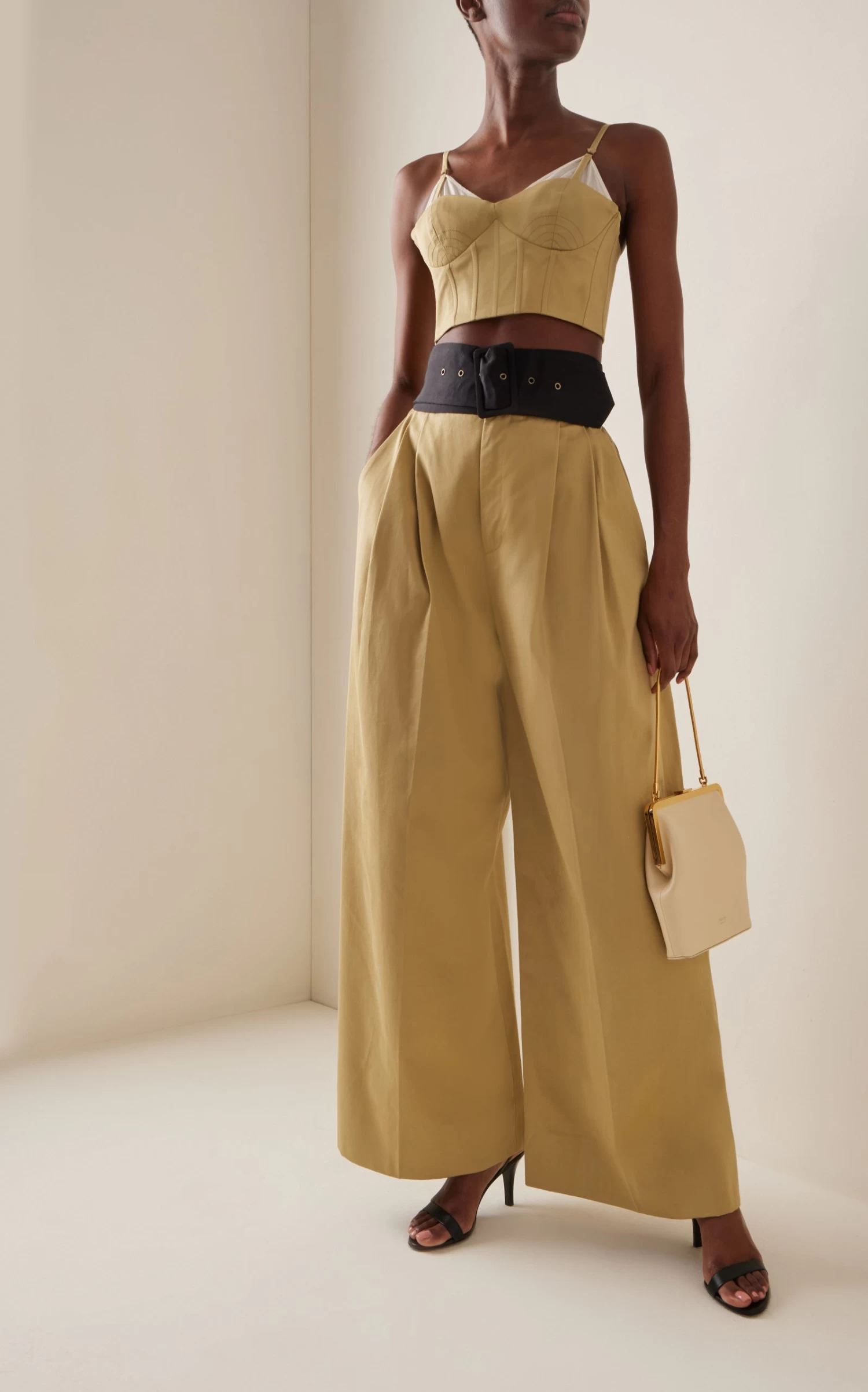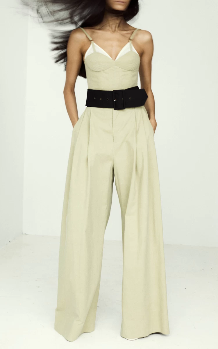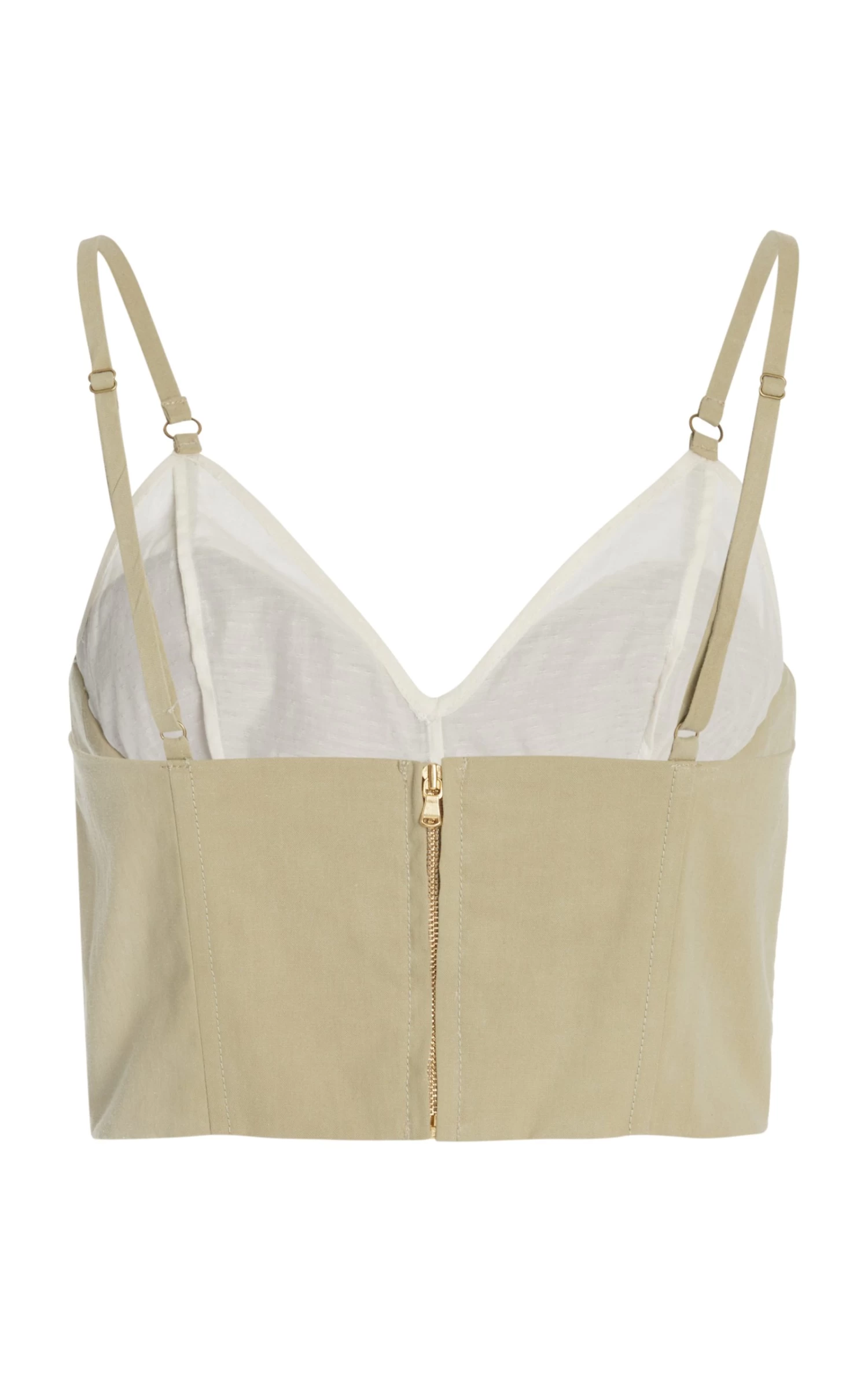 Crafted from a cotton blend, this cropped bralette top features a fitted silhouette, spaghetti straps, bustier construction, and a sweetheart neckline with a layered detail. Emulate this season’s lookbook by pairing with the matching wide-leg pants for the perfect suiting set.