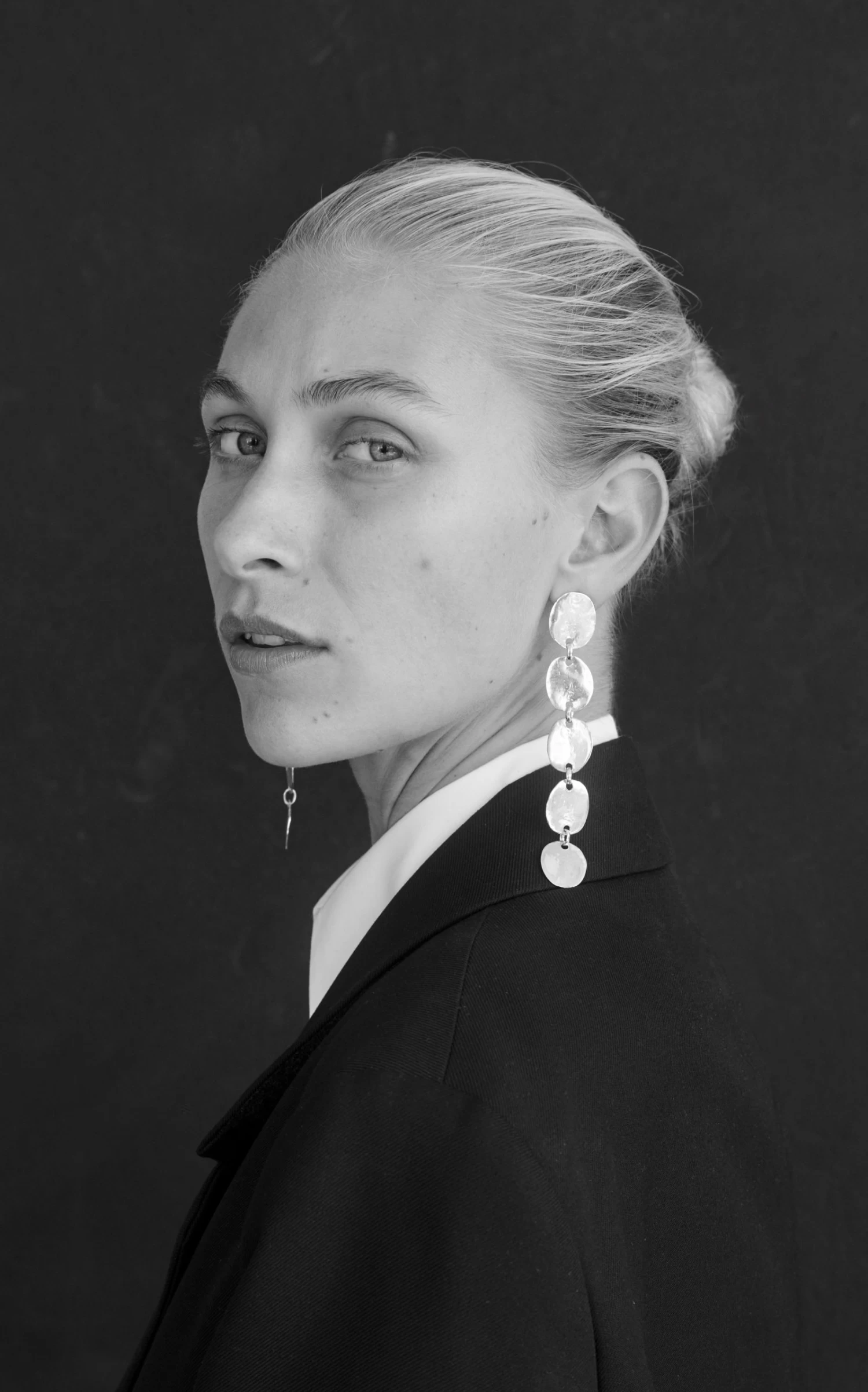 - Multi-drop silhouette, sterling silver body, sculptural circular post and drops, handmade in Copenhagen