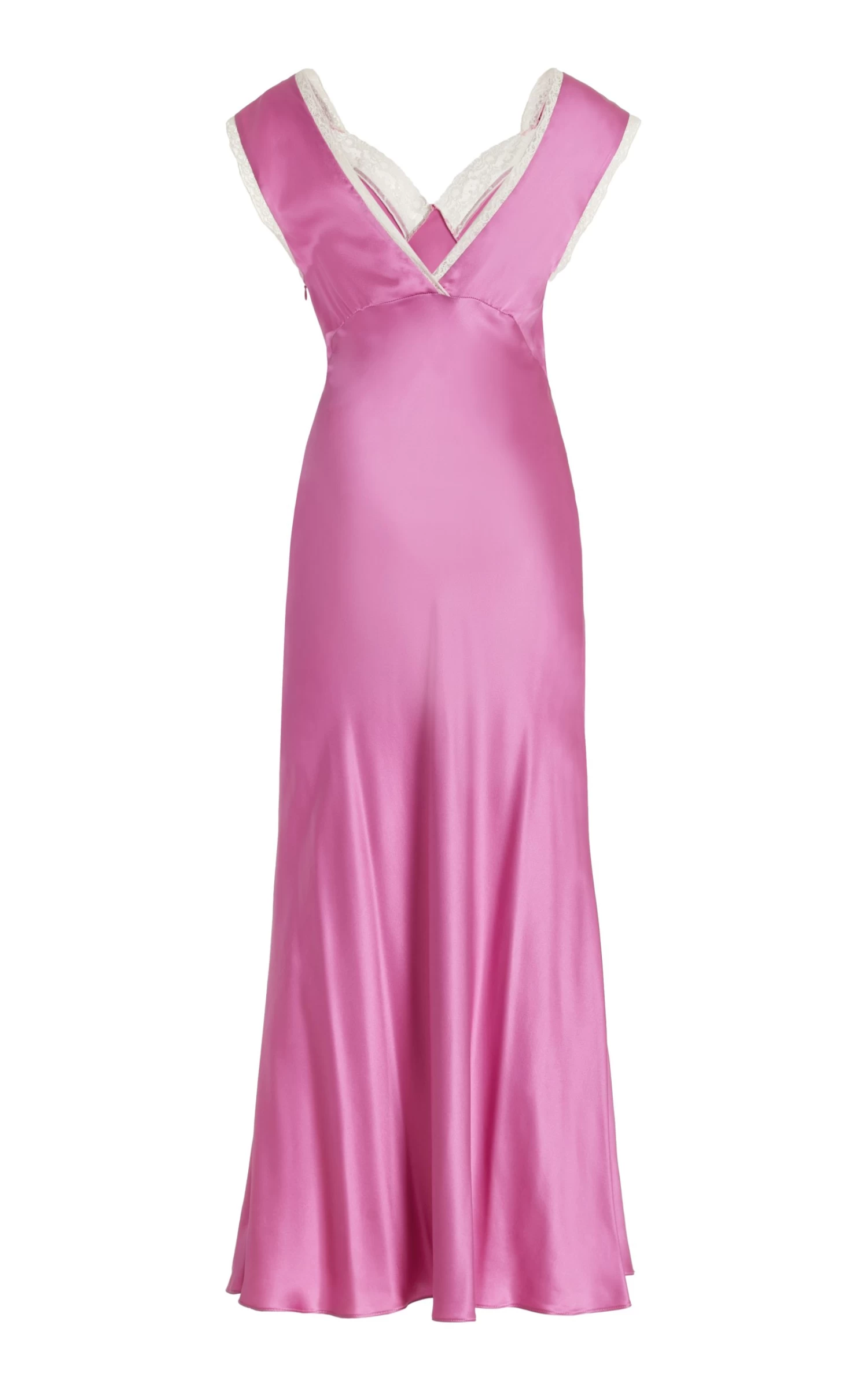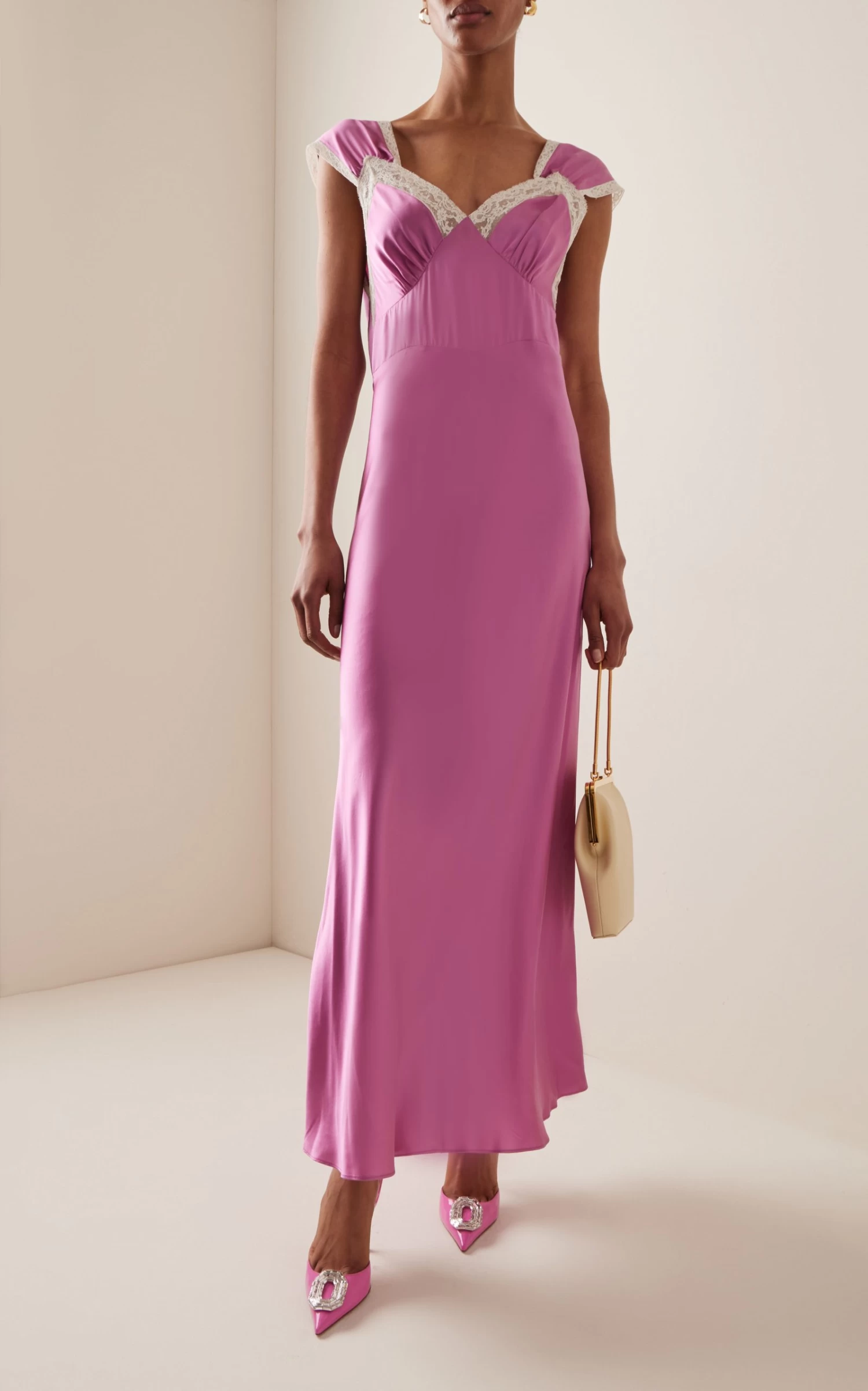 This silk slip midi dress features lace trim detailing along the V-neckline and wide shoulder straps. As featured in the Spring / Summer ’23 lookbook, upstyle the collection’s retro feel with 90’s-inspired kitten heels.