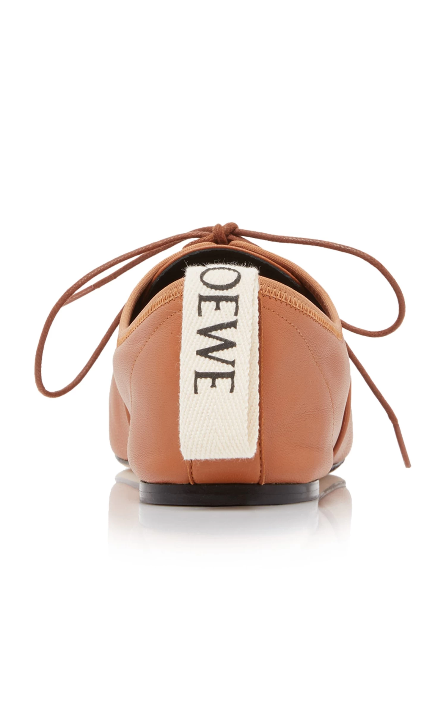Inspired by the silhouette of a ballerina shoe, Loewe’s flats are crafted from leather with a sleek squared toe. They’re designed in a neutral cognac hue strung with slender laces and finished with a logo-printed heel tab. Cuff the hem of your pants to reveal the ankle.